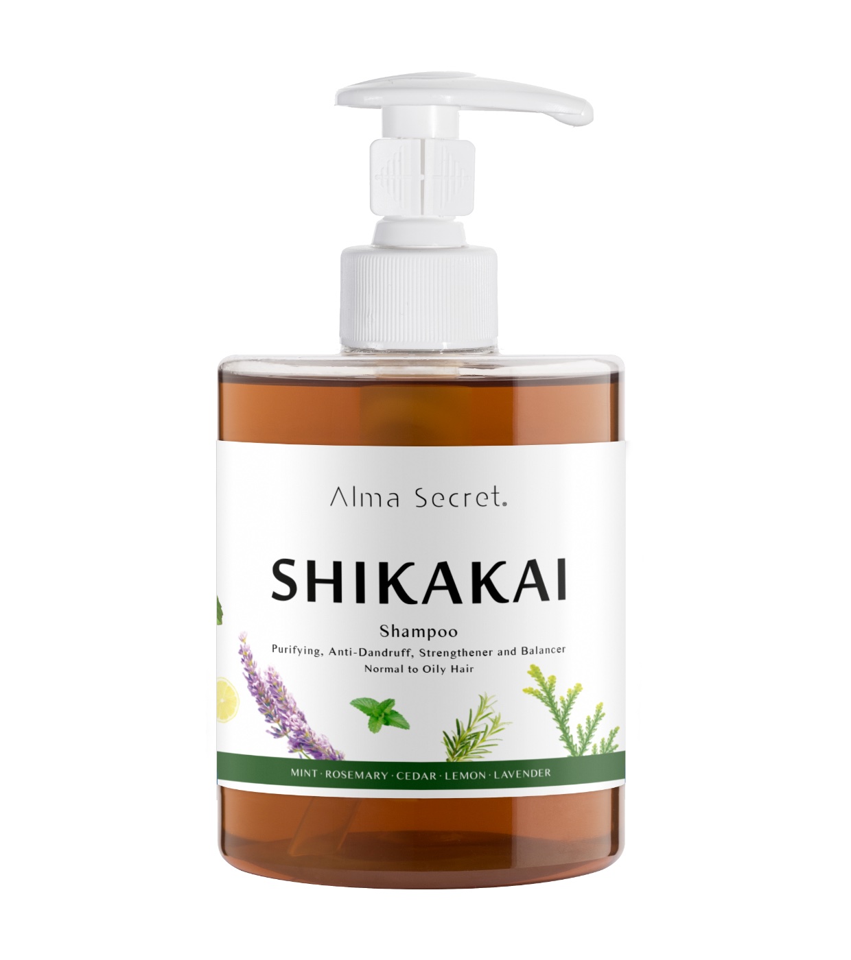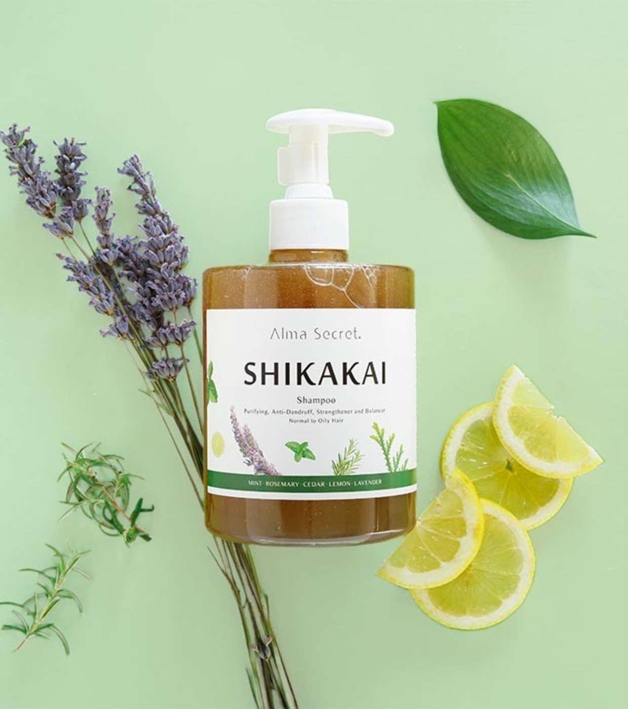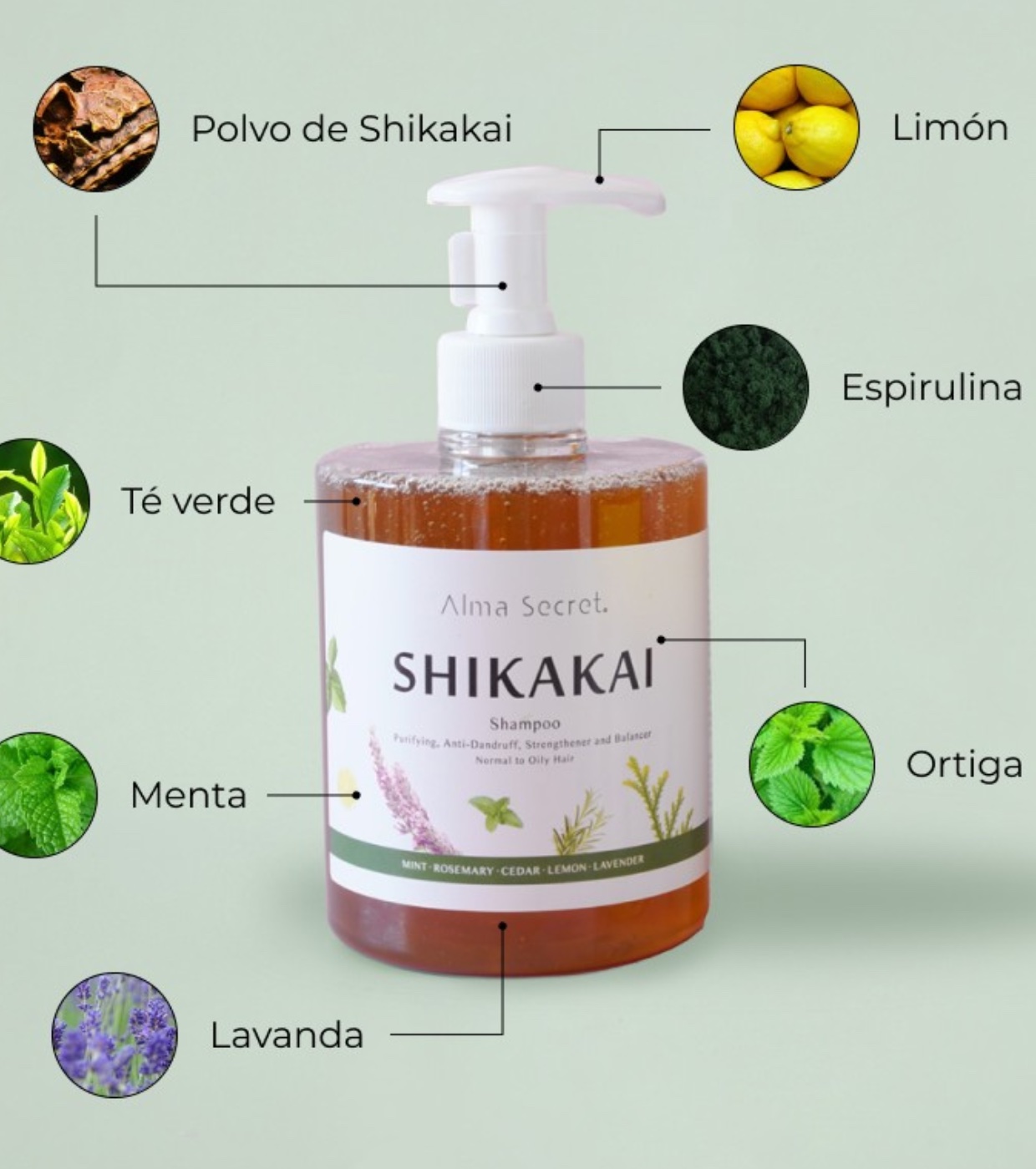 Shampoo Shikakai con ortica, spirulina, menta, rosmarino, cedro, limone e lavanda.