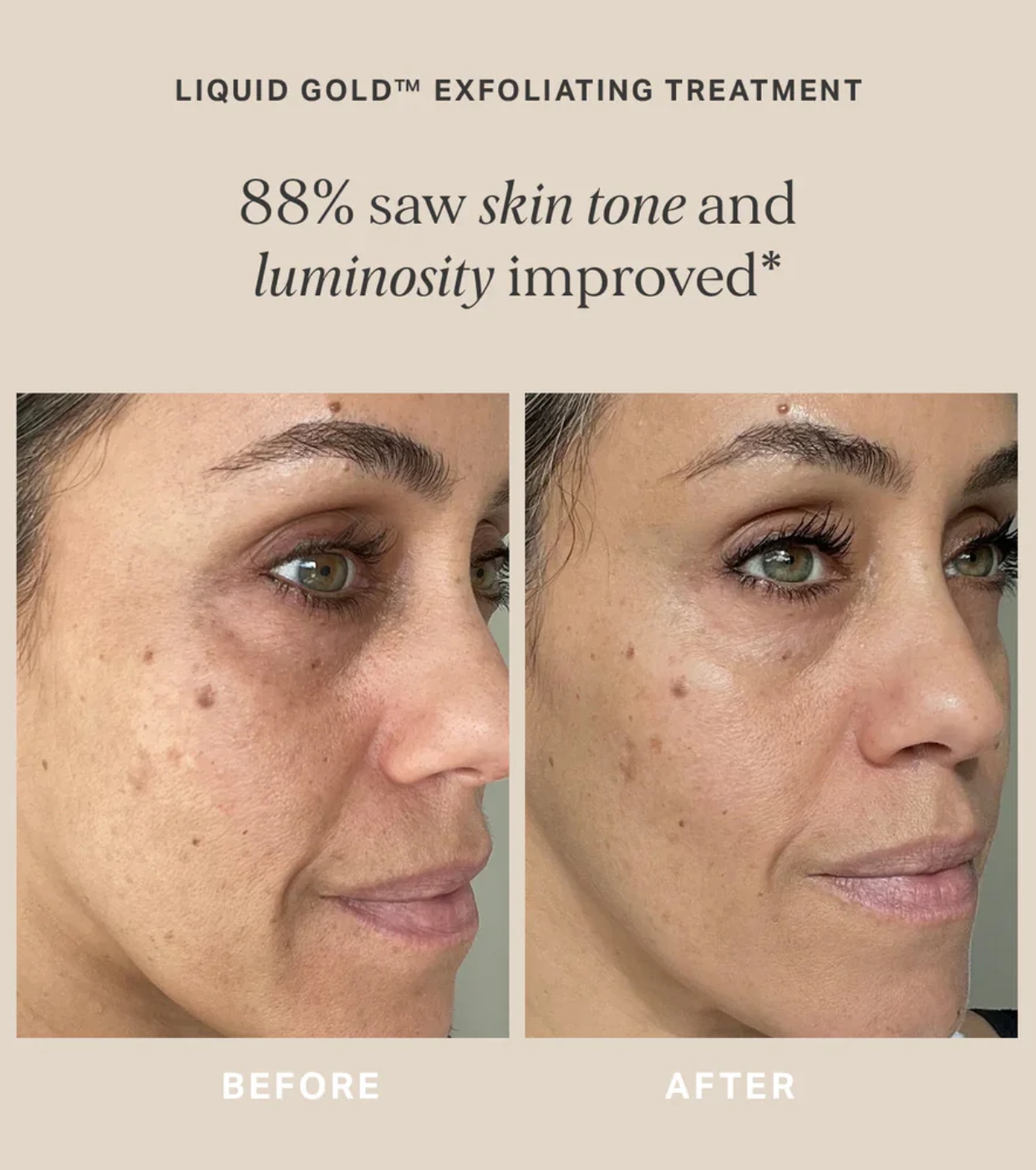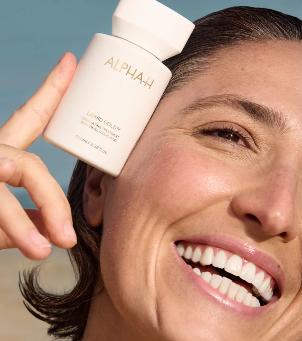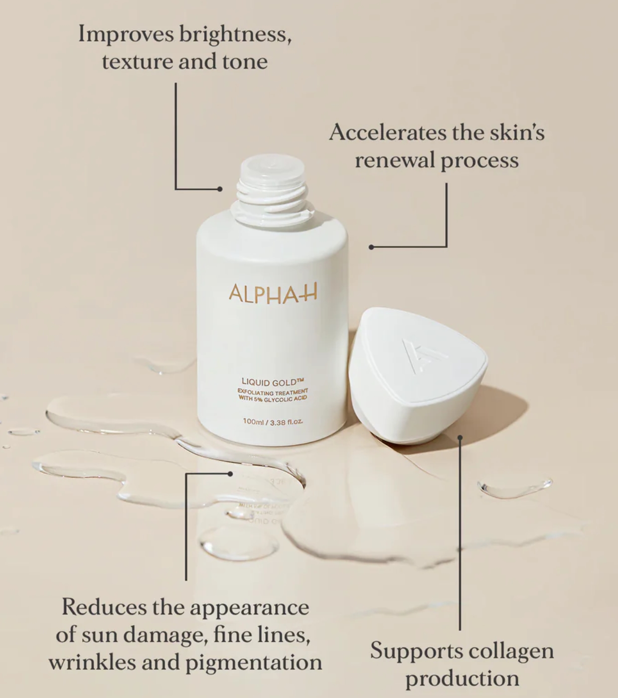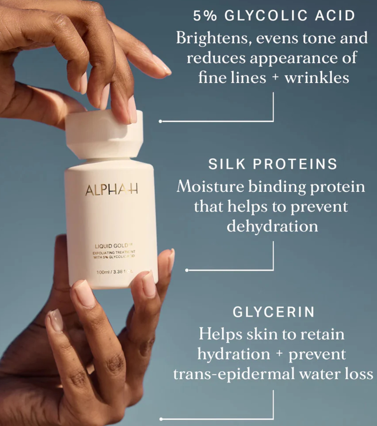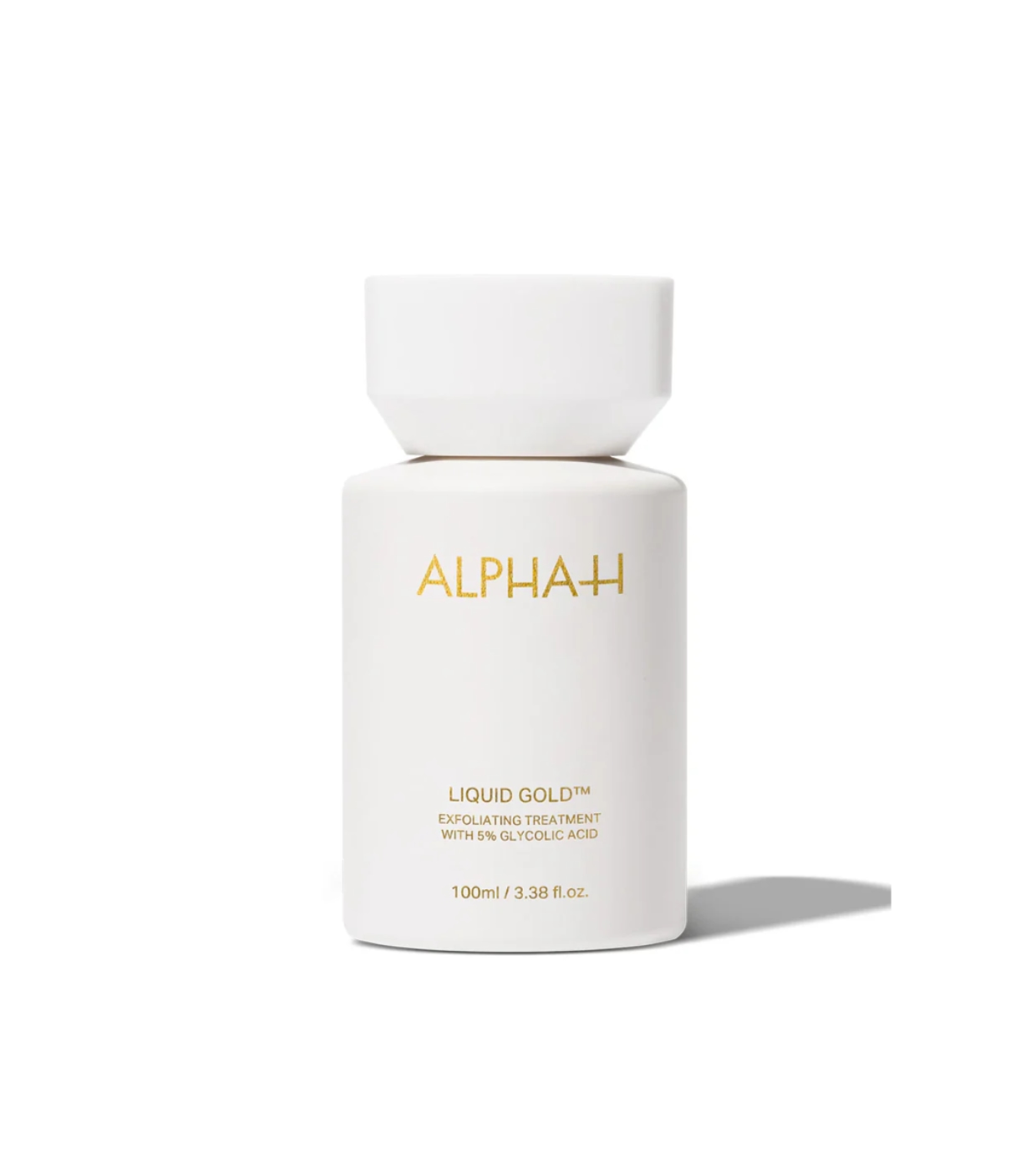 Liquid Gold di Alpha-H è un iconico trattamento esfoliante notturno formulato con acido glicolico (AHA) al 5% e un pH basso (2,8–3,0) che favorisce un'esfoliazione efficace e ad alta precisione.