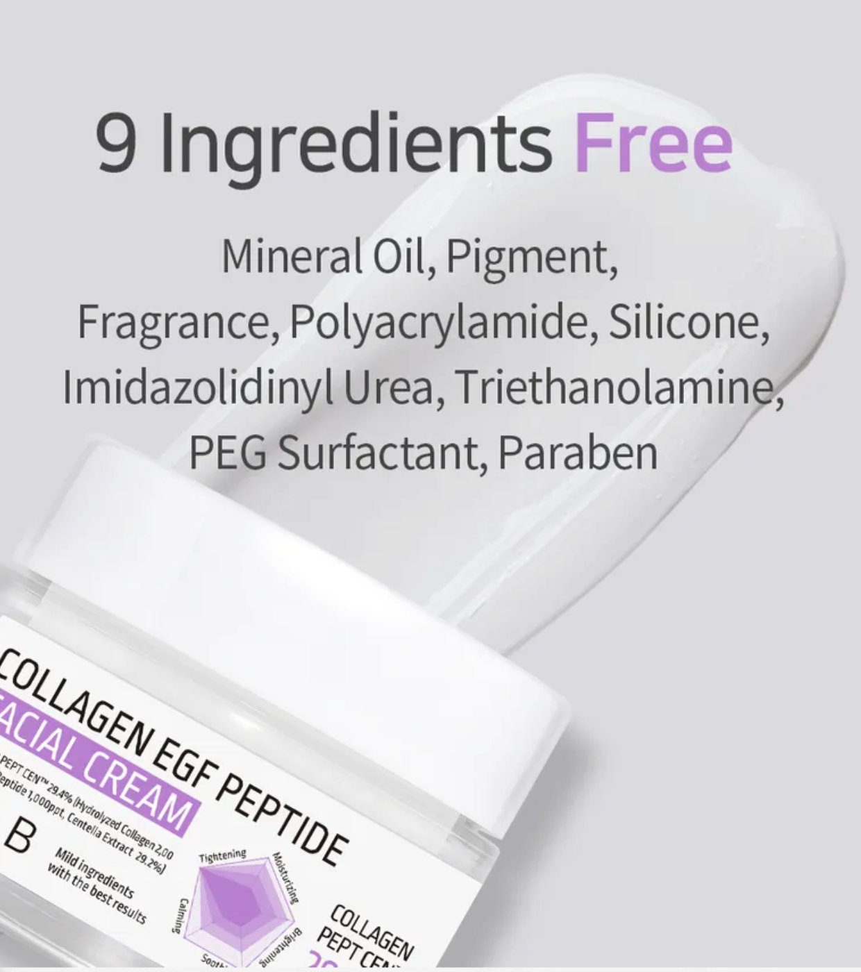 Collagen EGF Peptide Facial Cream La crema viso al peptide EGF al collagene è una crema viso intensiva che idrata in profondità e migliora la tonicità e l'elasticità della pelle.