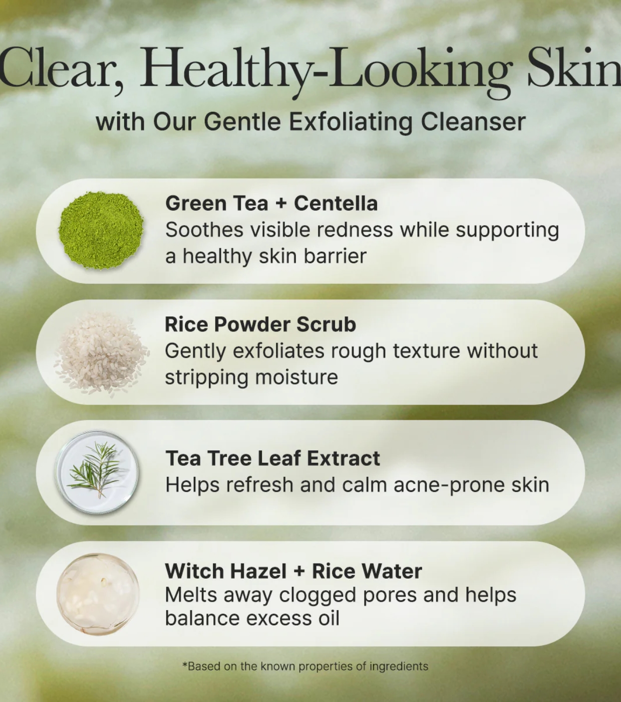 Glycerin, Water, Sodium Cocoyl Isethionate, Prunus Amygdalus Dulcis (Sweet Almond) Seed Meal, Sodium Cocoyl Glycinate, 1,2-Hexanediol, Coconut Acid, Sodium Methyl Cocoyl Taurate, Oryza Sativa (Rice) Powder, Fragrance, Kaolin, Sodium Isethionate, Camellia Sinensis Leaf Powder, Glyceryl Stearate, Hydroxypropyl Starch Phosphate, Xanthan Gum, Sodium Chloride, Dextrin, Ethylhexylglycerin, Gardenia Florida Fruit Extract, Camellia Sinensis Leaf Extract, Adansonia Digitata Fruit Extract, Artemisia Princeps Leaf Extract, Avena Sativa (Oat) Kernel Extract, Caulerpa Lentillifera Extract, Centella Asiatica Extract, Chamomilla Recutita (Matricaria) Flower Extract, Coffea Arabica (Coffee) Seed Extract, Eucalyptus Globulus Leaf Extract, Ficus Carica (Fig) Fruit Extract, Glycyrrhiza Uralensis (Licorice) Extract, Hamamelis Virginiana (Witch Hazel) Extract, Hyssopus Officinalis Extract, Lycium Chinense Fruit Extract, Melaleuca Alternifolia (Tea Tree) Extract, Nelumbo Nucifera Leaf Extract, Oryza Sativa (Rice) Extract, Panax Ginseng Root Extract, Portulaca Oleracea Extract, Saururus Chinensis Extract, Solanum Melongena (Eggplant) Fruit Extract