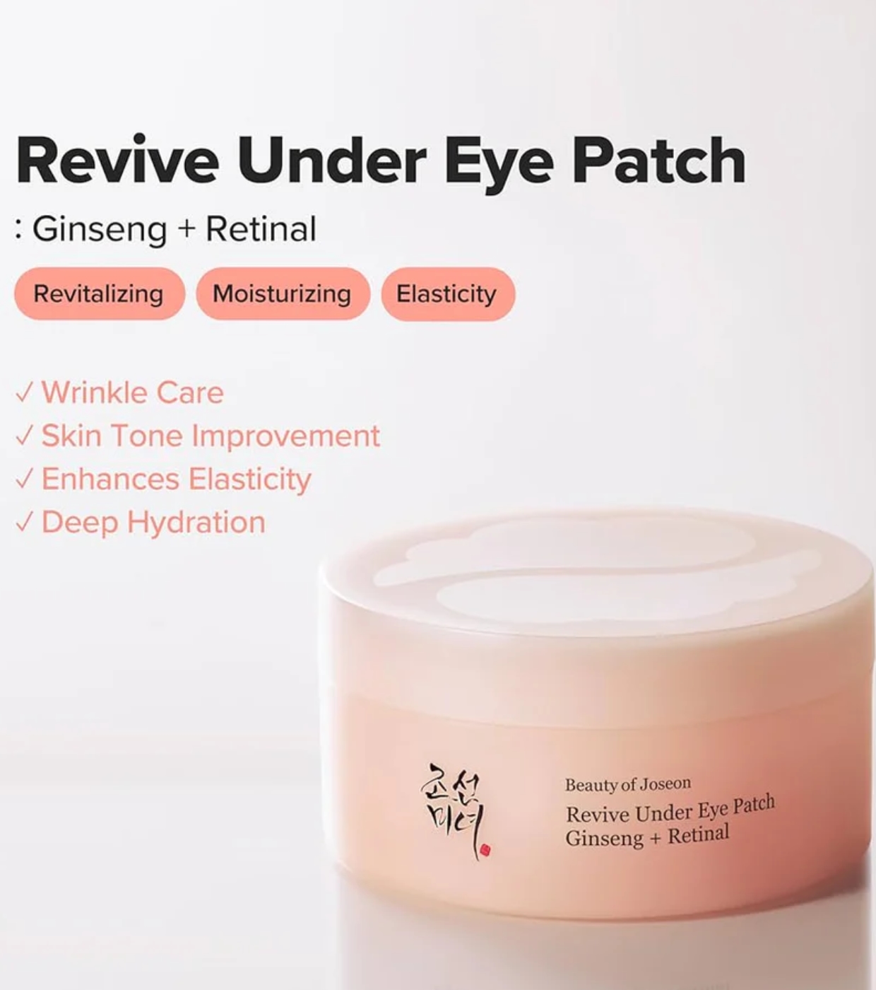Ravviva il tuo look con Revive Under Eye Patch di Beauty of Joseon , patch idrogel anti-età di ispirazione coreana studiati per ridurre le rughe, schiarire le occhiaie, diminuire il gonfiore e migliorare la tonicità del contorno occhi in sole due settimane.