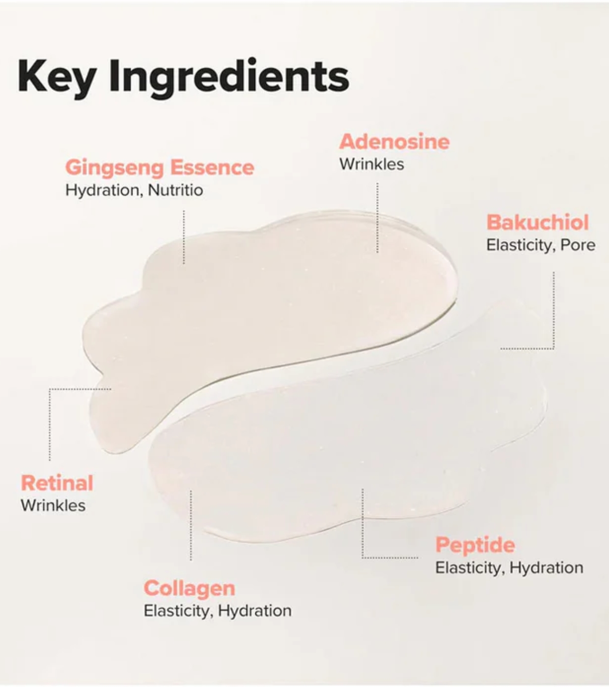 Panax Ginseng Root Water, Water, Glycerin, Collagen Water, 1,2-Hexanediol, Chondrus Crispus, Hydroxyacetophenone, Algin, Ceratonia Siliqua (Carob) Gum, Butylene Glycol, Potassium Chloride, Xanthan Gum, Hydrolyzed Collagen, Glucomannan, Sucrose, Titanium Dioxide, Mica, Synthetic Fluorphlogopite, Adenosine, Maltodextrin, Disodium Edta, Dipotassium Glycyrrhizate, Allantoin, Tin Oxide, Hydrogenated Lecithin, Centella Asiatica Extract, Ficus Carica (Fig) Fruit Extract, Beta-Glucan, Ceramide Np, Caprylyl Glycol, Bakuchiol, Retinal, Acetyl Hexapeptide-8