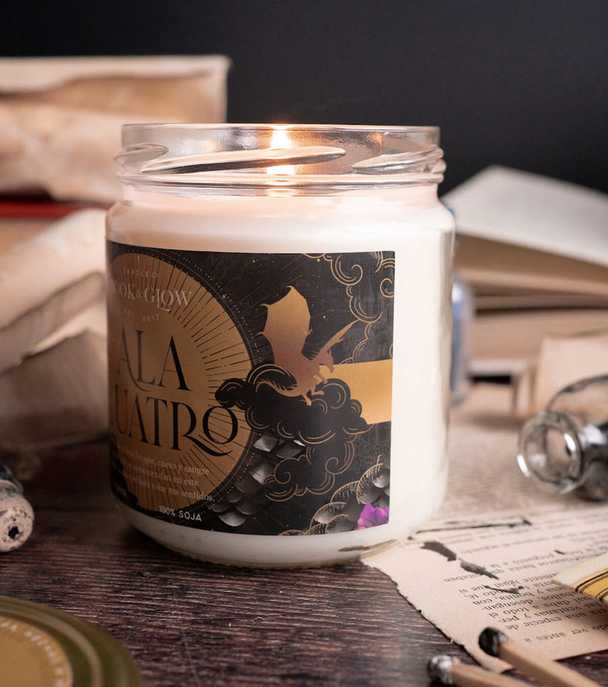 Candela di soia The Four Wing della collezione Mundos Extraordinarios di Book and Glow .