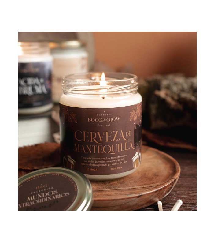 Candela di soia della collezione Mundos Extraordinarios di Book and Glow.