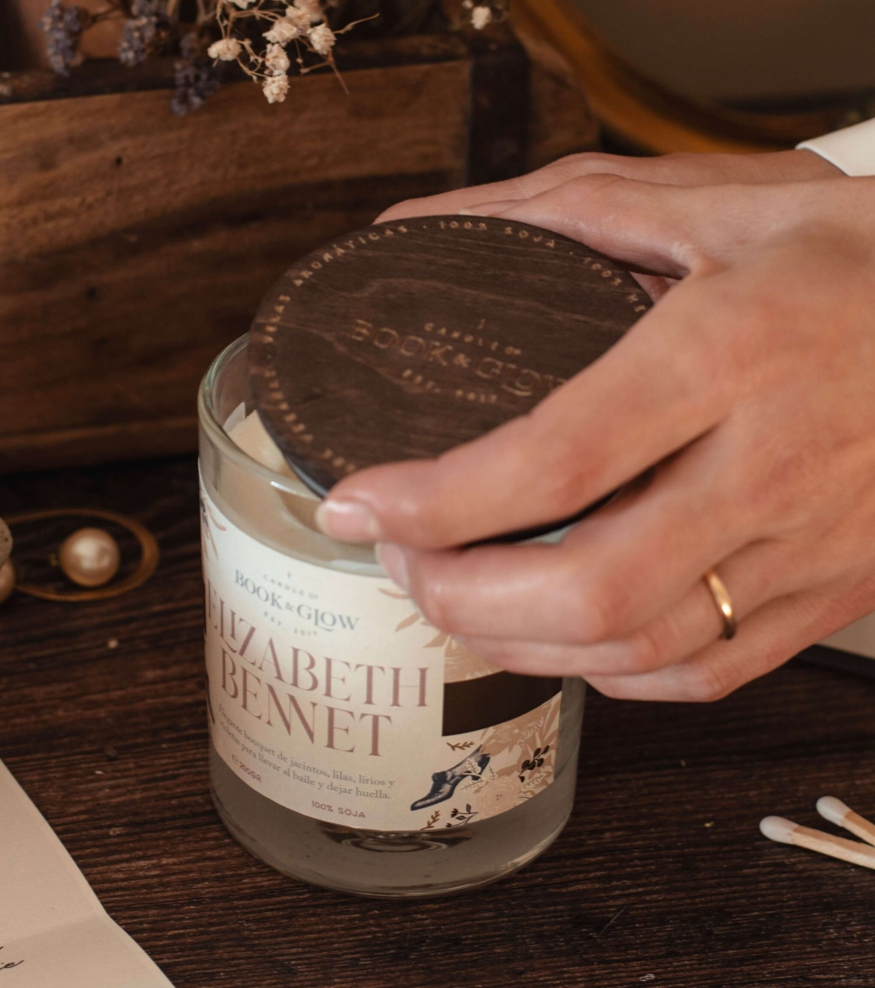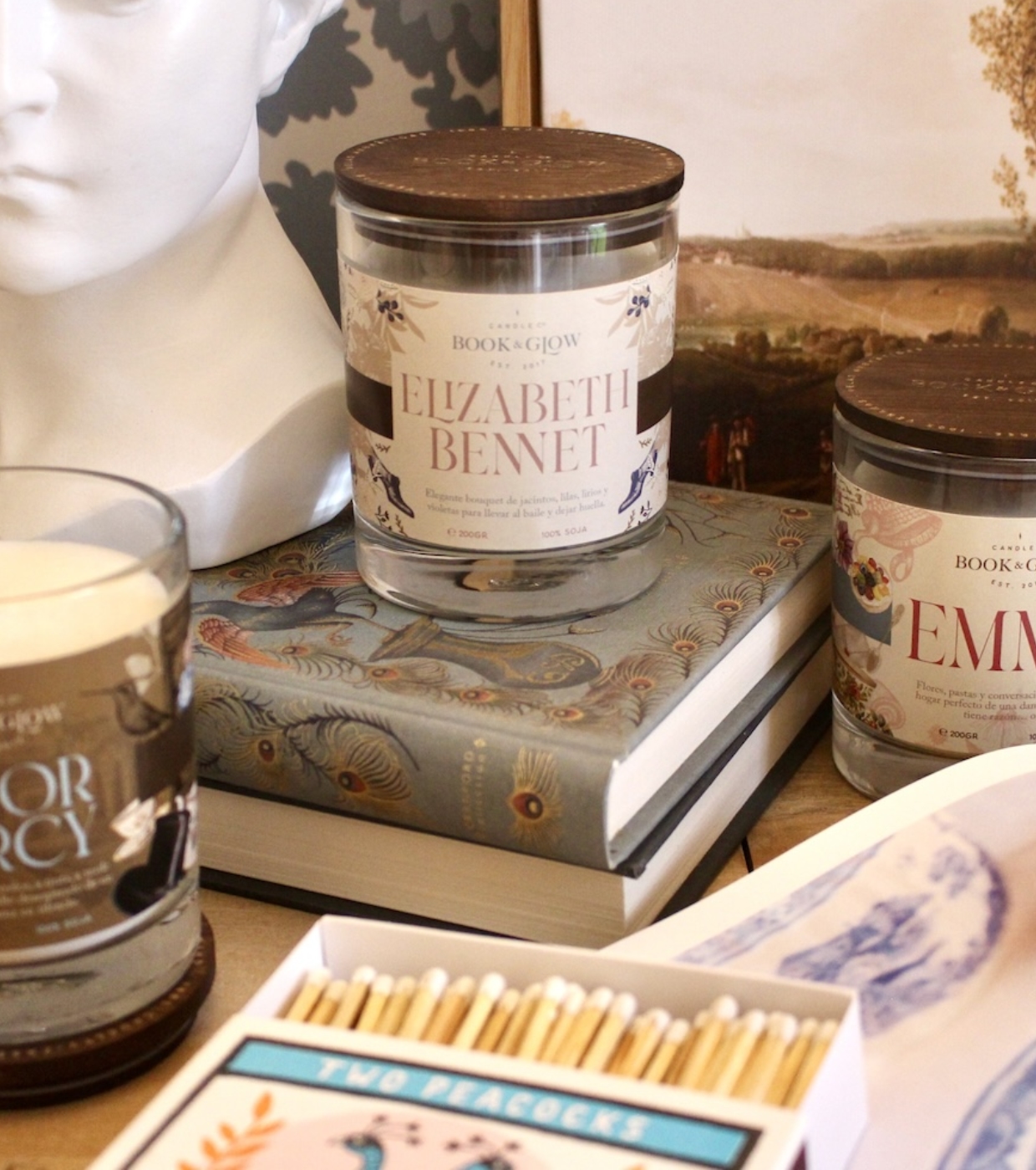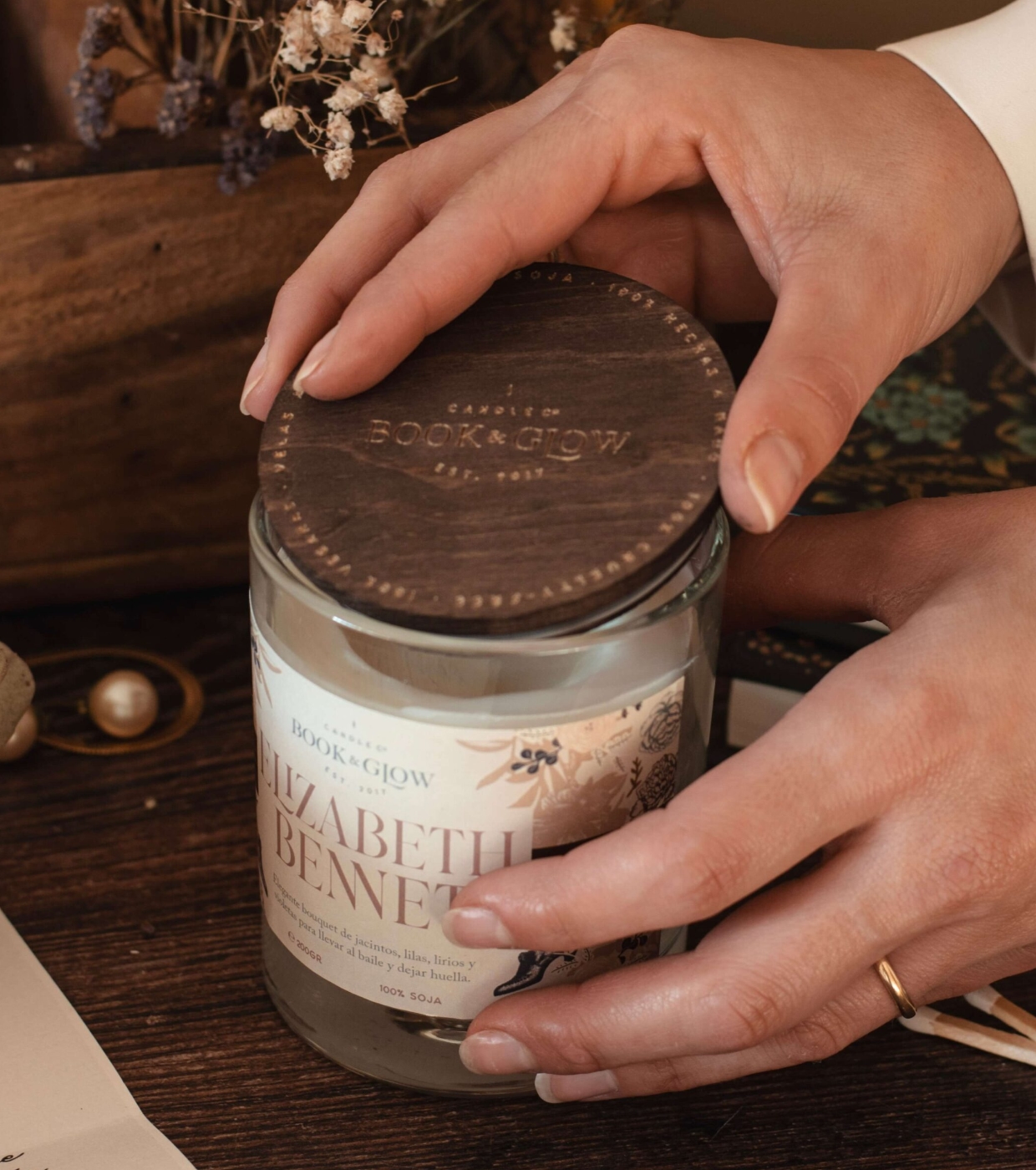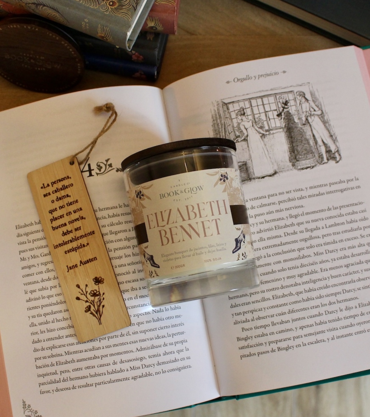 Candela di soia della collezione Extraordinary Worlds di Book and Glow. Elisabetta Bennet.