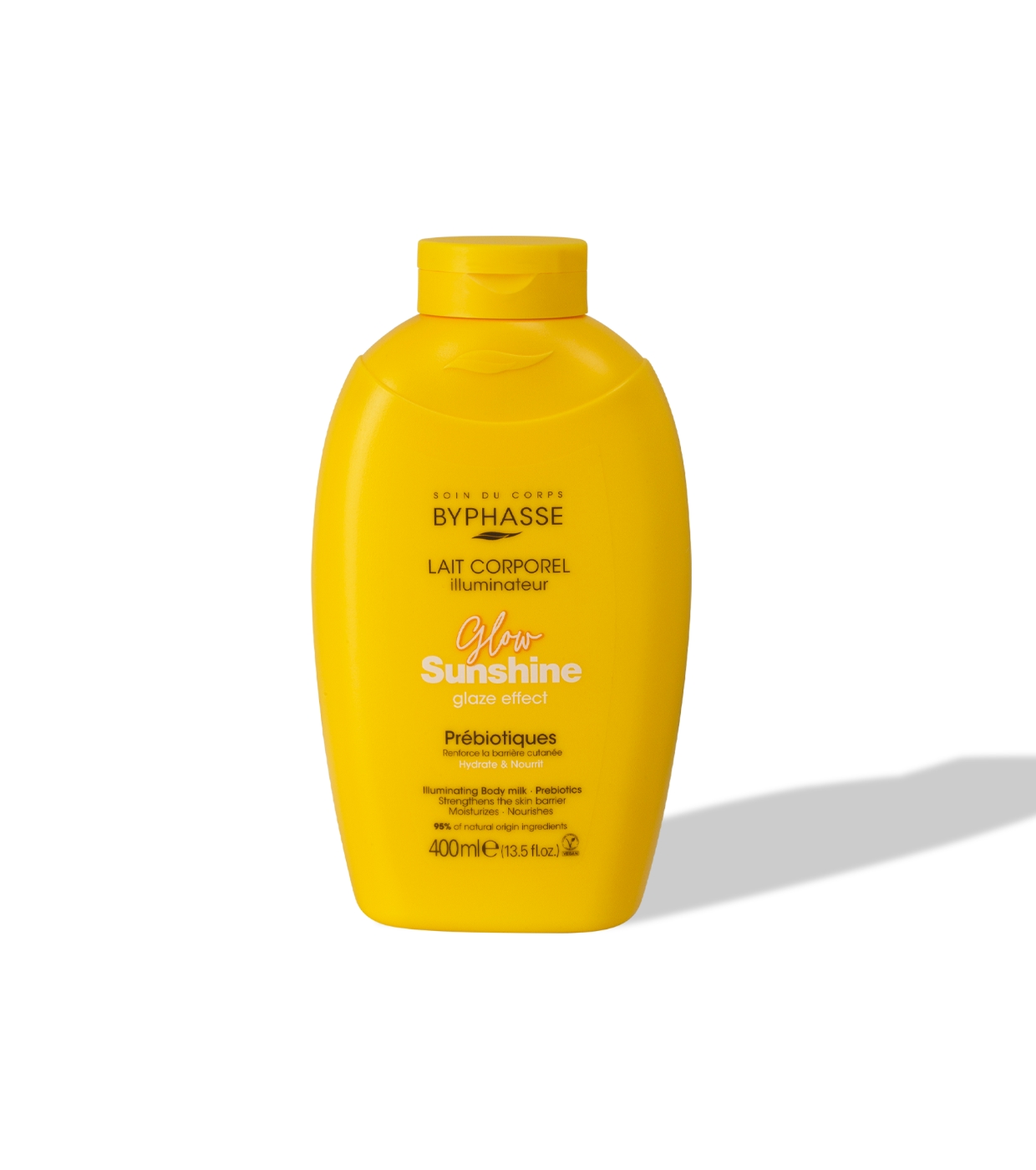 Ottieni un effetto "Pelle di vetro" con il Latte Corpo Illuminante Glow Sunshine di Byphasse , una formula nutriente che combina prebiotici, burro di karité e olio di vinaccioli per rafforzare la barriera cutanea, idratando, nutrendo e illuminando la pelle.