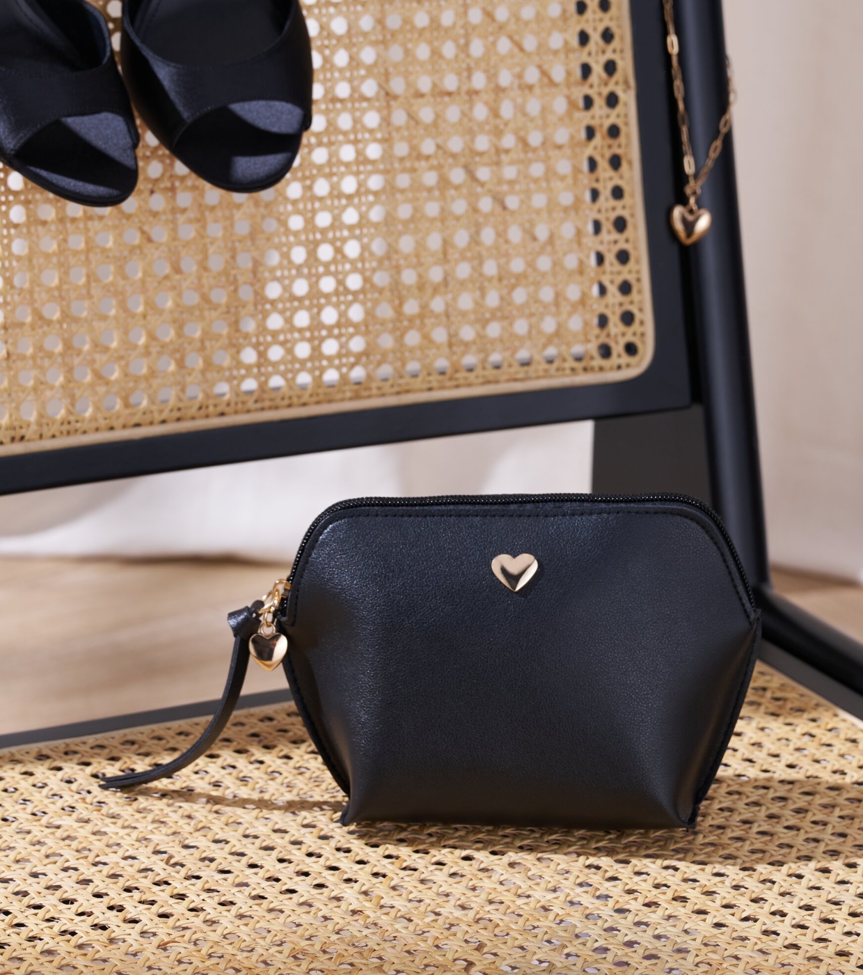 La finitura effetto pelle nera è abbinata a dettagli dorati, come il delicato cuore metallico sulla parte anteriore e il manico con ciondolo a forma di cuore, aggiungendo un tocco romantico e sofisticato.