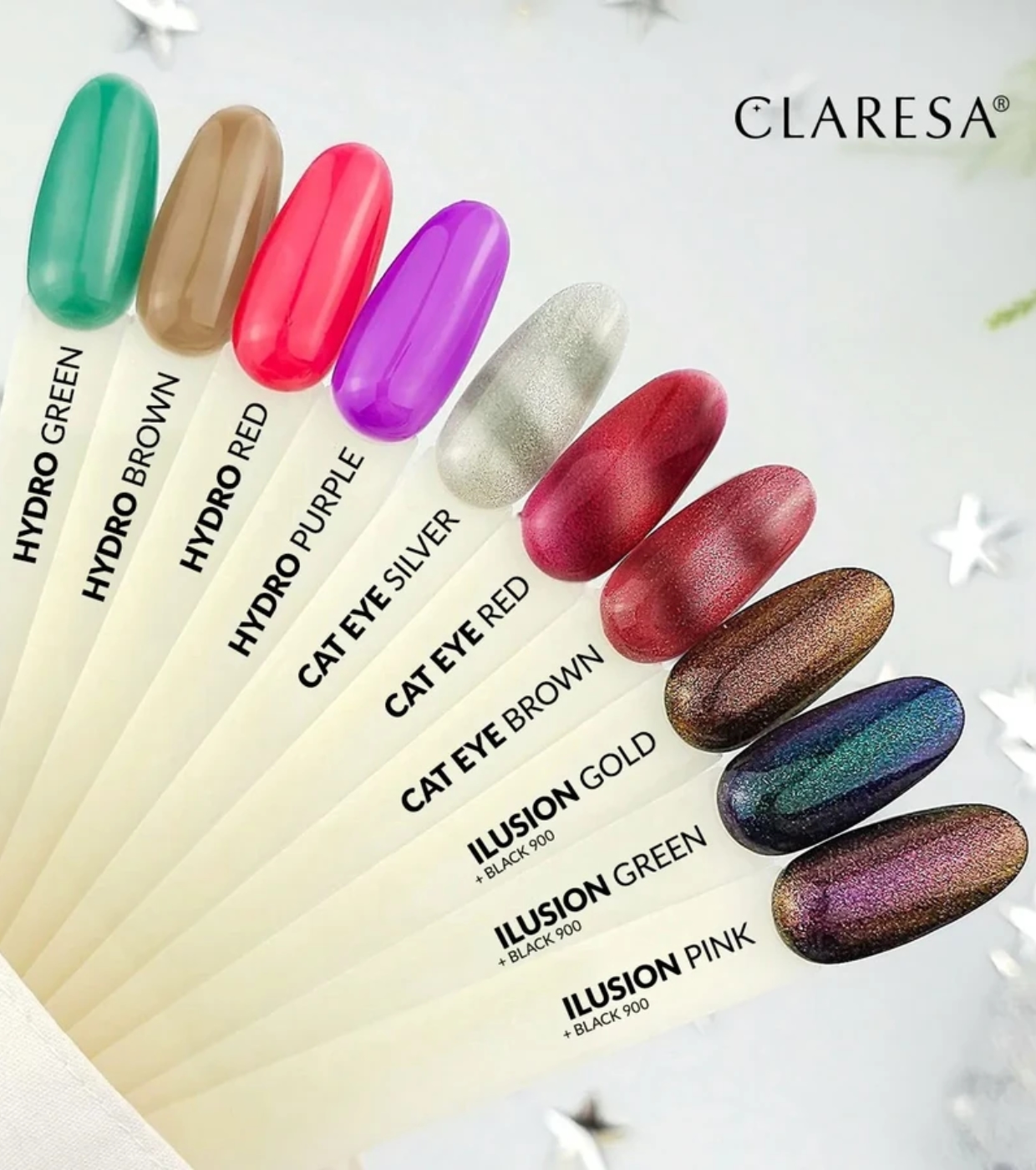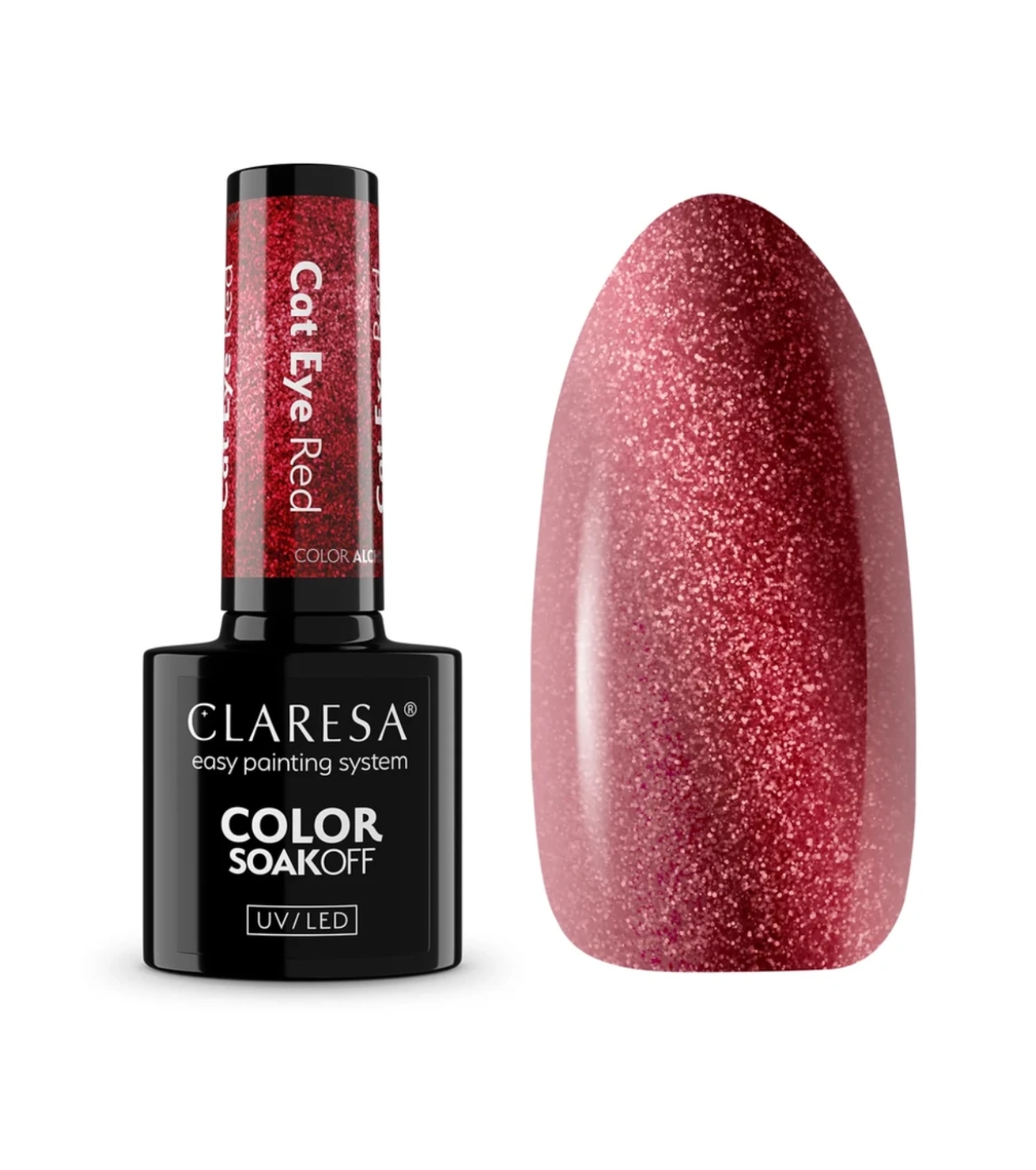 Lo smalto semipermanente Claresa con finitura “Cat Eye” crea il famoso effetto “occhio di gatto” quando si avvicina una calamita, generando un riflesso luminoso, simile a quello di una pietra preziosa, che cambia con il movimento della mano e risulta spettacolare sotto qualsiasi luce.
