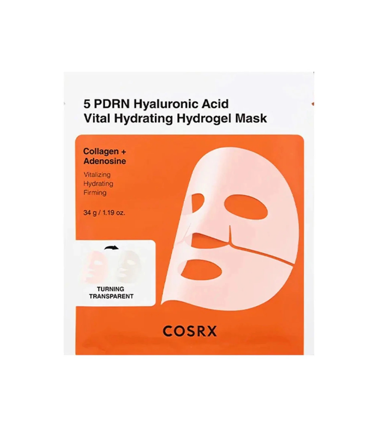 La maschera 5 PDRN Hyaluronic Acid Vital di COSRX è un idrogel ad idratazione intensiva che si adatta alla pelle come un secondo strato, diventando trasparente man mano che rilascia i suoi principi attivi.