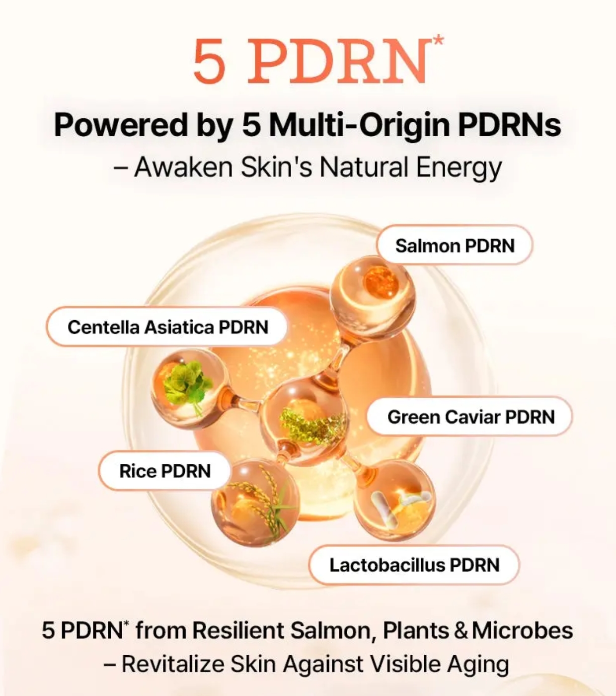 Formulata con 5 PDRN e otto tipi di acido ialuronico, offre un'idratazione profonda migliorando visibilmente la texture della pelle e donandole un aspetto più pieno e luminoso.