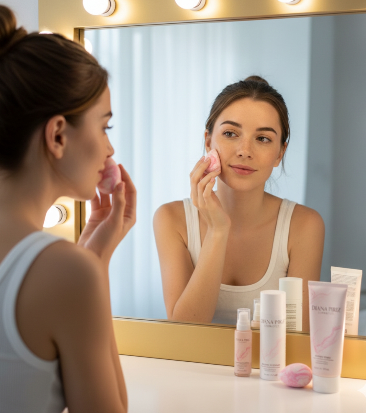 La spugnetta per il trucco Pink Sakura + la sua custodia ventilata di Diana Piriz è uno strumento professionale senza lattice, realizzato in poliuretano idrofilo, ideale per l'applicazione di prodotti liquidi, in crema e in polvere.
