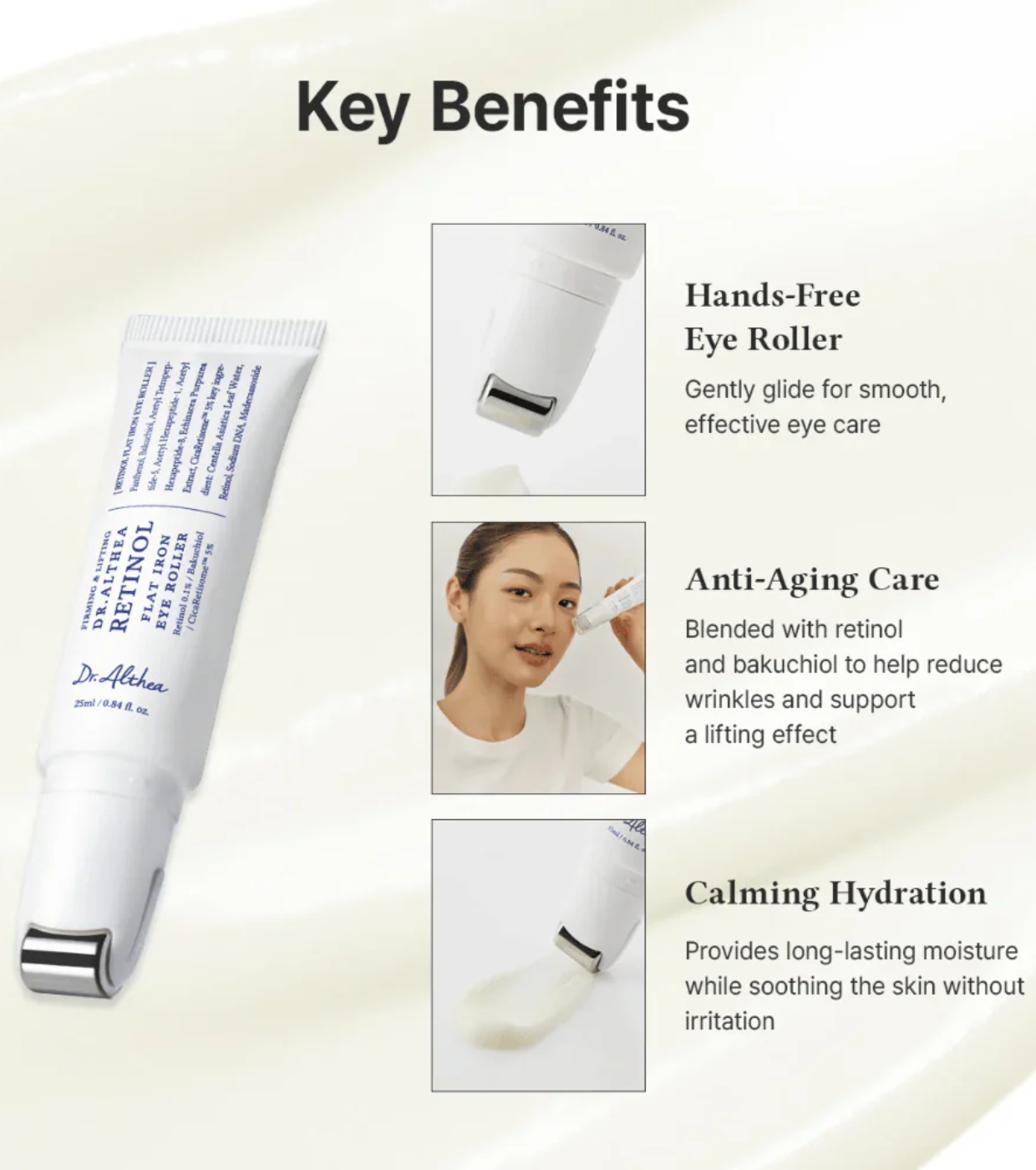 Il Retinol Flat Iron Eye Roller di Dr. Althea è un trattamento specifico per il contorno occhi che combina principi attivi anti-età e lenitivi per migliorare la tonicità, levigare le rughe e idratare una zona particolarmente delicata.