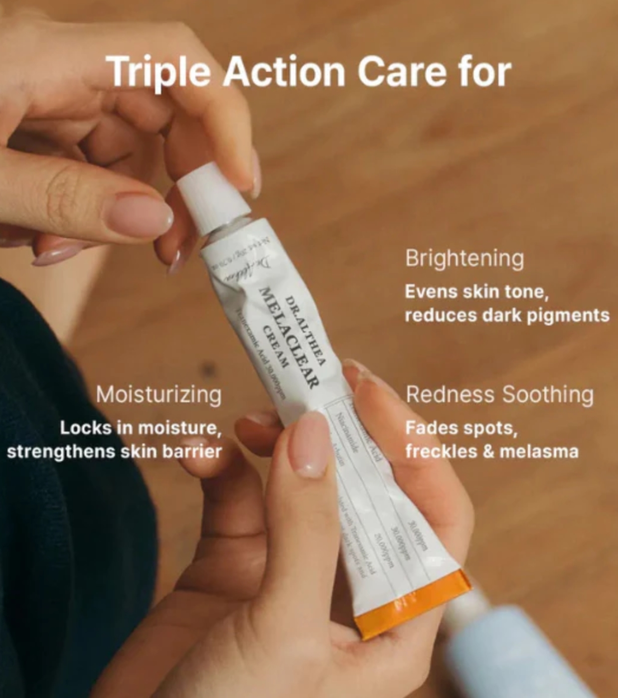 La sua formula combina un potente sistema anti-melanina a tripla azione, che agisce direttamente sull'eccesso di pigmentazione idratando e lenendo la pelle.