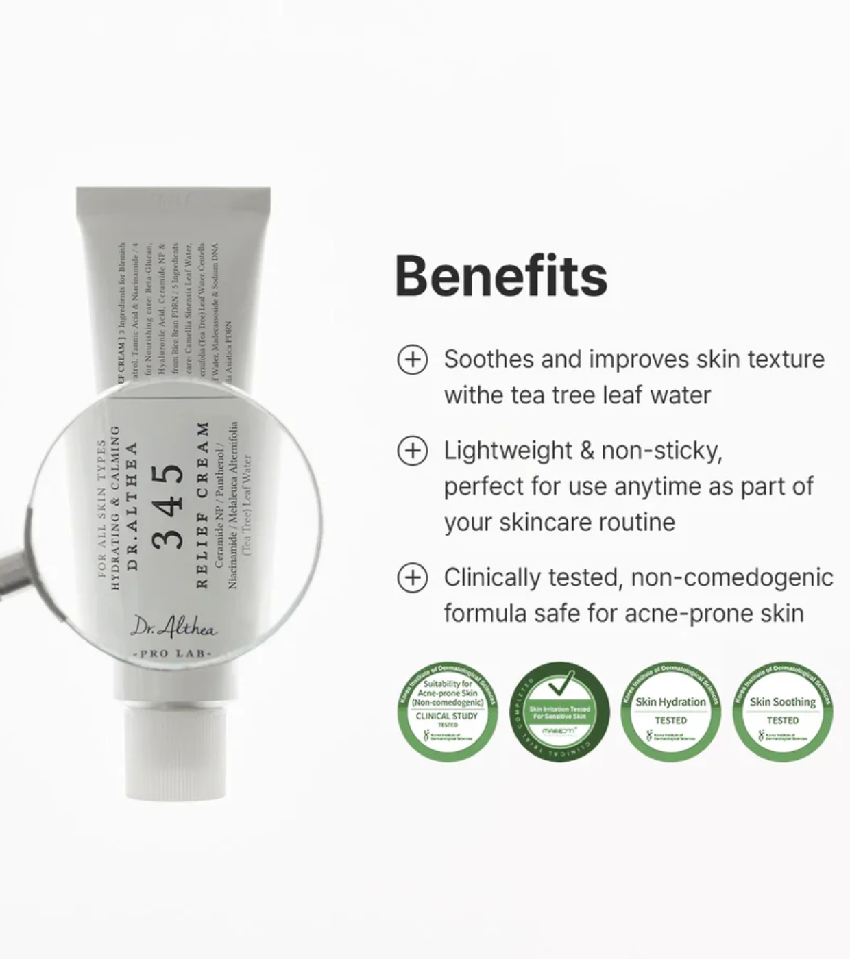 Dr. Althea 345 Relief Cream è una soluzione completa per la pelle che necessita di riparazione, lenimento e idratazione senza irritazioni, ideale per accompagnare i processi di recupero dopo acne o estrema sensibilità.