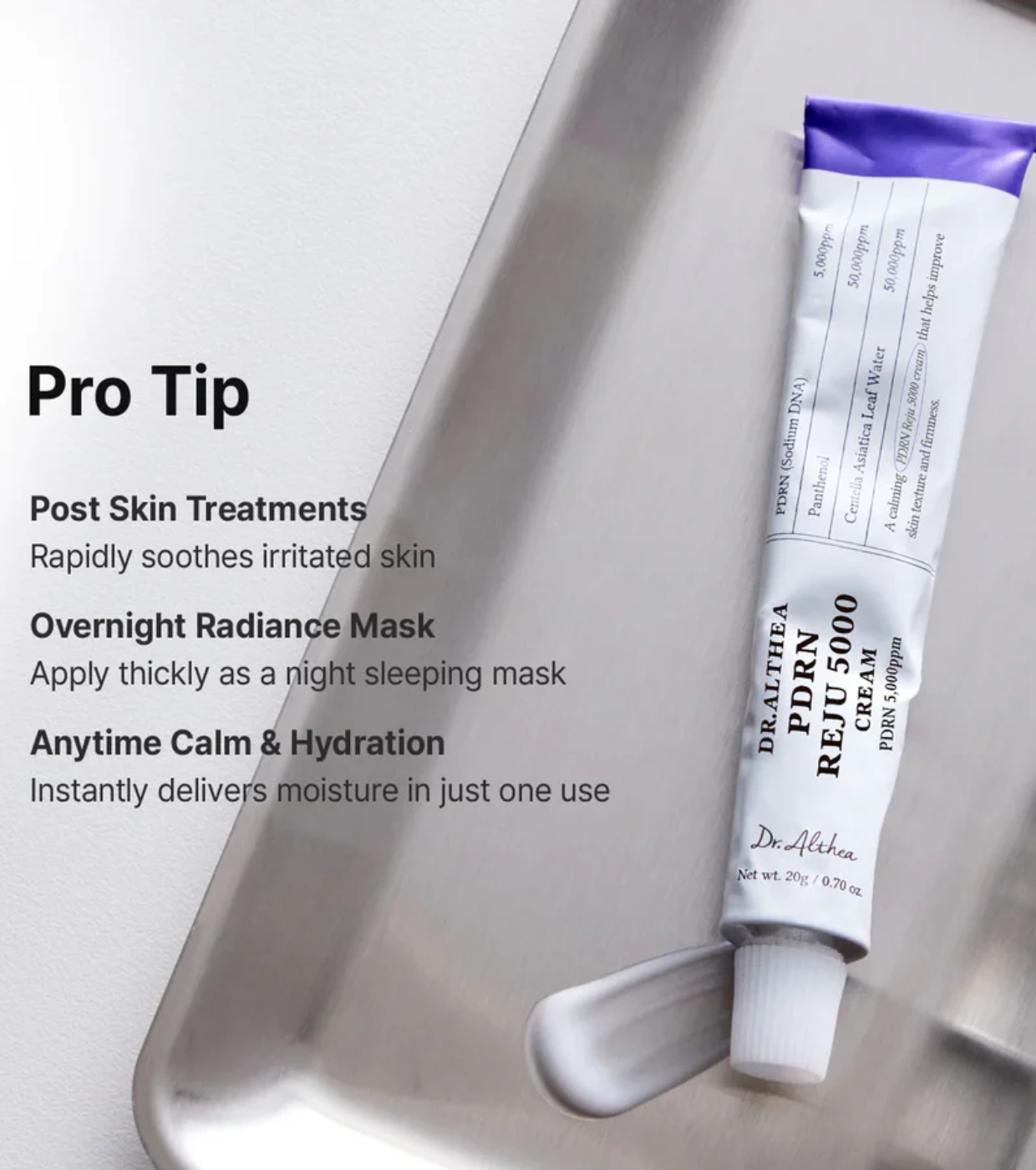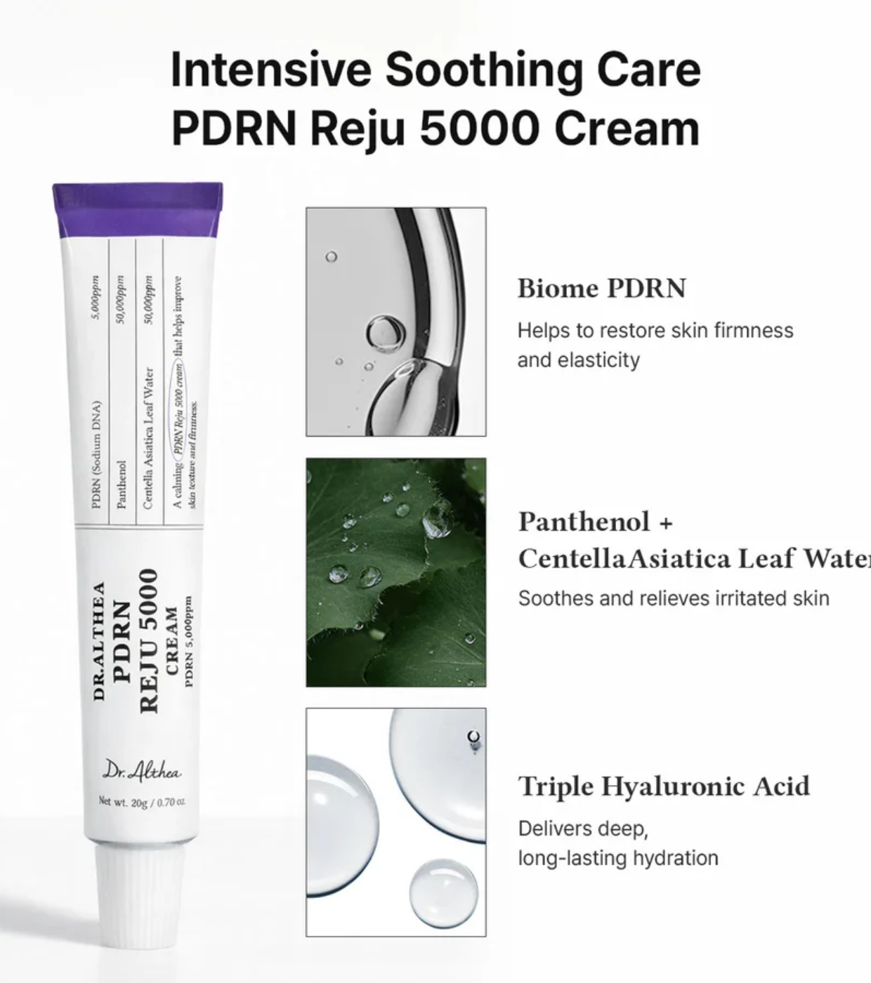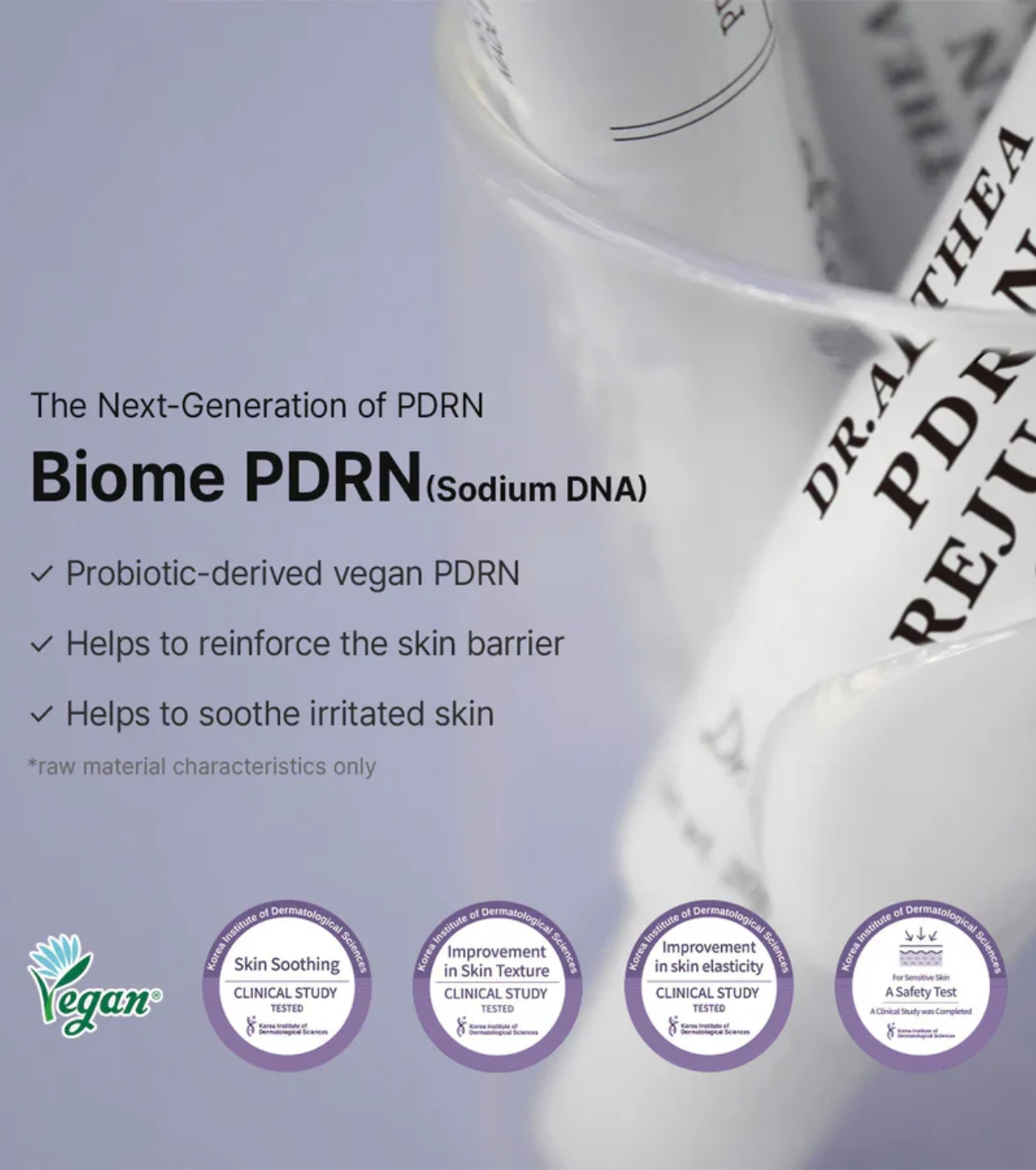 La sua formula combina PDRN derivato da probiotici (5.000 ppm), centella asiatica e un complesso triplo di acido ialuronico per lenire la pelle, rinforzare la barriera cutanea e fornire un'idratazione profonda e duratura.