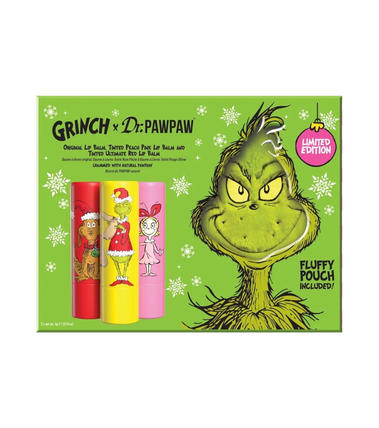 Direttamente da Chissa' arriva il Grinch x Dr.PAWPAW Festive Trio , un set essenziale per mantenere le tue labbra idratate, nutrite e piene di colore durante le festività natalizie.