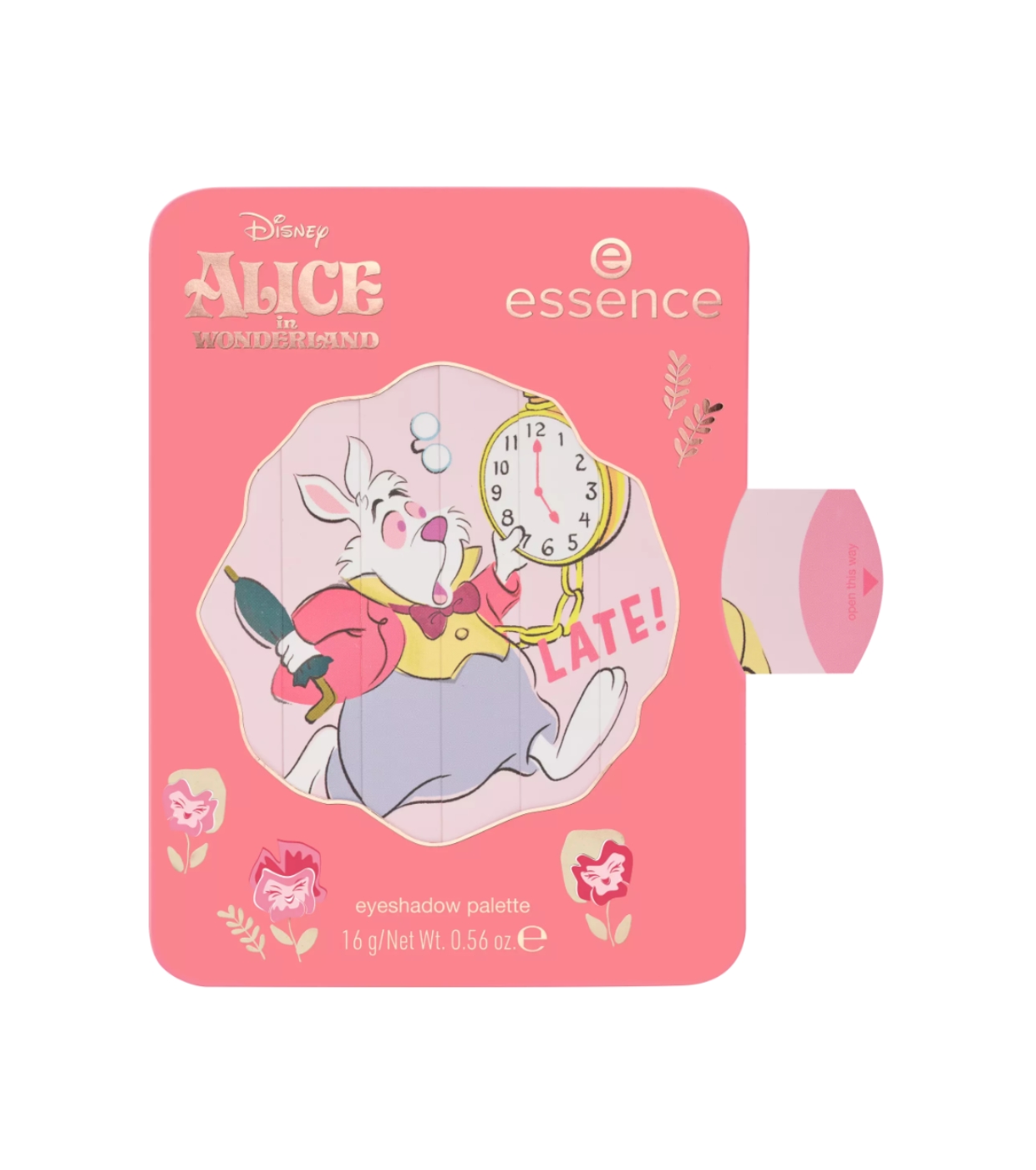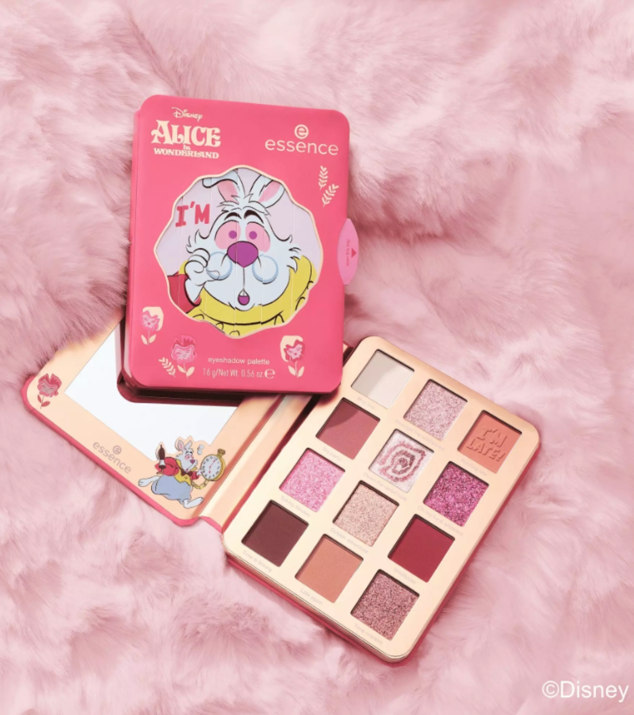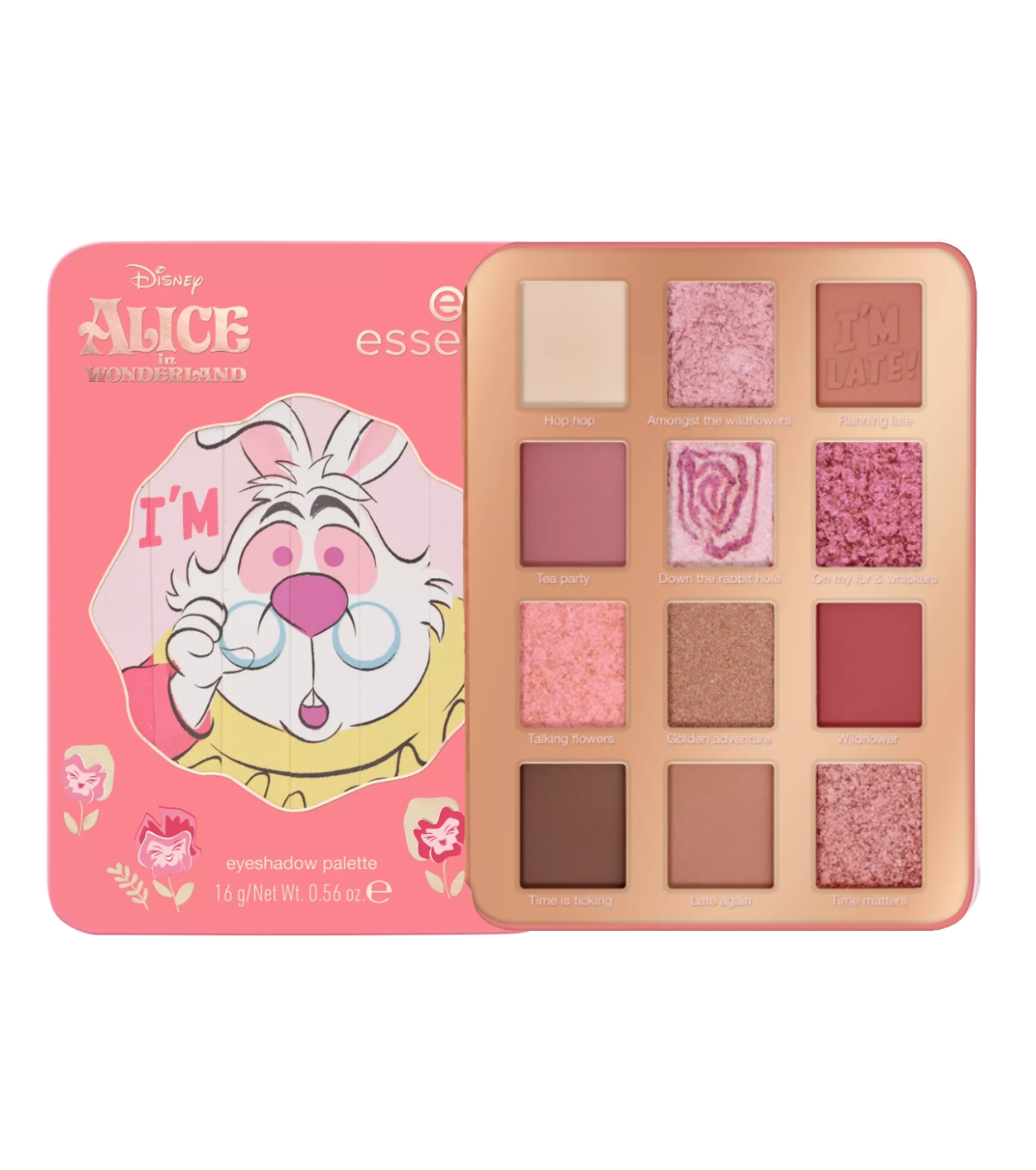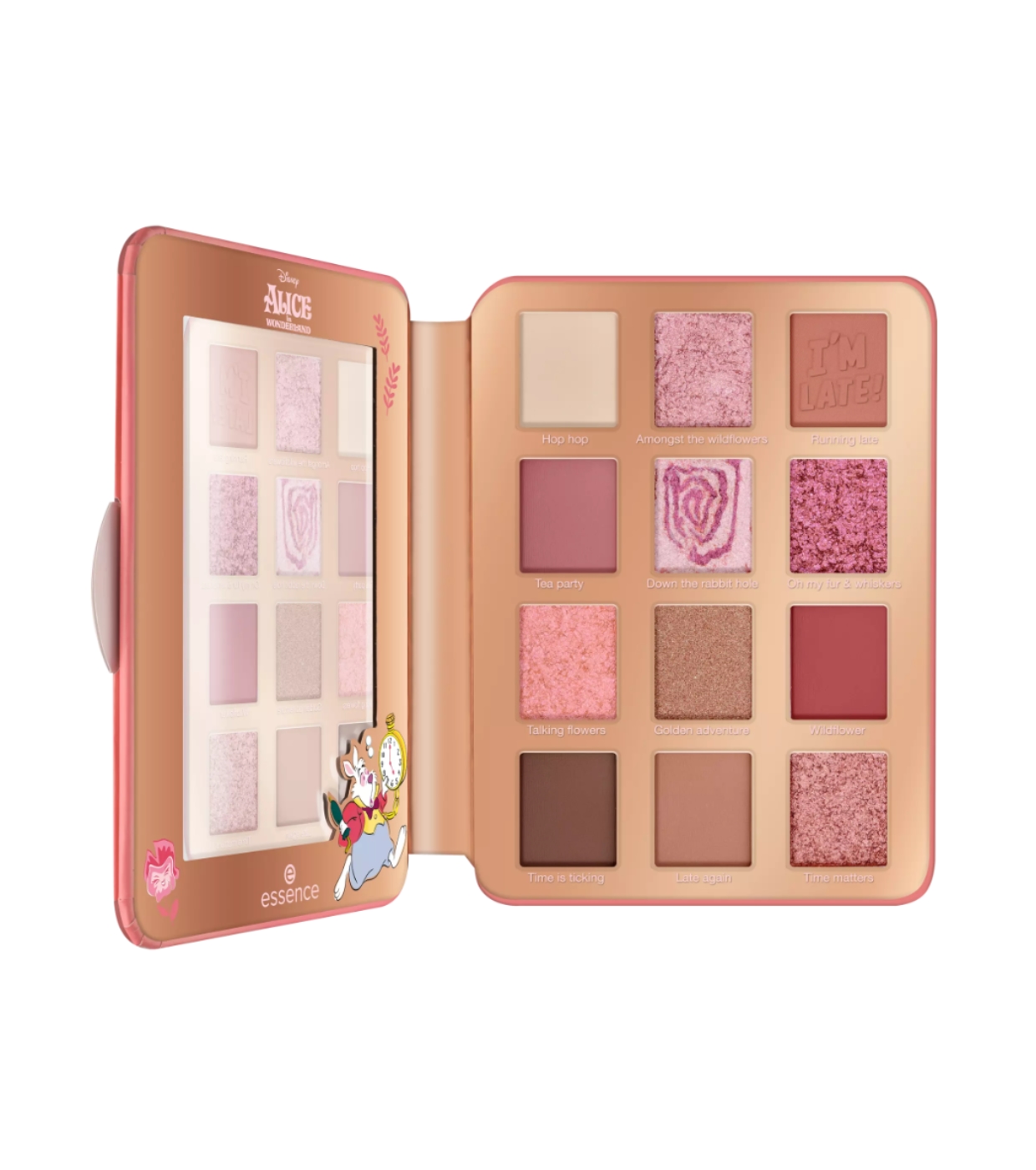 La palette di ombretti essence x Disney Alice in Wonderland si ispira all'universo incantato di Alice nel Paese delle Meraviglie, con 12 tonalità altamente pigmentate con finiture opache, brillanti e glitterate.