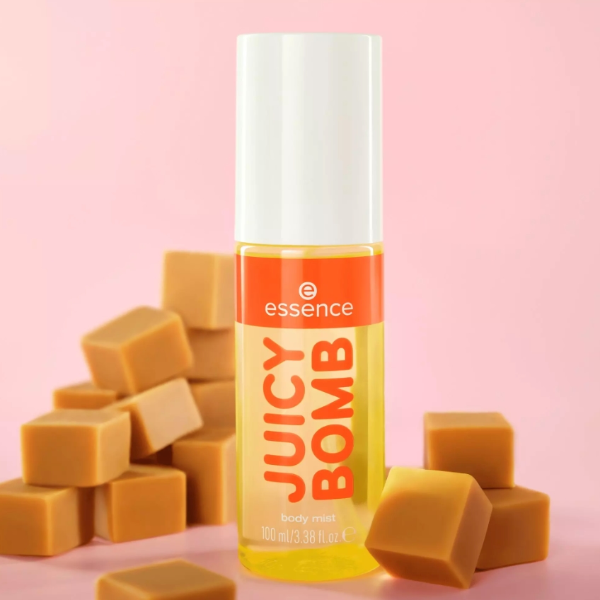Lasciati sedurre dall'aroma del tuo brownie al caramello salato preferito con il body mist JUICY BOMB 102 Caramel Cloud di essence .