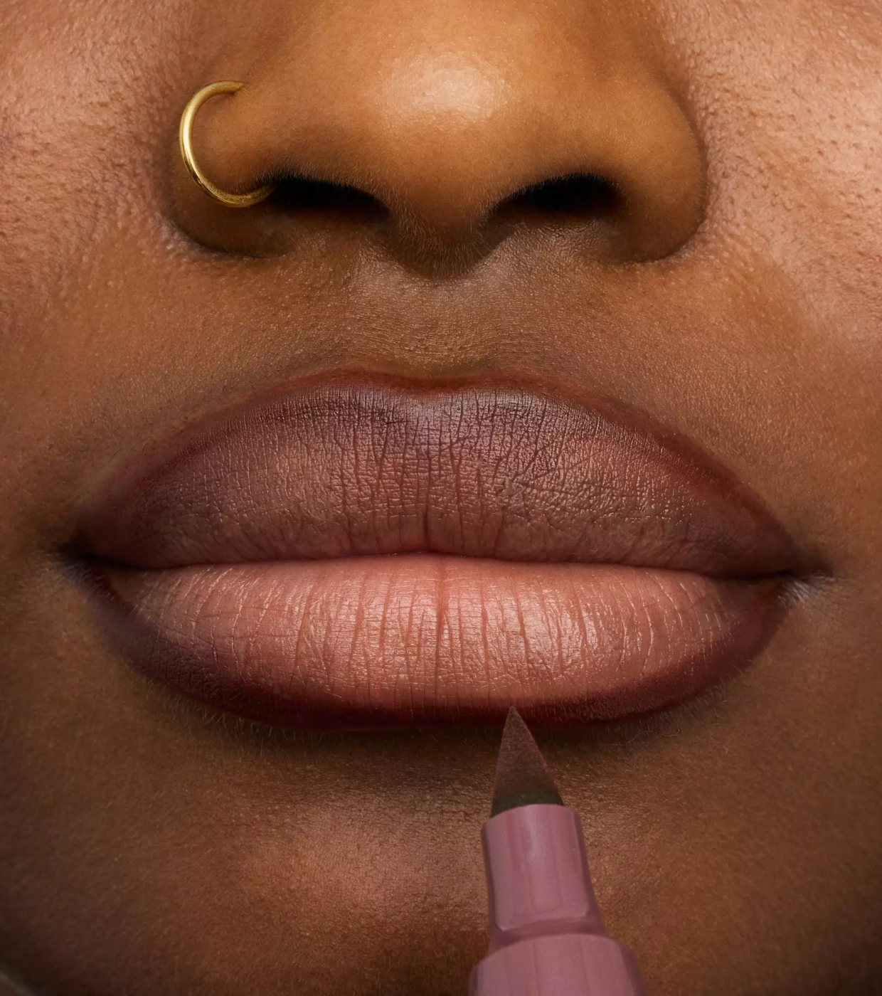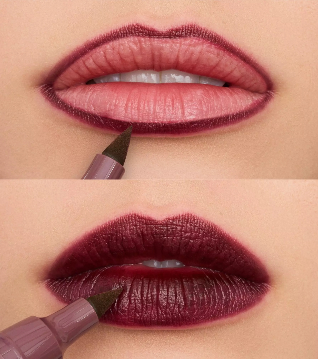 La matita labbra liquida è disponibile in un color malva scuro e può essere applicata con una sola passata.