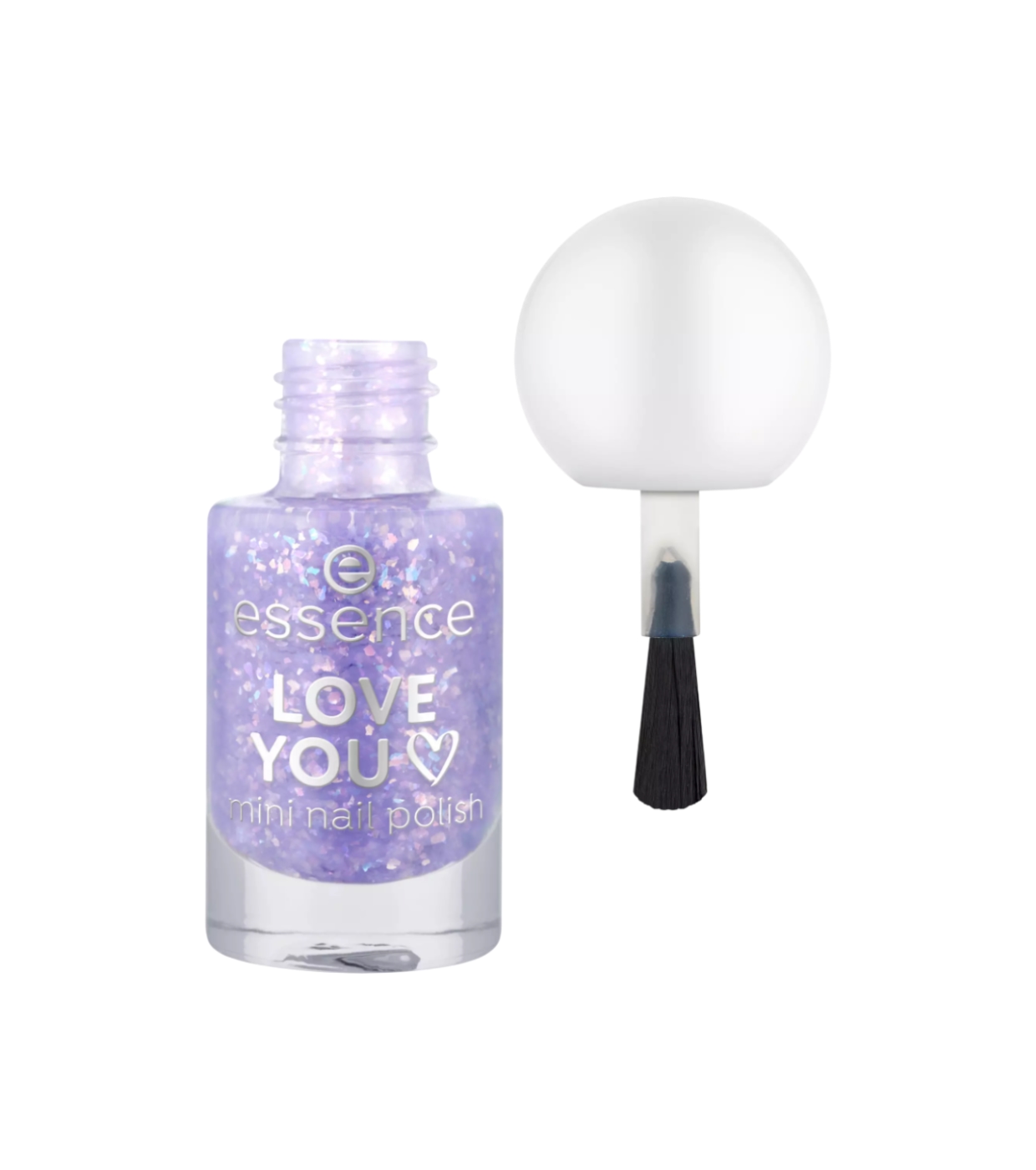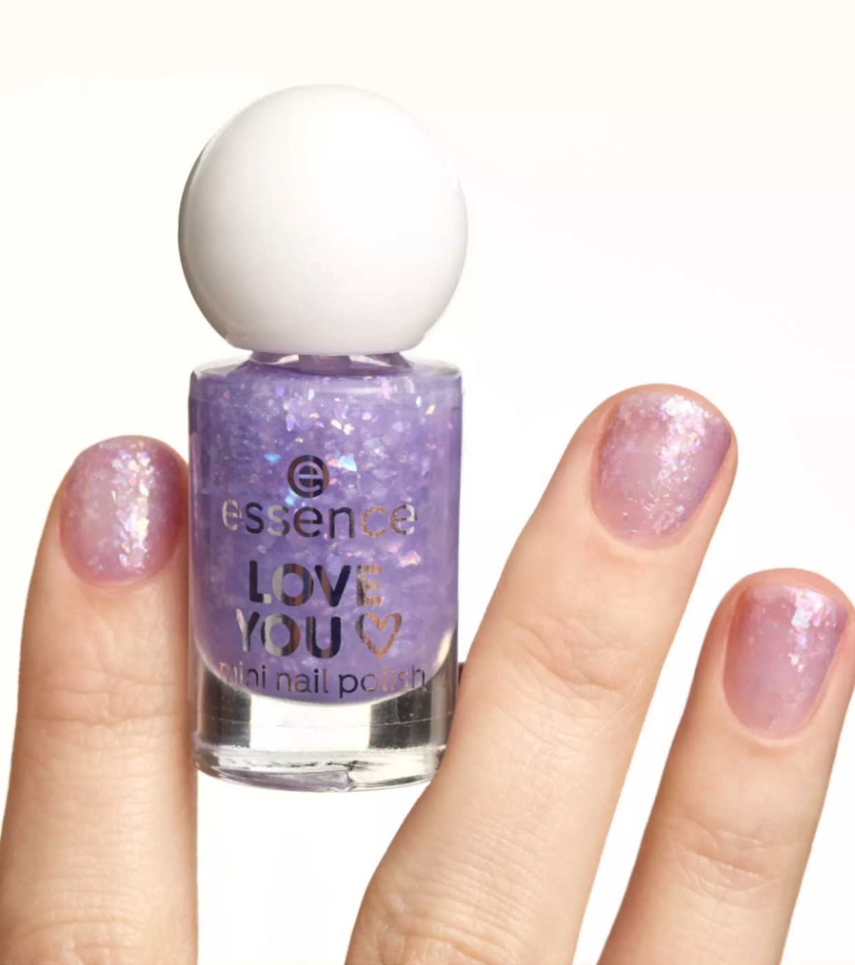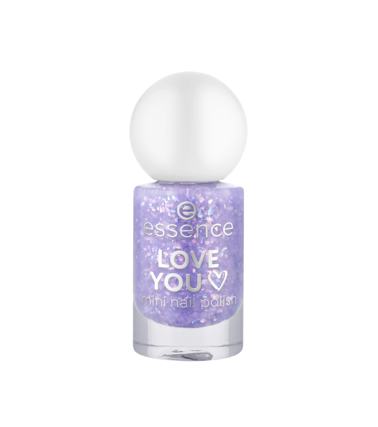 Lo smalto mini Love You 13 di essence ha una tonalità lilla con particelle olografiche di coriandoli che creano una spettacolare lucentezza multidimensionale.