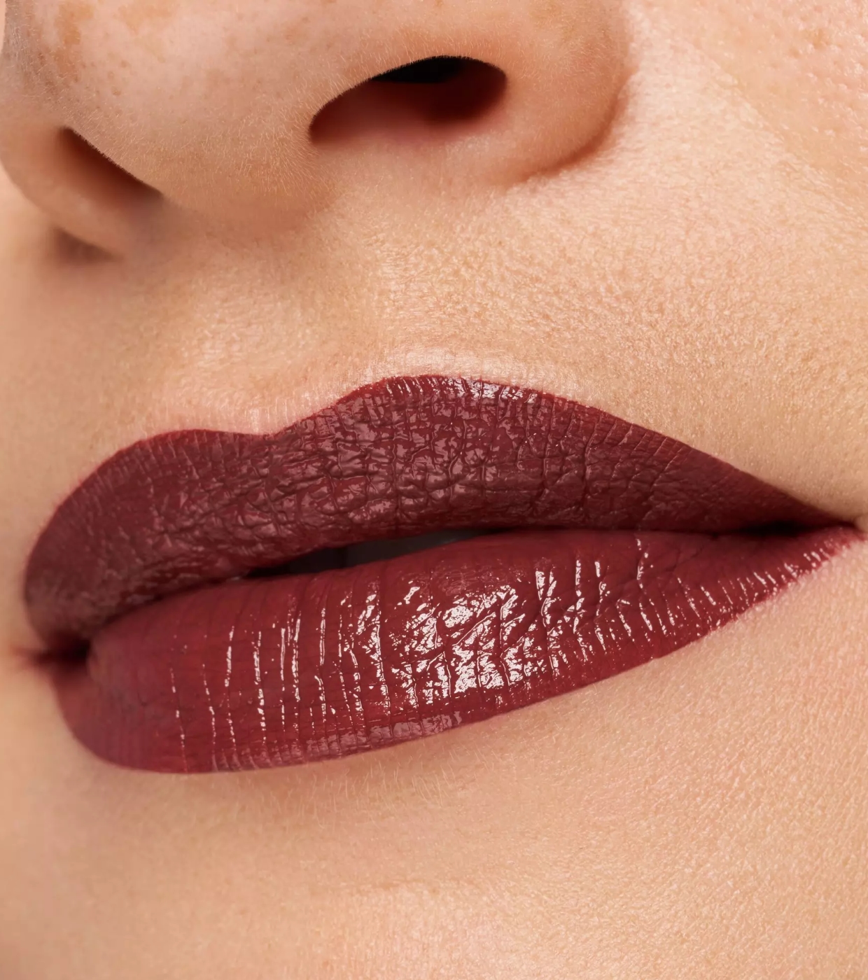 La sua formula cremosa e altamente pigmentata offre una copertura totale in una sola passata, lasciando le labbra morbide e confortevoli per ore.
