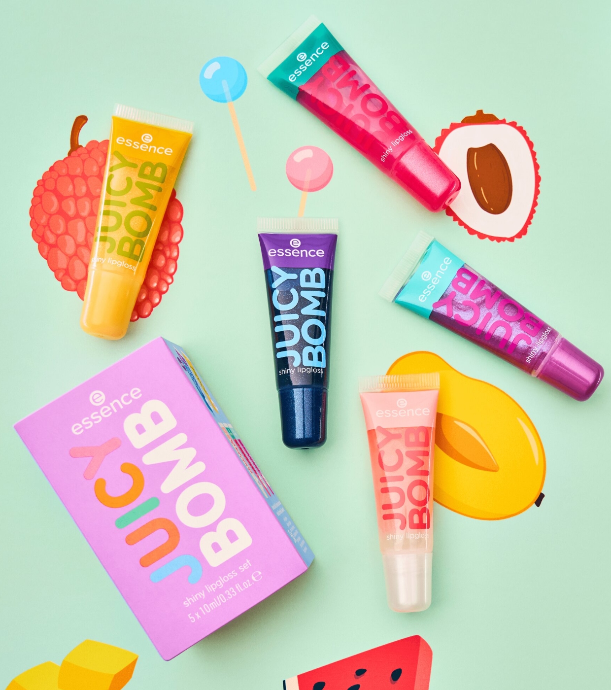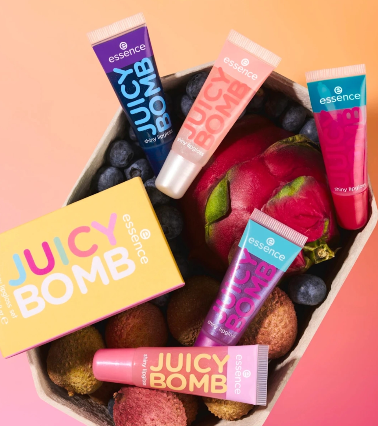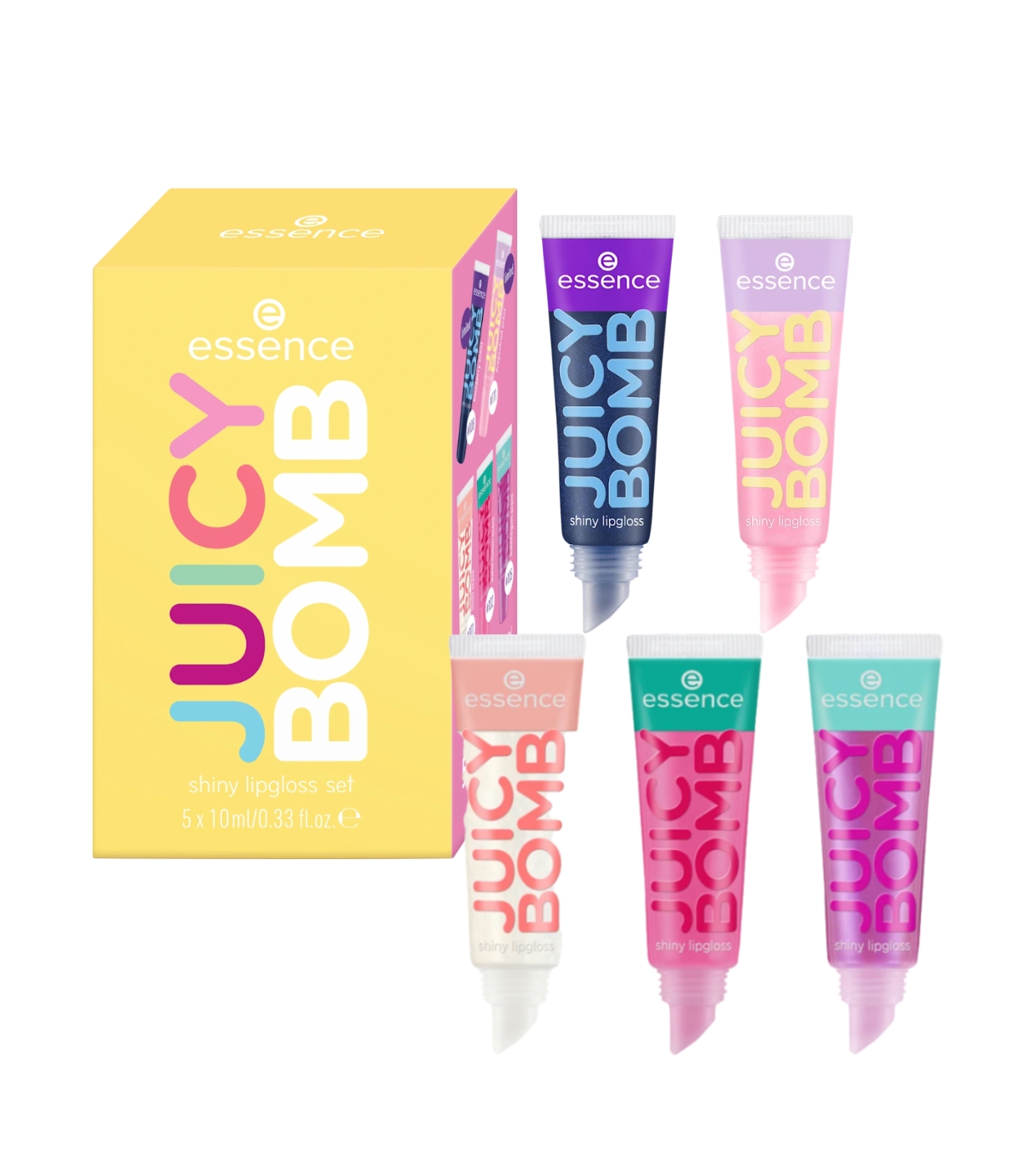 Regalati labbra succose, brillanti e profumate con questo irresistibile set di lucidalabbra di essence , che include diverse tonalità dell'iconica collezione Juicy Bomb.