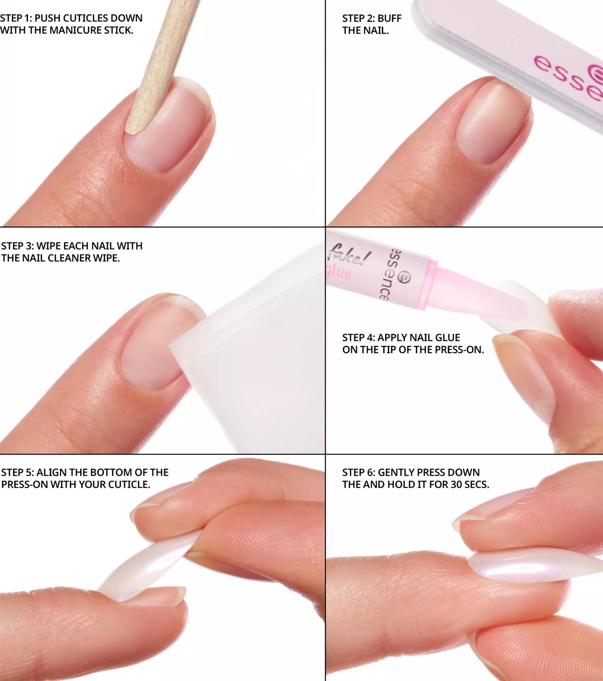 Il set comprende anche colla per unghie, uno stick per manicure, una mini lima per unghie e una salvietta detergente per unghie: tutto l'essenziale per una manicure liscia e duratura.