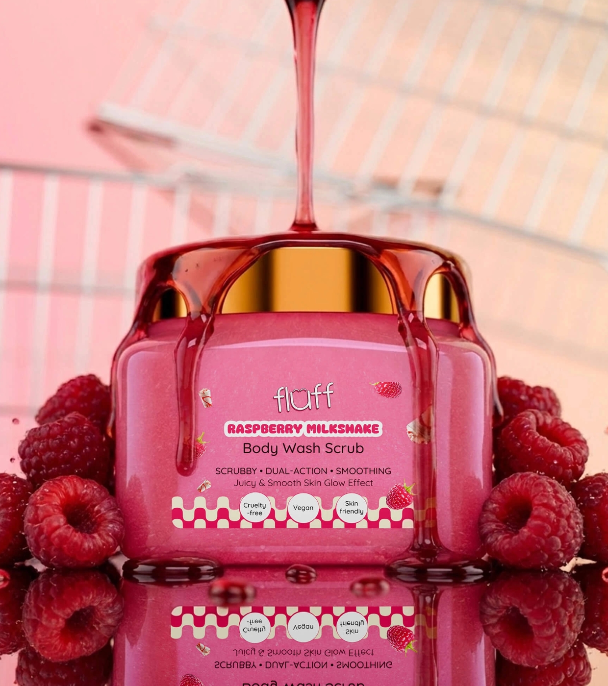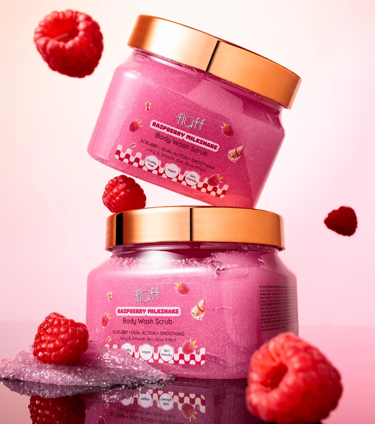 Goditi una pelle morbida, liscia e rinnovata fin dal primo utilizzo con lo scrub corpo Raspberry Milkshake di Fluff , il peeling corpo che deterge, esfolia e nutre in un solo gesto.