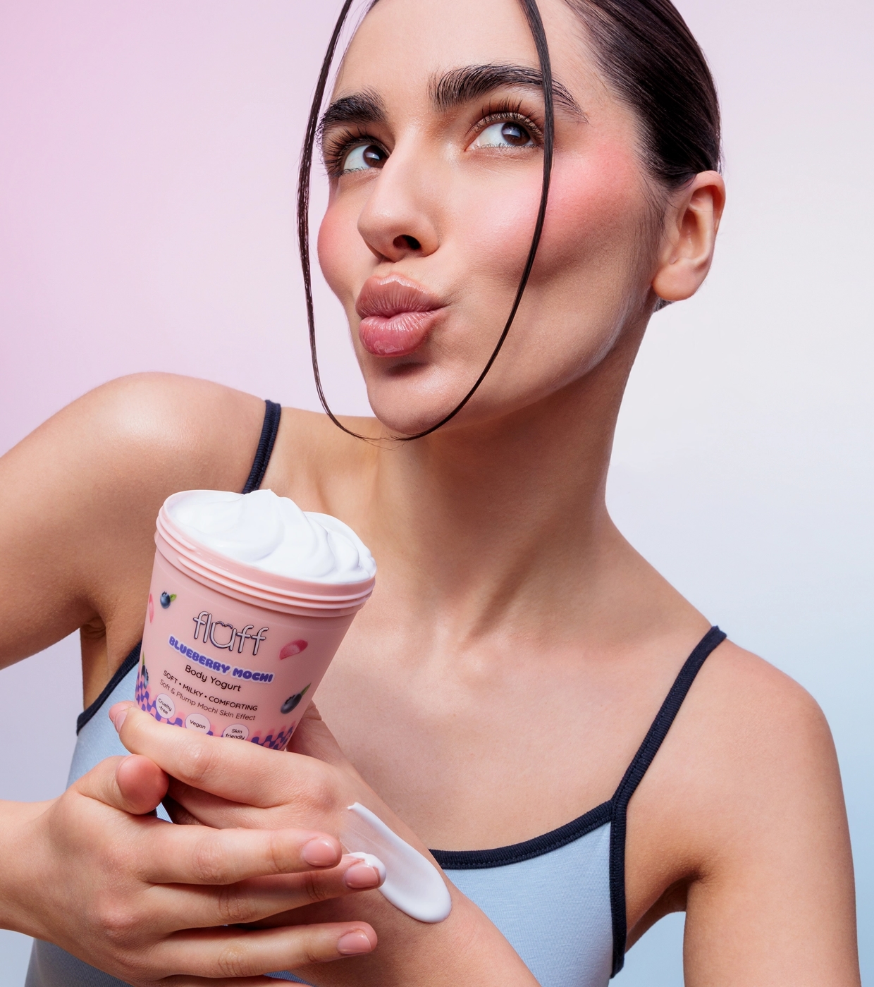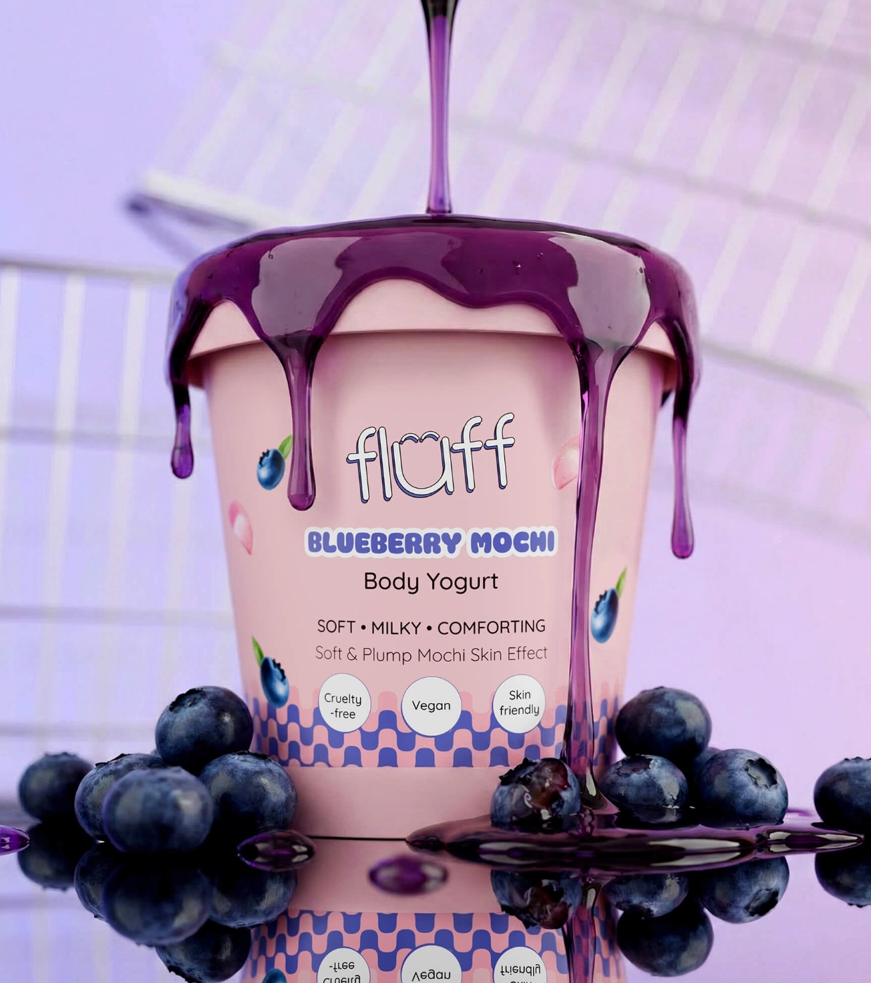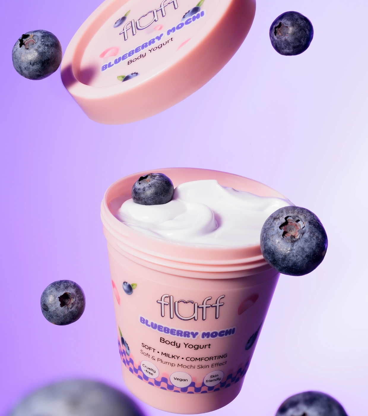 Trasforma la tua routine di cura del corpo in un momento di piacere con lo yogurt corpo Blueberry Mochi di Fluff , lo yogurt corpo che idrata, ammorbidisce e avvolge la tua pelle in un delizioso aroma dolce.