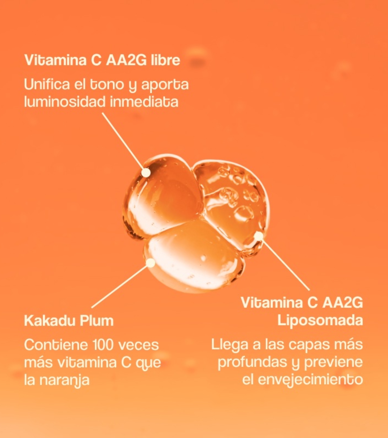 La sua formula combina vitamina C liposomiale AA2G (5%), vitamina C libera AA2G (5%) e prugna Kakadu, un principio attivo naturale con fino a 100 volte più vitamina C delle arance, ottenendo un'efficacia rassodante e luminosa intensificata e risultati visibili fin dal primo utilizzo.