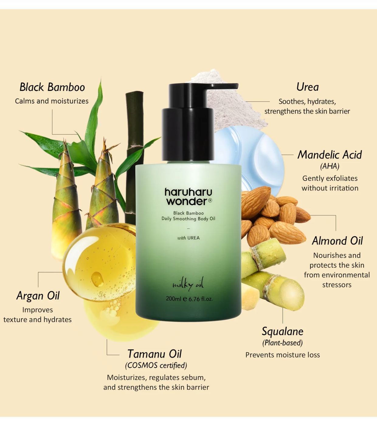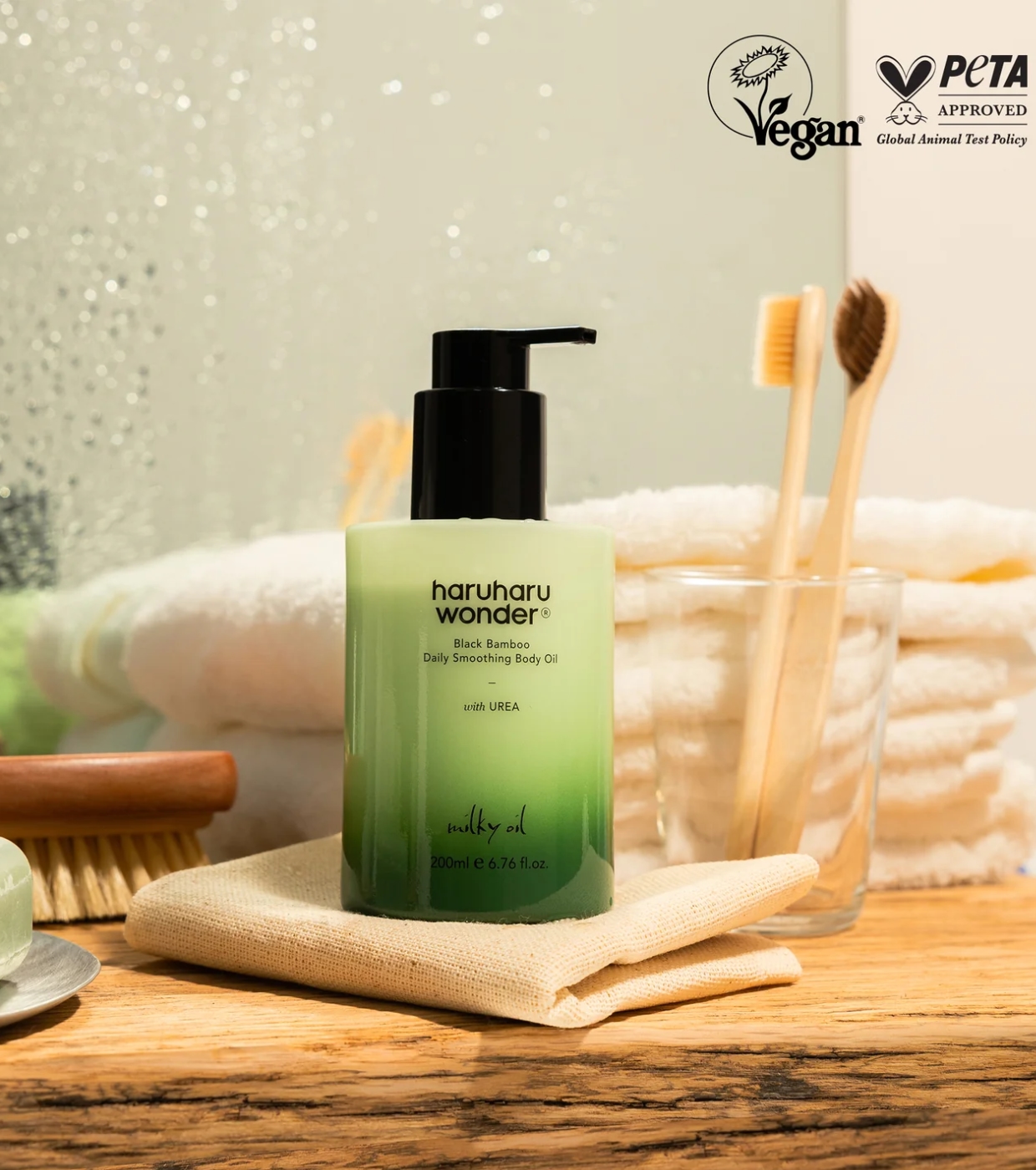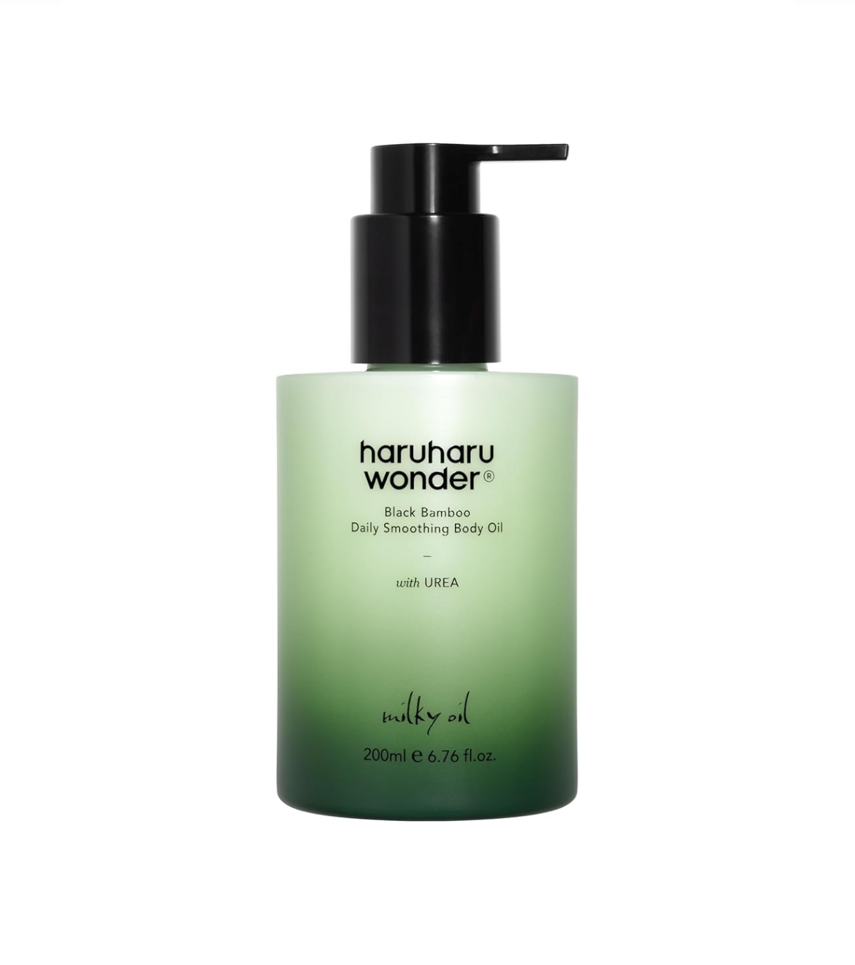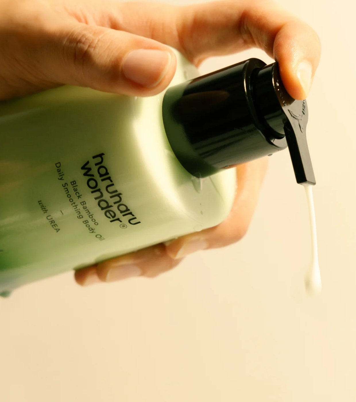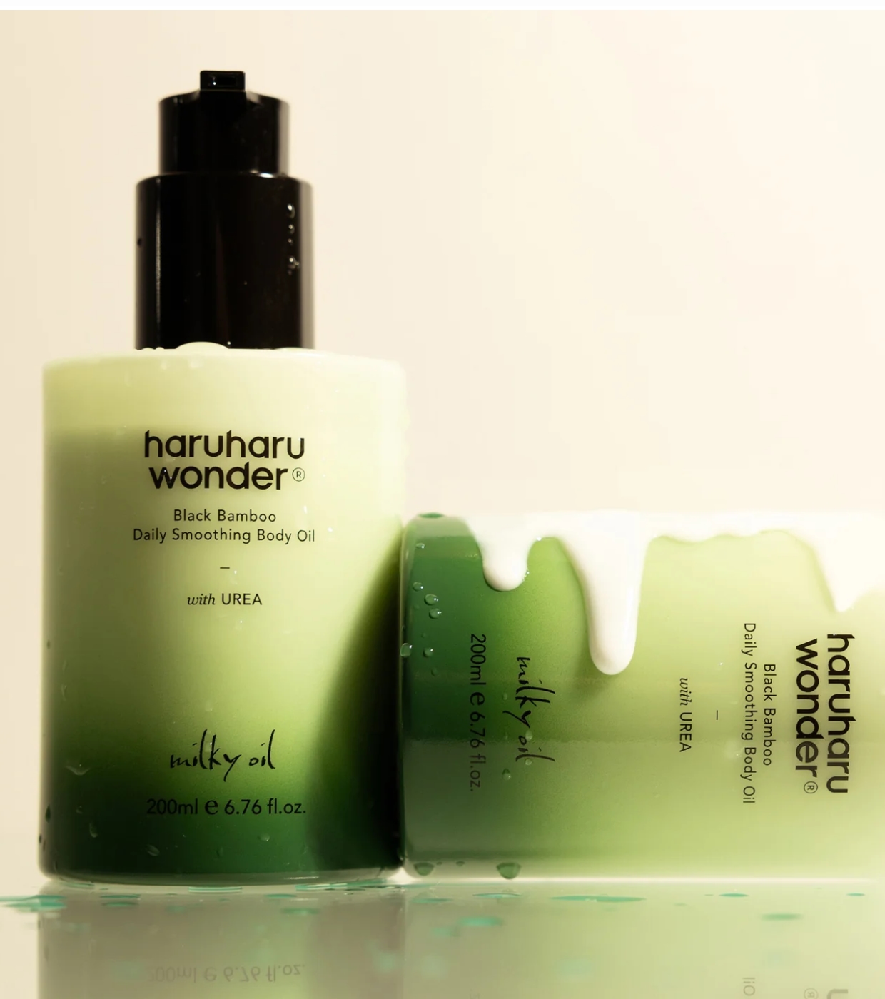 L'olio corpo Black Bamboo di Haruharu Wonder ha una texture lattiginosa, leggera e a rapido assorbimento che ammorbidisce e leviga la pelle senza lasciare una sensazione di unto.