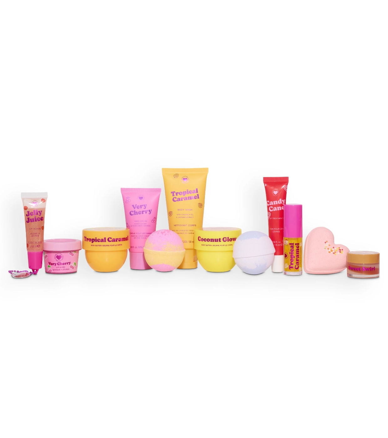 I HEART REVOLUTION TROPICAL CARAMEL BODY WASH (INGREDIENTS): AQUA (WATER, EAU), AMMONIUM LAURYL SULFATE, COCAMIDE MEA, GLYCOL DISTEARATE, HYDROXYETHYLCELLULOSE, PHENOXYETHANOL, PARFUM (FRAGRANCE), COCAMIDOPROPYL BETAINE, PEG-150 DISTEARATE, DISODIUM EDTA, ETHYLHEXYLGLYCERIN, SODIUM CHLORIDE, COCOS NUCIFERA (COCONUT) OIL, CAFFEINE, CYCLODEXTRIN, CITRIC ACID, CI 15510 (ORANGE 4), CI 19140 (YELLOW 5), CI 42090 (BLUE 1), CI 17200 (RED 33), BENZYL SALICYLATE. I HEART REVOLUTION COCONUT GLOW BODY BUTTER (INGREDIENTS): AQUA (WATER, EAU), CAPRYLIC/CAPRIC TRIGLYCERIDE, CETEARYL ALCOHOL, GLYCERIN, HELIANTHUS ANNUUS (SUNFLOWER) SEED OIL, BUTYROSPERMUM PARKII (SHEA) BUTTER, PALMITIC ACID, PEG-100 STEARATE, STEARIC ACID, PARFUM (FRAGRANCE), GLYCERYL STEARATE, PHENOXYETHANOL, ACRYLATES COPOLYMER, TRIETHANOLAMINE, POLYSORBATE 60, CARBOMER, CETEARETH-25, SYNTHETIC FLUORPHLOGOPITE, ETHYLHEXYLGLYCERIN, DISODIUM EDTA, SILICA, MACADAMIA TERNIFOLIA (MACADAMIA) SEED OIL, EUTERPE OLERACEA (ACAI) FRUIT OIL, COCOS NUCIFERA (COCONUT) OIL, TRIETHOXYCAPRYLYLSILANE, TIN OXIDE, BENZYL SALICYLATE, GERANIOL, LIMONENE, LINALOOL, CI 77891 (TITANIUM DIOXIDE), CI 19140 (YELLOW 5), CI 14700 (RED 4). I HEART REVOLUTION TROPICAL CARAMEL BODY BUTTER (INGREDIENTS): AQUA (WATER, EAU), CAPRYLIC/CAPRIC TRIGLYCERIDE, CETEARYL ALCOHOL,GLYCERIN, HELIANTHUS ANNUUS (SUNFLOWER) SEED OIL, BUTYROSPERMUM PARKII (SHEA) BUTTER, PALMITIC ACID, PEG-100 STEARATE, STEARIC ACID, PARFUM (FRAGRANCE), GLYCERYL STEARATE, PHENOXYETHANOL, ACRYLATES COPOLYMER, TRIETHANOLAMINE, POLYSORBATE 60, CARBOMER, CETEARETH-25, ETHYLHEXYLGLYCERIN, DISODIUM EDTA, COCOS NUCIFERA (COCONUT) OIL, CAFFEINE, CYCLODEXTRIN, COCOS NUCIFERA (COCONUT) FRUIT EXTRACT, BENZYL ALCOHOL, BENZYL SALICYLATE, COUMARIN, LIMONENE, CI 19140 (YELLOW 5), CI 17200 (RED 33). I HEART REVOLUTION VERY CHERRY HAND CREAM (INGREDIENTS): AQUA (WATER, EAU), CAPRYLIC/CAPRIC TRIGLYCERIDE, ETHYLHEXYL PALMITATE, CETEARYL ALCOHOL, PALMITIC ACID, PEG-100 STEARATE, BUTYROSPERMUM PARKII (SHEA) BUTTER, GLYCERIN, STEARIC ACID, PARFUM (FRAGRANCE), GLYCERYL STEARATE, PHENOXYETHANOL, TRIETHANOLAMINE, CARBOMER, ACRYLATES COPOLYMER, ETHYLHEXYLGLYCERIN, CETEARETH-25, DISODIUM EDTA, TETRAMETHYL ACETYLOCTAHYDRONAPHTHALENES, HEXAMETHYLINDANOPYRAN, COUMARIN, VANILLIN, BENZALDEHYDE, TRIMETHYLCYCLOPENTENYL METHYLISOPENTENOL, POGOSTEMON CABLIN OIL, ANISE ALCOHOL. I HEART REVOLUTION TROPICAL CARAMEL BATH FIZZER (INGREDIENTS): SODIUM BICARBONATE, CITRIC ACID, SODIUM SULFATE, SODIUM CARBONATE, PENTASODIUM TRIPHOSPHATE, CELLULOSE GUM, PEG-400, SODIUM CHLORIDE, PARFUM (FRAGRANCE), SODIUM C14-16 OLEFIN SULFONATE, DENATONIUM BENZOATE, CI 45410 (RED 28 LAKE), CI 14700 (RED 4), CI 19140 (YELLOW 5), CI 15985 (YELLOW 6). I HEART REVOLUTION SWEET DREAMS BATH FIZZER (INGREDIENTS): SODIUM BICARBONATE, CITRIC ACID, SODIUM SULFATE, SODIUM CARBONATE, PENTASODIUM TRIPHOSPHATE, CELLULOSE GUM, PEG-400, PARFUM (FRAGRANCE), SODIUM C14-16 OLEFIN SULFONATE, DENATONIUM BENZOATE, BENZYL ALCOHOL, BENZYL BENZOATE, HEXYL CINNAMAL, LINALOOL, CI 42090 (BLUE 1), CI 17200 (RED 33). I HEART REVOLUTION HEART BATH FIZZER (INGREDIENTS): SODIUM BICARBONATE, CITRIC ACID, SODIUM SULFATE, SODIUM CARBONATE, PENTASODIUM TRIPHOSPHATE, CELLULOSE GUM, PEG-400, PARFUM (FRAGRANCE), SODIUM C14-16 OLEFIN SULFONATE, SUCROSE, GLUCOSE, ZEA MAYS (CORN) STARCH, DENATONIUM BENZOATE, BENZYL ALCOHOL, BENZYL BENZOATE, CI 19140 (YELLOW 5), CI 17200 (RED 33), CI 14700 (RED 4), CI 15985 (YELLOW 6). I HEART REVOLUTION JELLY JUICE STRAWBERRY SHIMMER (INGREDIENTS): TRIDECYL TRIMELLITATE, PHENYL TRIMETHICONE, BIS-DIGLYCERYL POLYACYLADIPATE-2, ISONONYL ISONONANOATE, SILICA DIMETHYL SILYLATE, POLYHYDROXYSTEARIC ACID, BUTYROSPERMUM PARKII (SHEA) BUTTER, ARGANIA SPINOSA KERNEL OIL, TOCOPHERYL ACETATE, POLYISOBUTENE, SYNTHETIC FLUORPHLOGOPITE, PHENOXYETHANOL, PARFUM (FRAGRANCE), TIN OXIDE, MENTHOL, MENTHA PIPERITA OIL, CI 77891 (TITANIUM DIOXIDE), CI 42090 (BLUE 1 LAKE), CI 19140 (YELLOW 5LAKE), CI 77491 (IRON OXIDES), CI 77492 (IRON OXIDES), CI 77499 (IRON OXIDES), CI 15850 (RED 7 LAKE), CI 45380 (RED 21 LAKE), CI 45410 (RED 27 LAKE), CI 15850 (RED 6 LAKE), CI 16035 (RED 40 LAKE). I HEART REVOLUTION SWEET SWIRL LIP BALM CINNAMON SWIRL (INGREDIENTS): HYDROGENATED POLYDECENE, POLYISOBUTENE, QUATERNIUM-18 BENTONITE, SYNTHETIC WAX, TRIDECYL TRIMELLITATE, ETHYLHEXYL PALMITATE, PHENOXYETHANOL, PARFUM (FRAGRANCE), BENZYL ALCOHOL, CITRAL, COUMARIN, BENZALDEHYDE, HEXAMETHYLINDANOPYRAN, TETRAMETHYL ACETYLOCTAHYDRONAPHTHALENES, VANILLIN, CITRUS AURANTIUM PEEL OIL, CI 77891 (TITANIUM DIOXIDE), CI 42090 (BLUE 1 LAKE), CI 19140 (YELLOW 5 LAKE), CI 77491 (IRON OXIDES), CI 77492 (IRON OXIDES), CI 77499 (IRON OXIDES), CI 15850 (RED 7 LAKE), CI 15850 (RED 6 LAKE), CI 16035 (RED 40 LAKE), CI 45380 (RED 21 LAKE), CI 45410 (RED 27 LAKE). I HEART REVOLUTION VERY CHERRY LIP MASK (INGREDIENTS): BIS-DIGLYCERYL POLYACYLADIPATE-2, ARGANIA SPINOSA KERNEL OIL, MAGNESIUM STEARATE, BUTYROSPERMUM PARKII (SHEA BUTTER), DIMETHICONE, SORBITAN SESQUIOLEATE, SYNTHETIC WAX, SILICA, TRIDECYL TRIMELLITATE, PHENOXYETHANOL, PARFUM (FRAGRANCE), BENZALDEHYDE, LINALOOL, TERPINEOL, CI 77891 (TITANIUM DIOXIDE), CI 15850 (RED 7 LAKE), CI 45410 (RED 27 LAKE), CI 45380 (RED 21/22 LAKE), CI 42090 (BLUE 1 LAKE), CI 15850 (RED 6 LAKE), CI 16035 (RED 40 LAKE), CI 19140 (YELLOW 5 LAKE), CI 77491 (IRON OXIDES), CI 77492 (IRON OXIDES), CI 77499 (IRON OXIDES). I HEART REVOLUTION CANDY CANE LIP TREATMENT (INGREDIENTS): TRIDECYL TRIMELLITATE, POLYISOBUTENE, BIS-DIGLYCERYL POLYACYLADIPATE-2, SYNTHETIC FLUORPHLOGOPITE, PHENOXYETHANOL, PARFUM (FRAGRANCE), TIN OXIDE, LIMONENE, LINALOOL,CITRAL, VANILLIN, CI 77891 (TITANIUM DIOXIDE), CI 42090 (BLUE 1 LAKE), CI 19140 (YELLOW 5 LAKE), CI 77491(IRON OXIDES), CI 77492 (IRON OXIDES), CI 77499 (IRON OXIDES), CI 15850 (RED 7 LAKE), CI 45380 (RED 21 LAKE), CI 45410 (RED 27 LAKE), CI 15850 (RED 6 LAKE), CI 16035 (RED 40 LAKE). I HEART REVOLUTION TROPICAL CARAMEL LIP OIL (INGREDIENTS): TRIDECYL TRIMELLITATE, POLYISO
