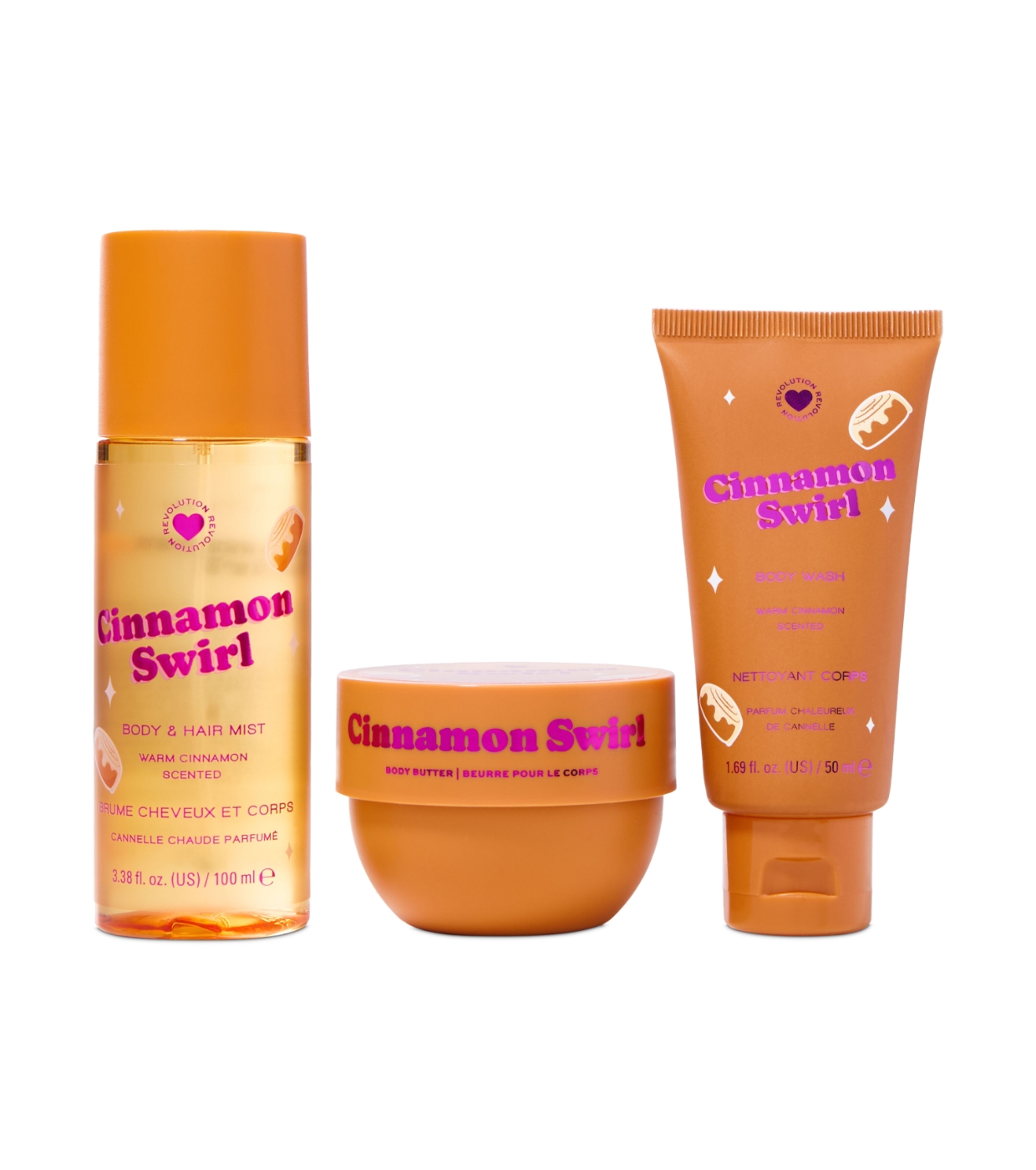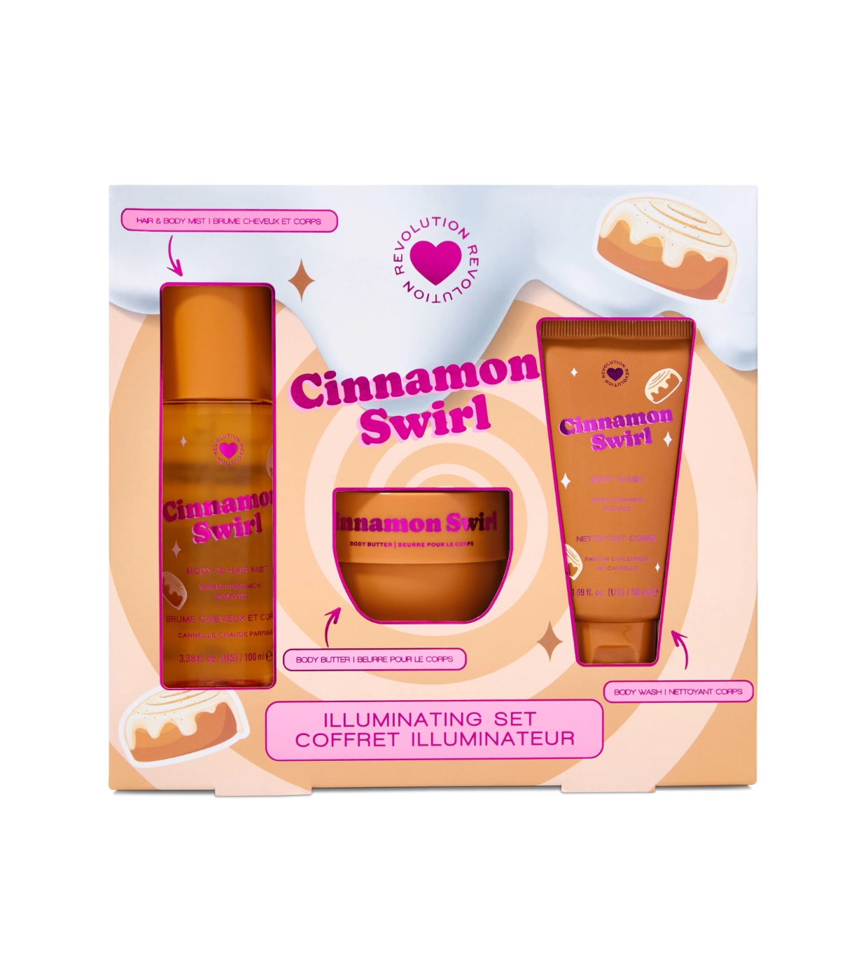 Regalate alla vostra pelle un vero piacere con il I Heart Revolution Cinnamon Swirl Gift Set, un trio di prodotti per il corpo con un irresistibile profumo di cannella, burro alla vaniglia e caramello salato.