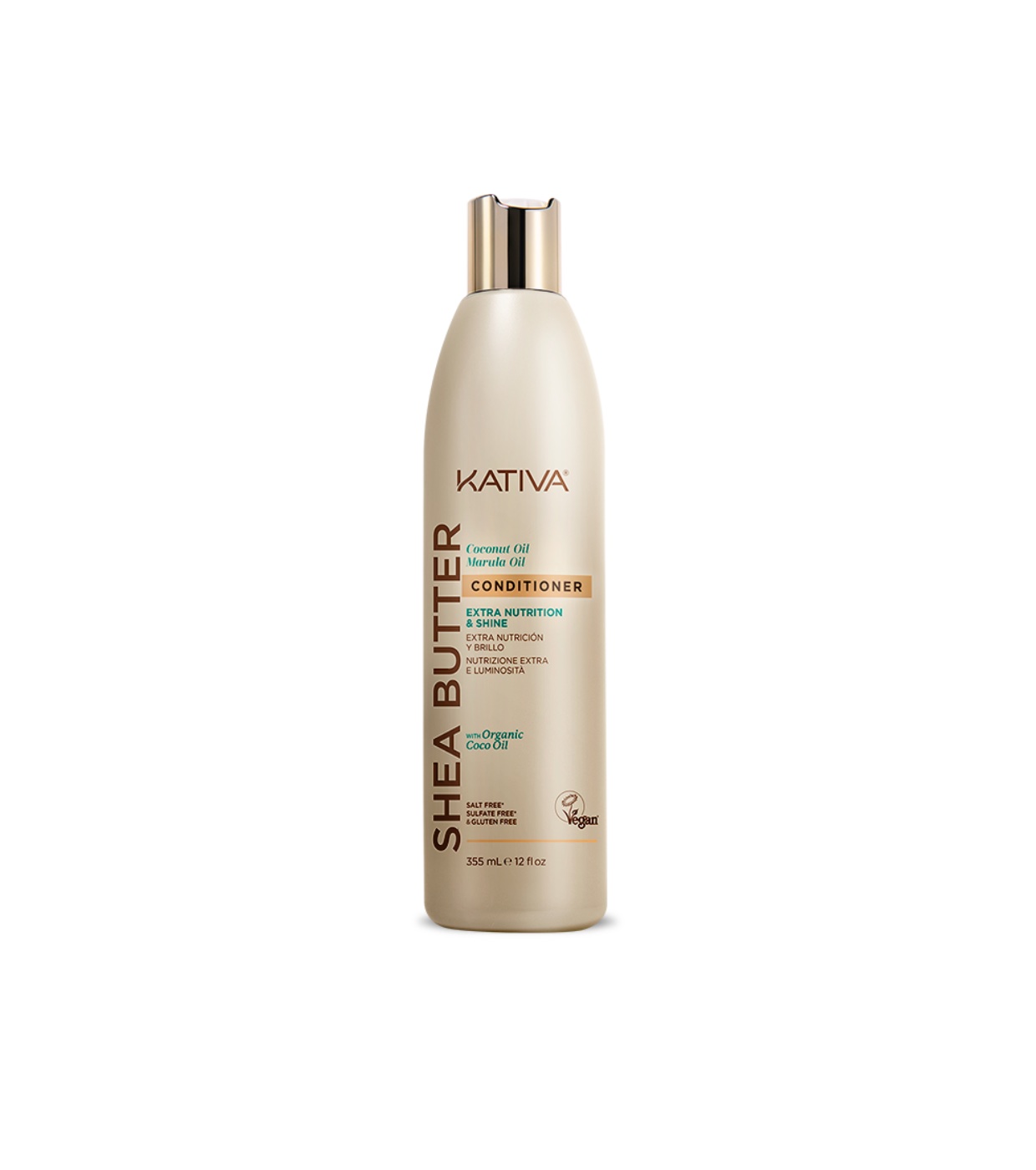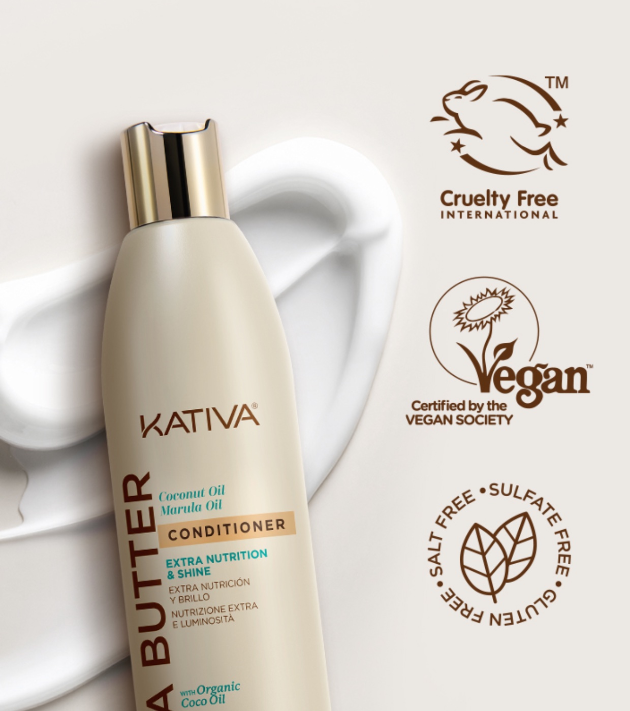 Il balsamo al burro di karité, olio di cocco e marula di Kativa è formulato per nutrire intensamente e restituire lucentezza ai capelli opachi e danneggiati.