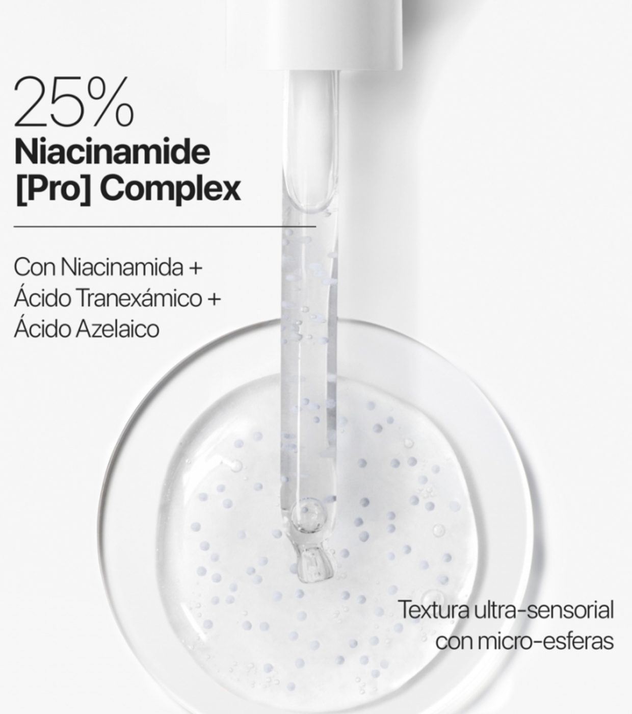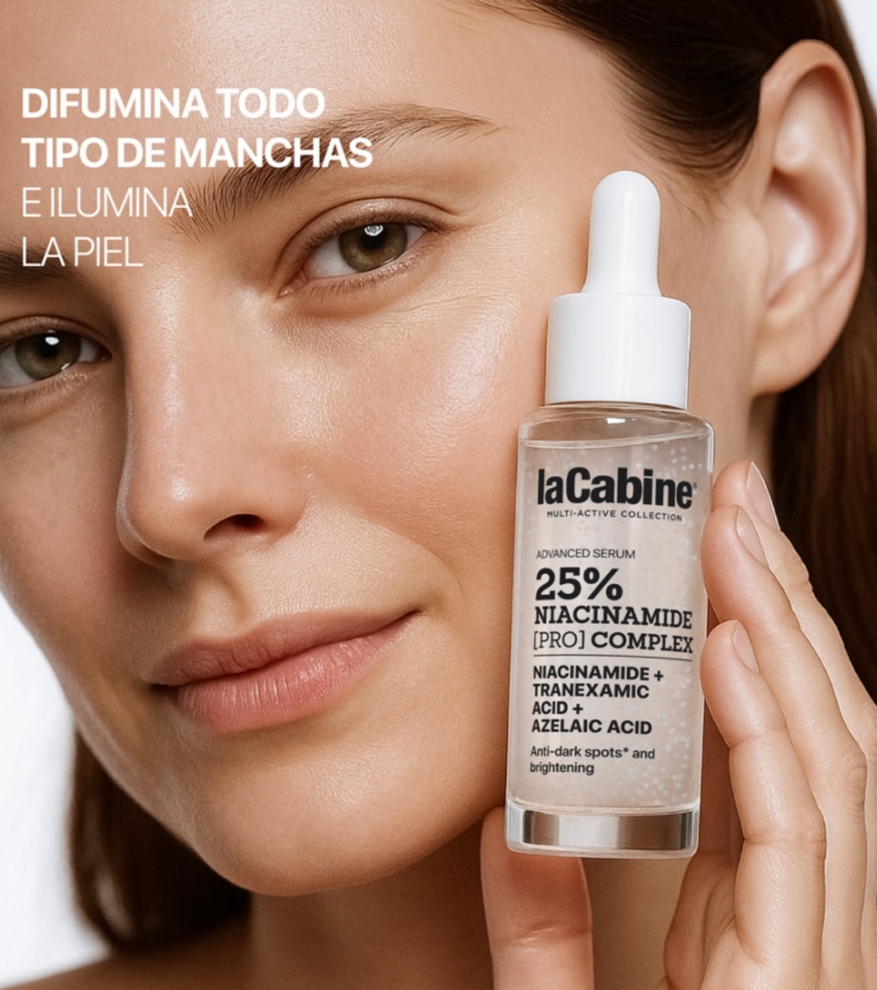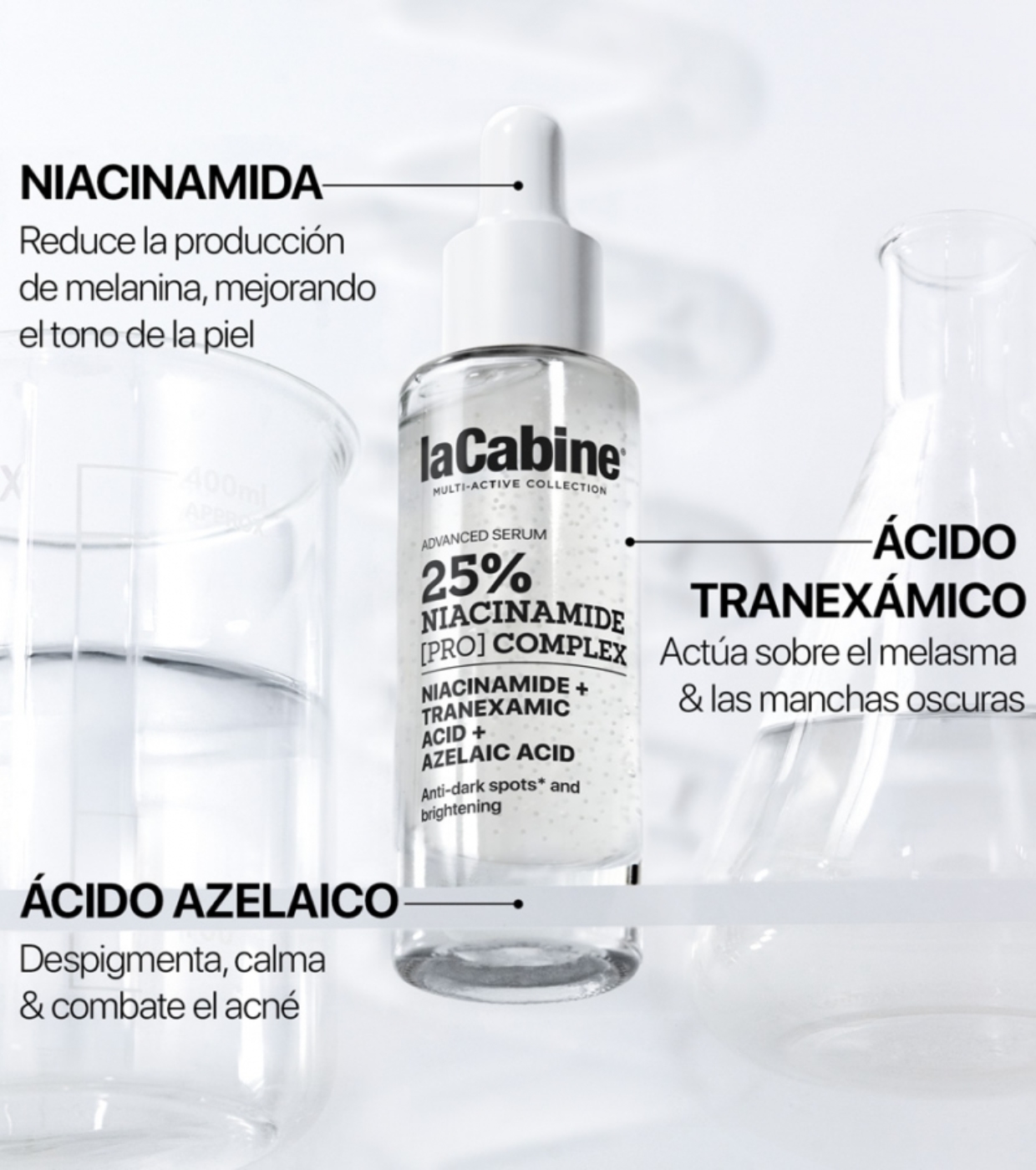 Questo siero avanzato 25% Niacinamide Pro Complex di La Cabine combina un 25% di Niacinamide Pro Complex, acido tranexamico e acido azelaico per trattare efficacemente tutti i tipi di macchie scure e rivelare un incarnato più uniforme, luminoso e sano.