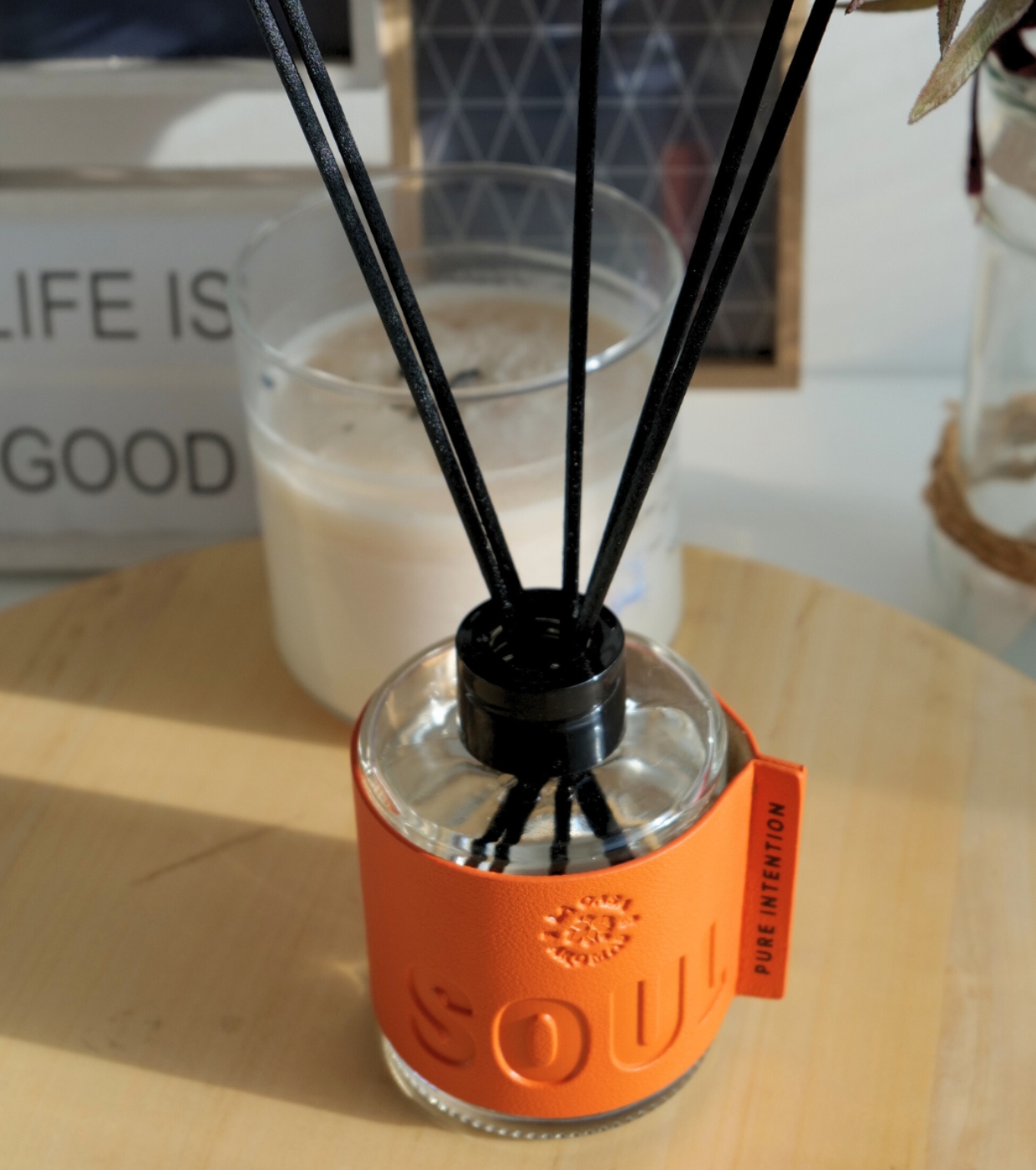 Le sue bottiglie dalle linee pulite e dalla finitura effetto pelle eliminano gli elementi superflui per mettere in risalto come protagonisti il materiale, il colore e l'aroma.