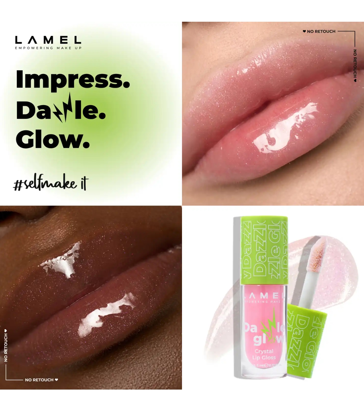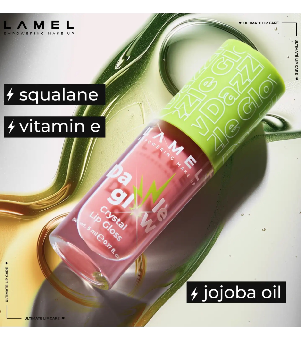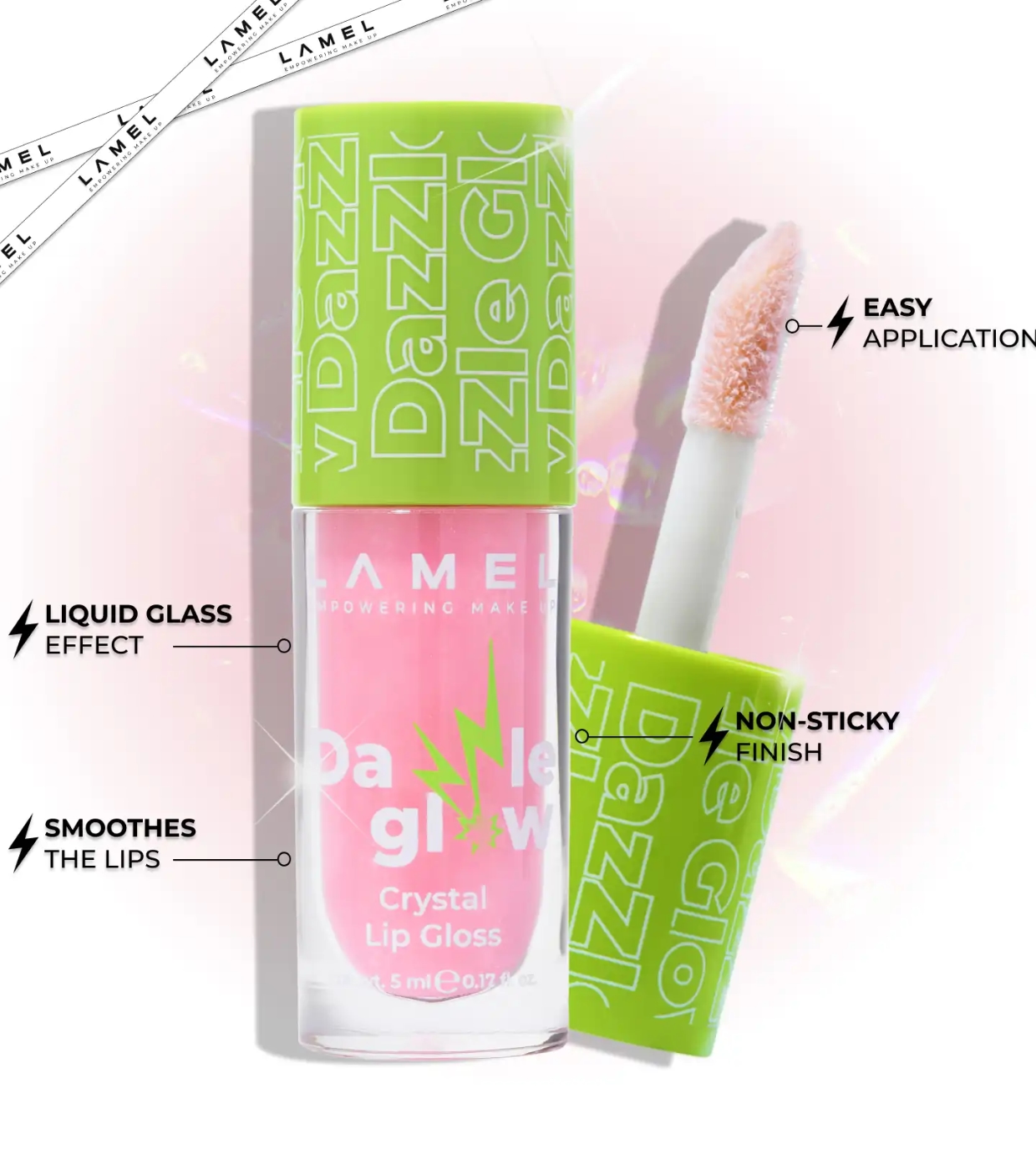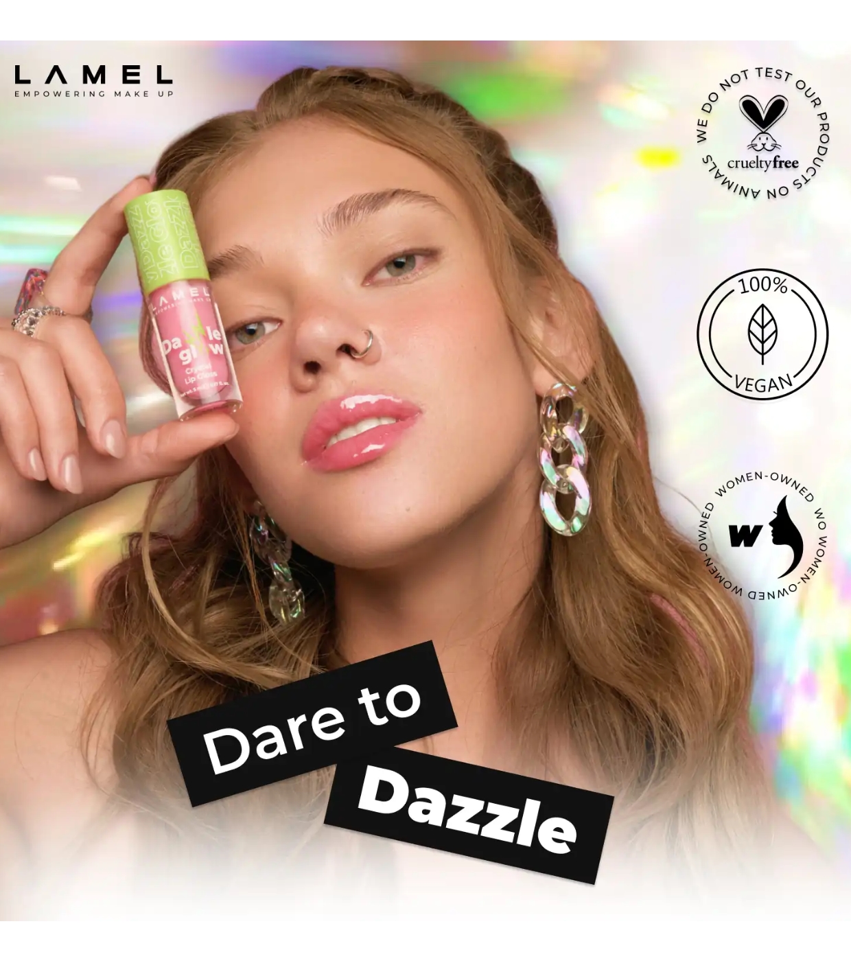 Preparatevi a labbra irresistibili con il Dazzle Glow Crystal Lip Gloss di Lamel , un lucidalabbra che impreziosisce all'istante qualsiasi look.