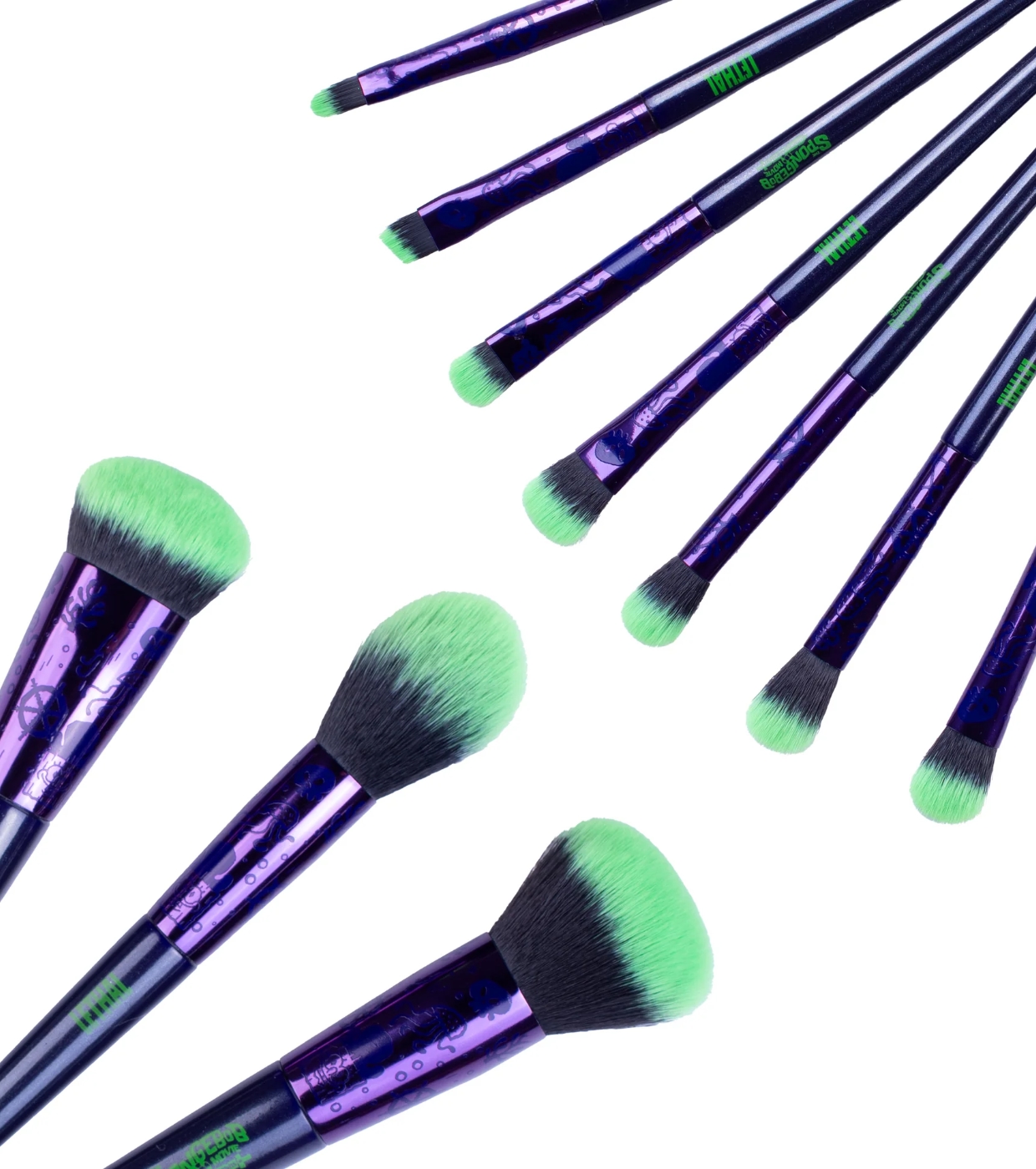 Include 10 pennelli vegani con setole che sfumano dal verde al nero, dettagli del marchio in lamina verde neon e un design esclusivo che riflette l'oscurità e il mistero degli Inferi, offrendo una finitura lussuosa e di alta qualità.