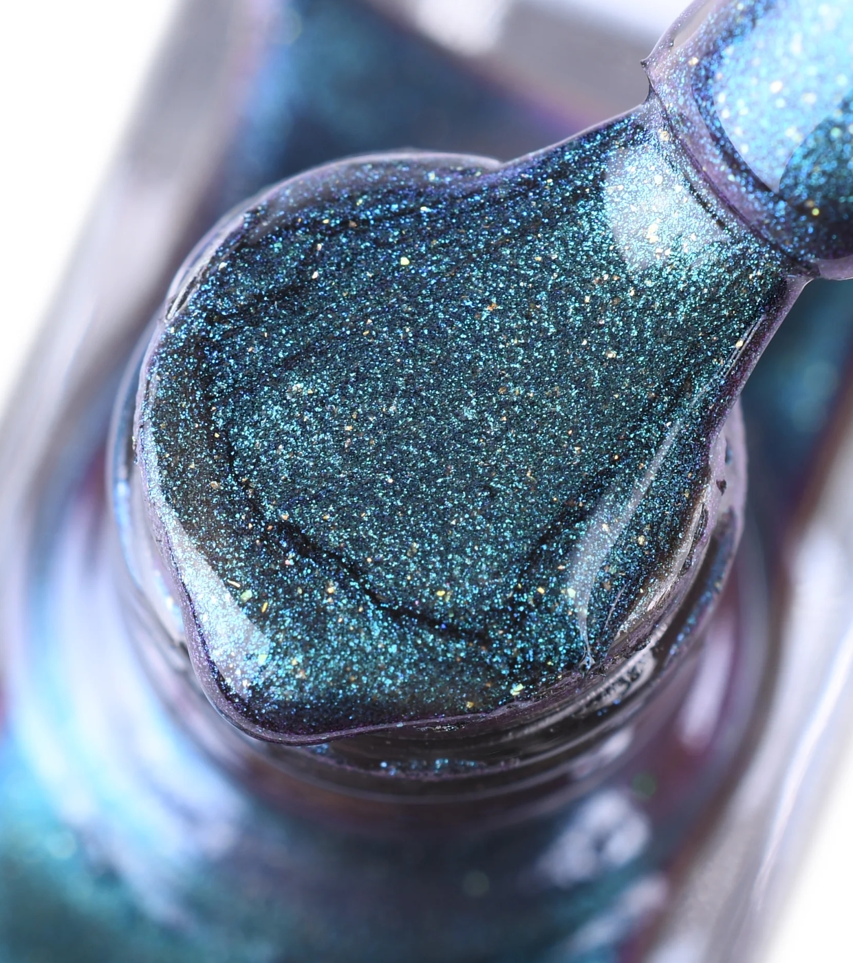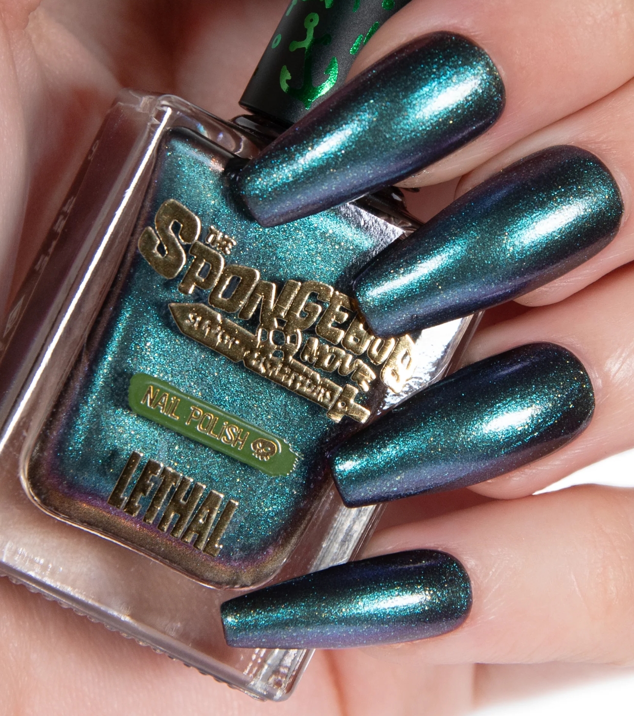 Underworld di Lethal Cosmetics presenta una base blu intenso arricchita da un ipnotico effetto magnetico multicolore nelle tonalità del verde, blu e viola, sormontato da un luccichio verde acqua che imita il bagliore del plancton bioluminescente che fluttua negli abissi.