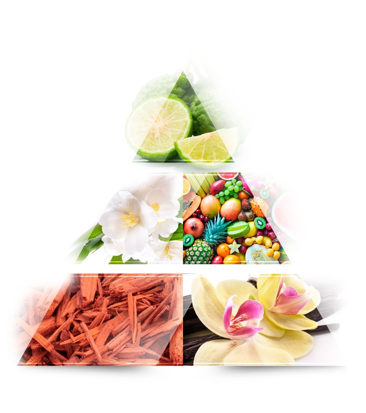 Nel suo cuore, i frutti tropicali si fondono con un delicato accordo floreale di gelsomino e violetta, creando un equilibrio tra freschezza e morbidezza. Nel fondo, note di sandalo, cashmere, ambra grigia e vaniglia aggiungono profondità, sensualità e una scia persistente.