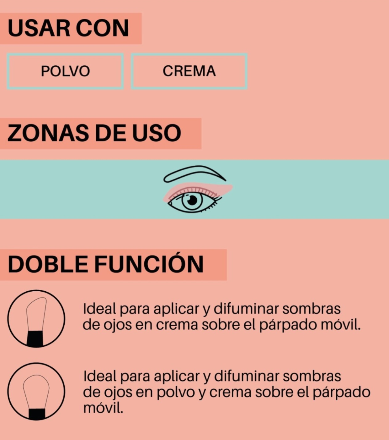- Punta obliqua: applica e sfuma l'ombretto in crema sulla palpebra mobile. Applica il correttore sotto gli occhi o sulle piccole imperfezioni.