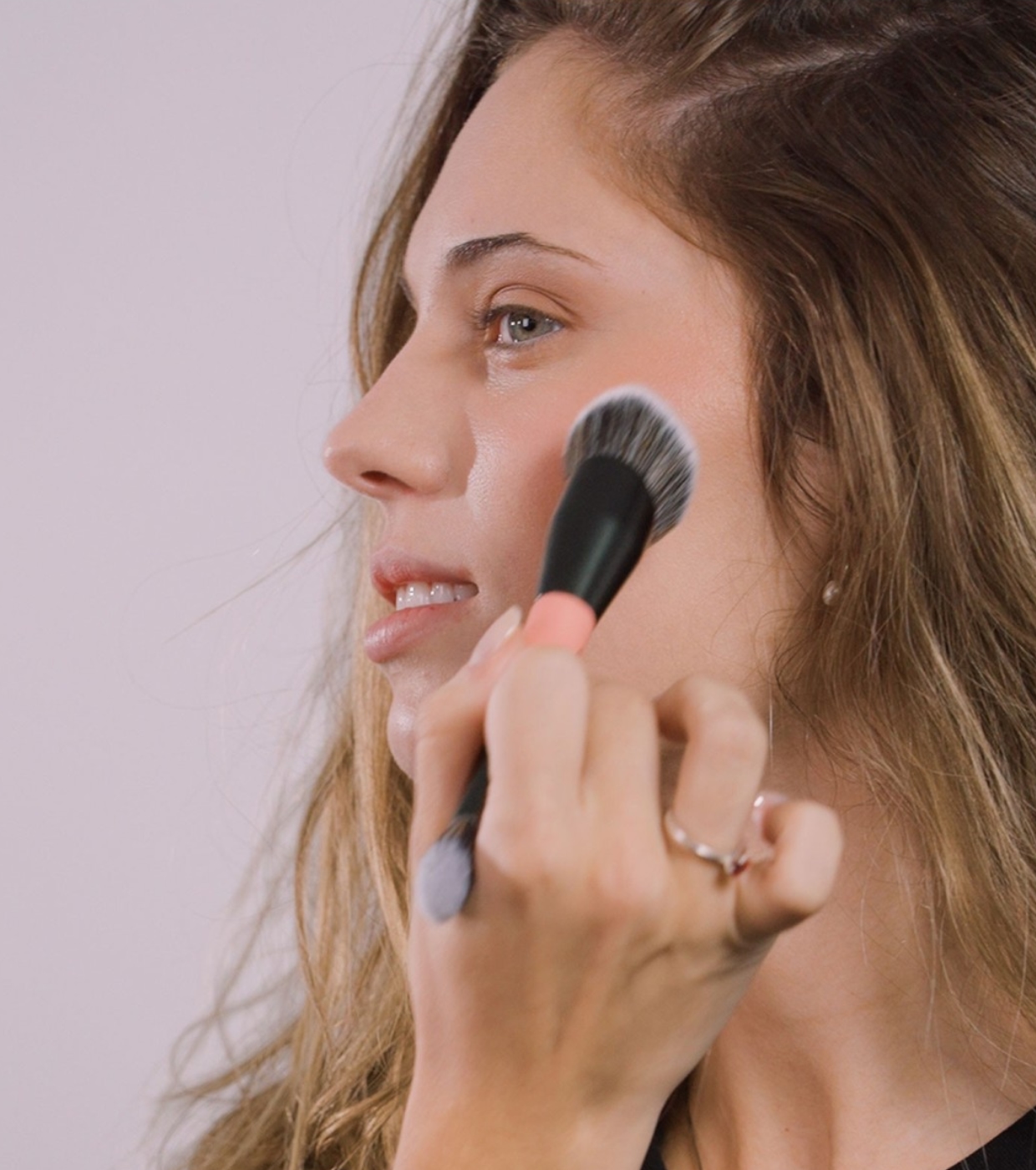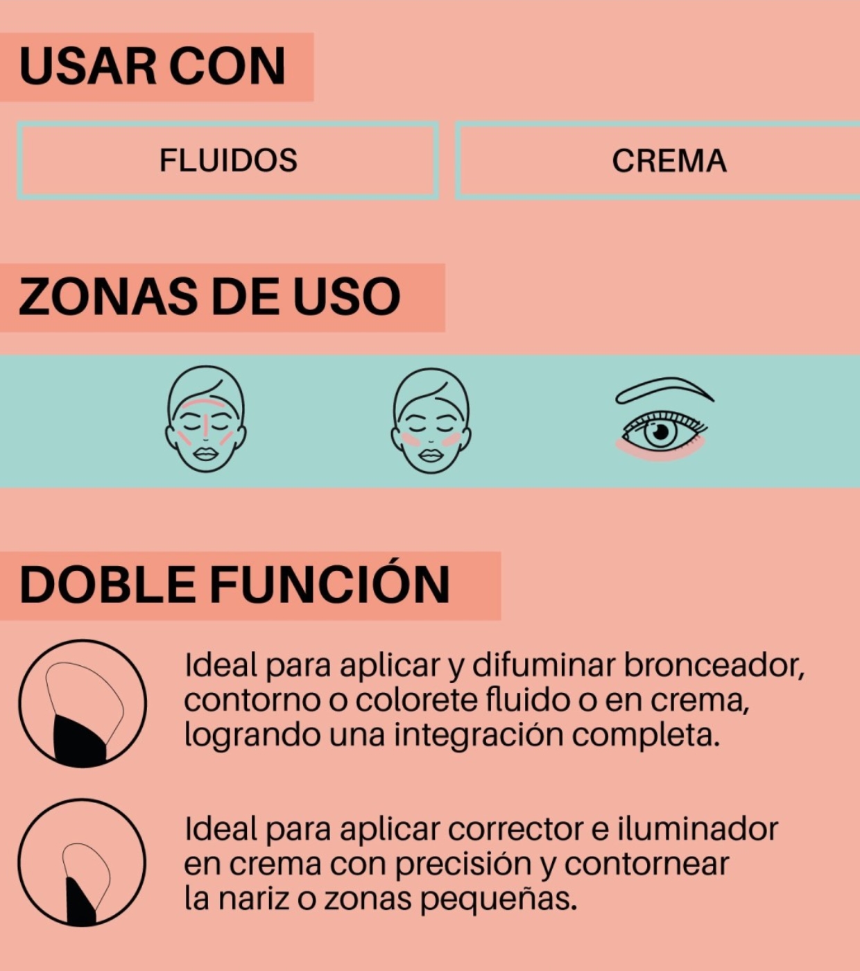 - Estremità larga: applica e sfuma la terra abbronzante o il contouring in crema grazie alla sua forma smussata. Applica il blush liquido o in crema picchiettando leggermente.