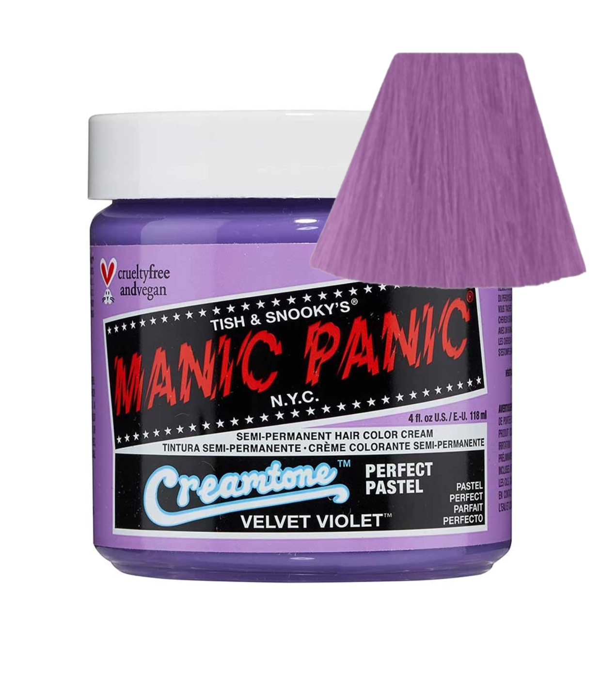 La tinta Manic Panic High Voltage nella tonalità Velvet Violet è una tinta semipermanente vegana per capelli fantasy con una delicata finitura malva viola pastello.