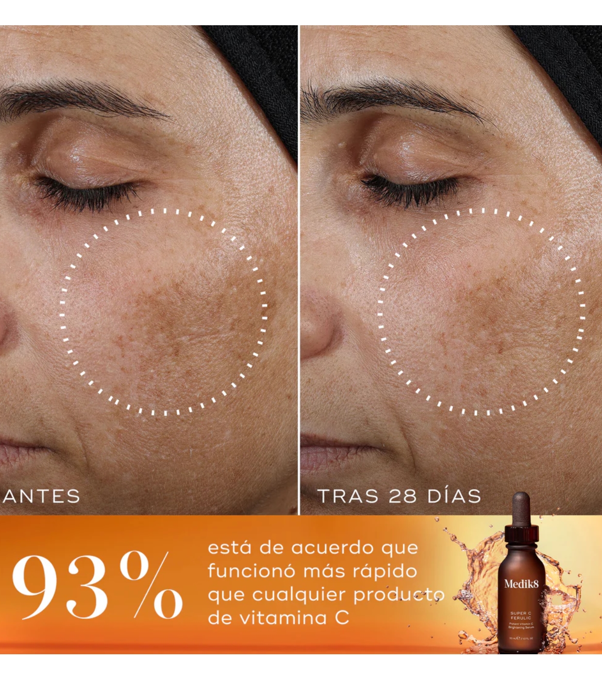 Super C Ferulic™ di Medik8 è il siero illuminante alla vitamina C più potente del marchio, formulato per combattere efficacemente i 4 segni dell'invecchiamento solare avanzato: rughe, macchie scure, perdita di tonicità e tono non uniforme*.