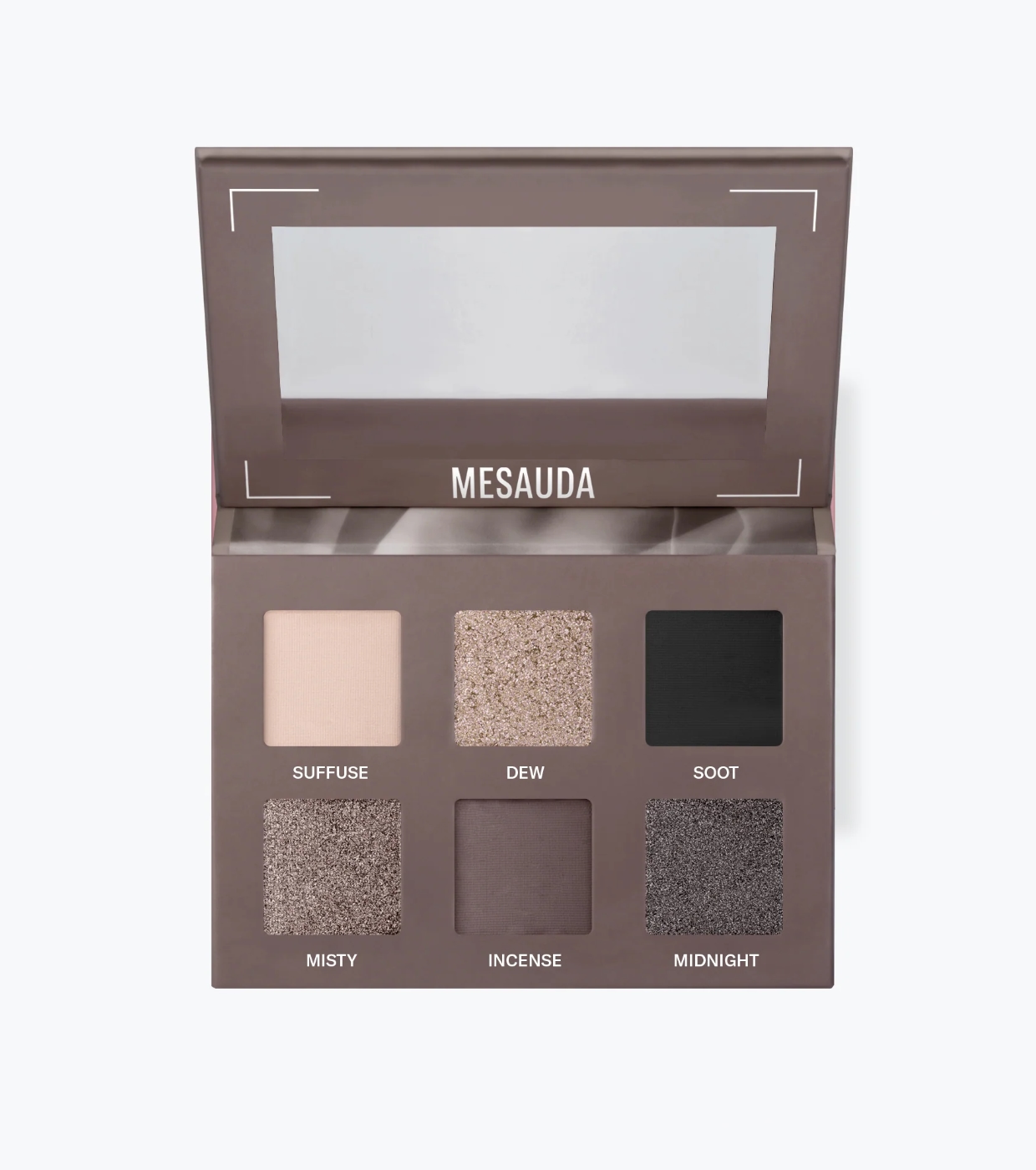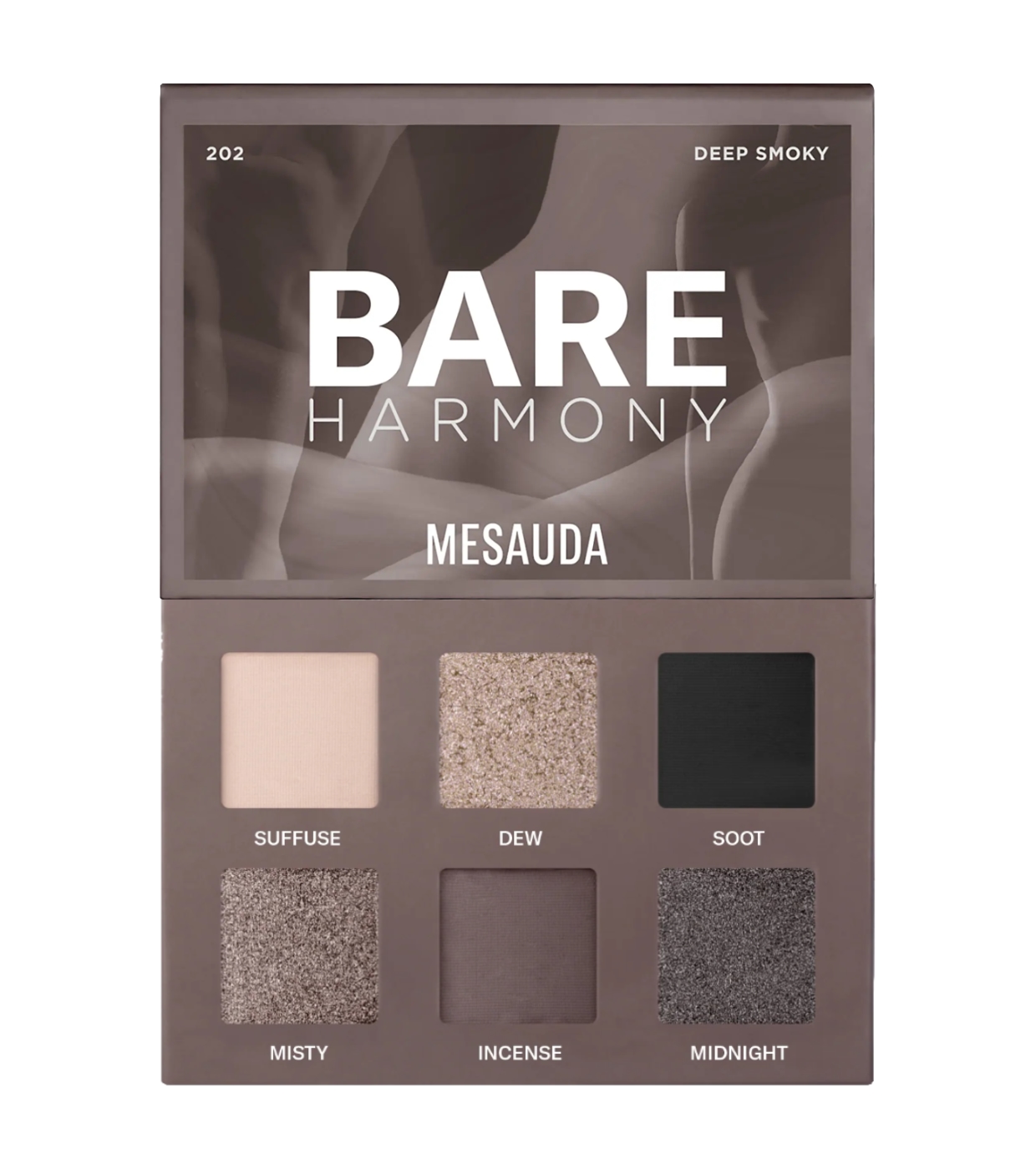 La palette di ombretti Bare Harmony 2.0 di Mesauda presenta un'elegante gamma di grigi, dal bianco al nero, con riflessi unici che valorizzano gli occhi.