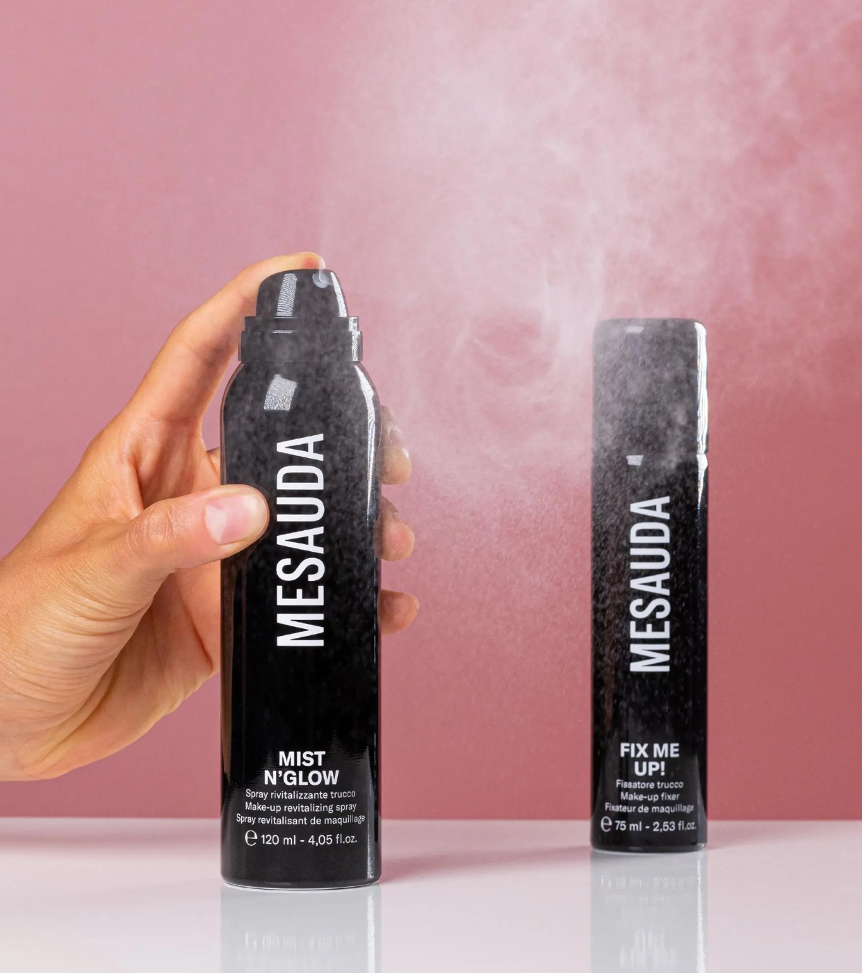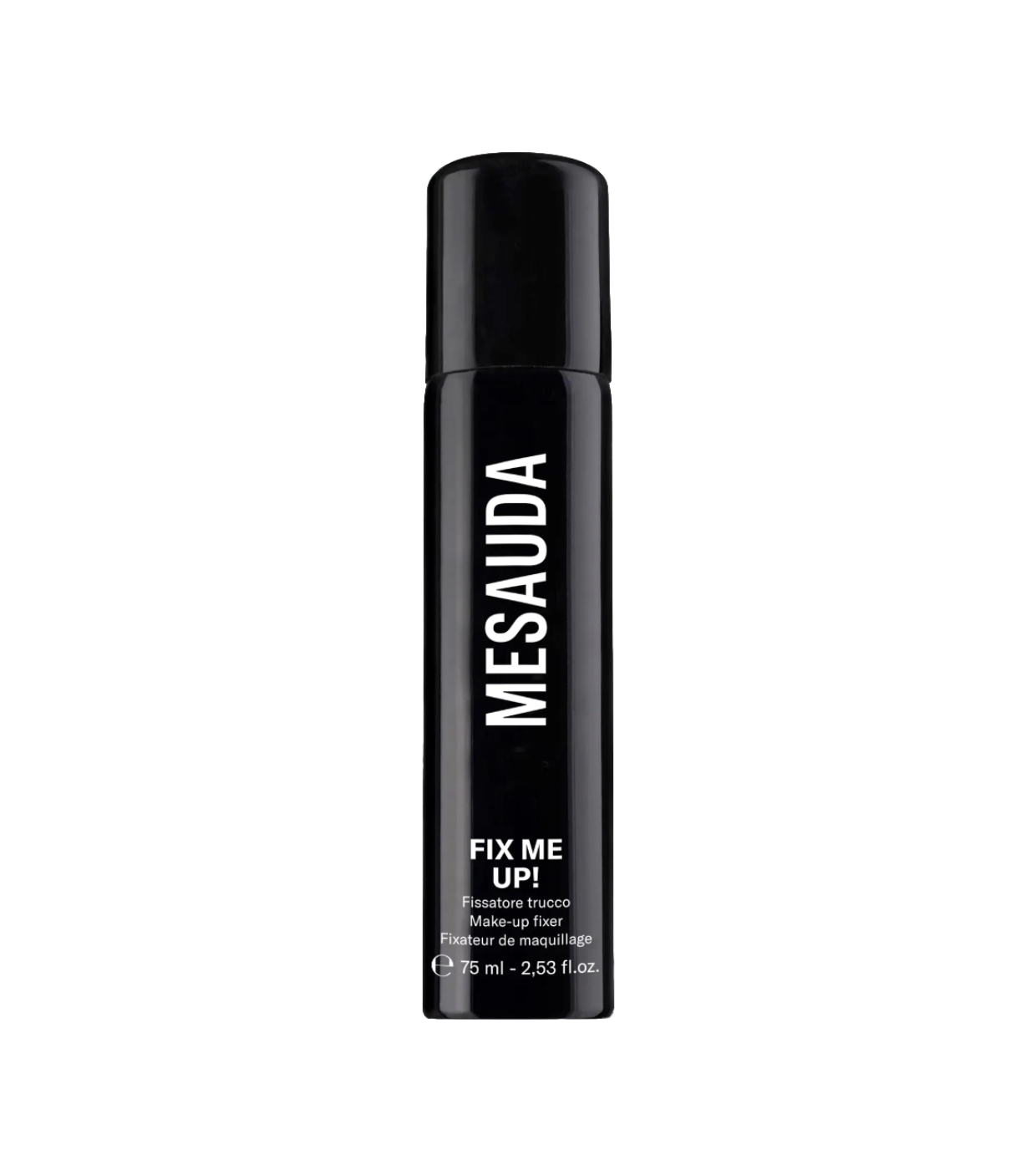 Fix Me Up! di Mesauda è uno spray fissante per il trucco che crea un sottile film protettivo sulla pelle, fissando il trucco per tutto il giorno senza alterarne la finitura.
