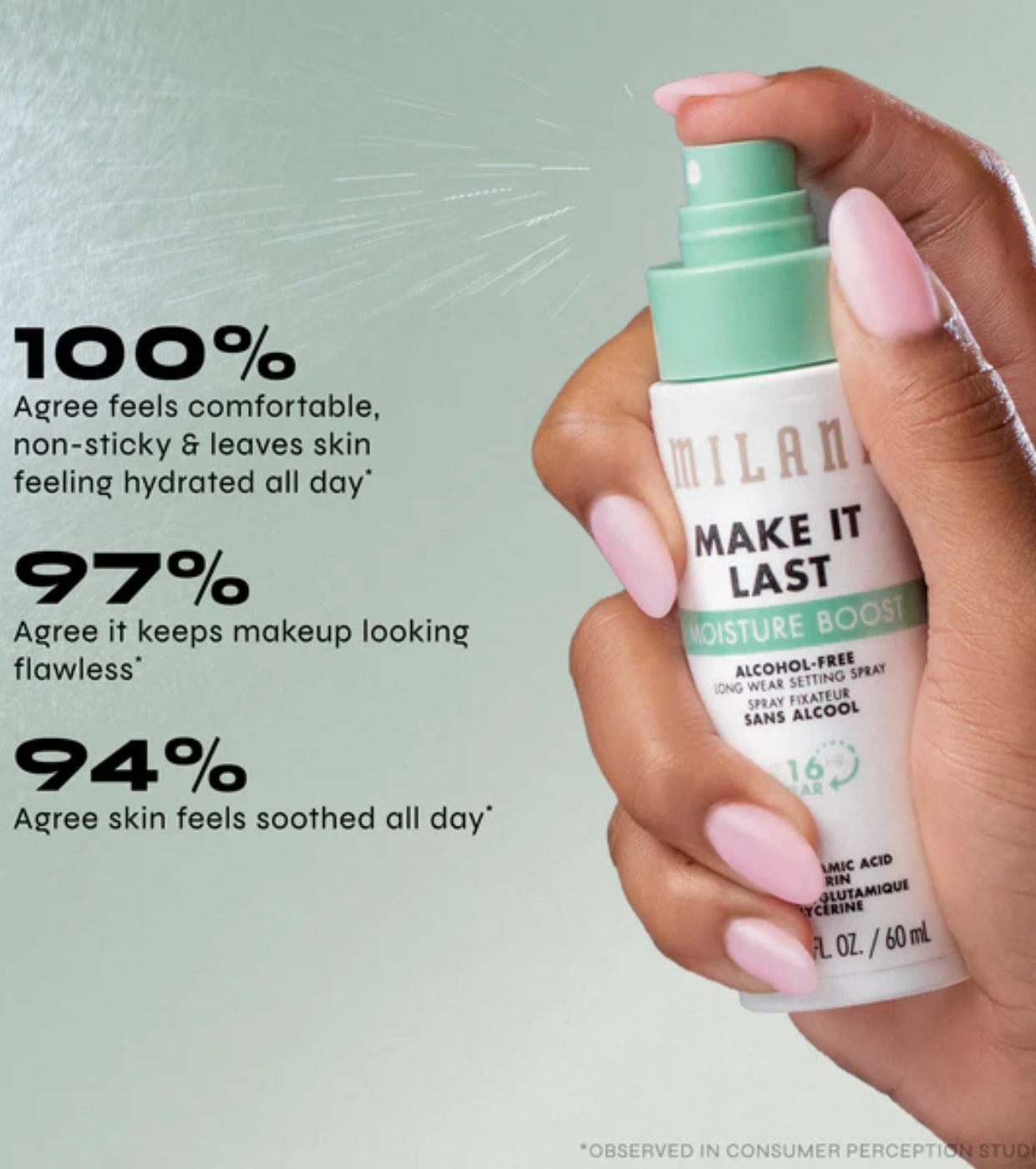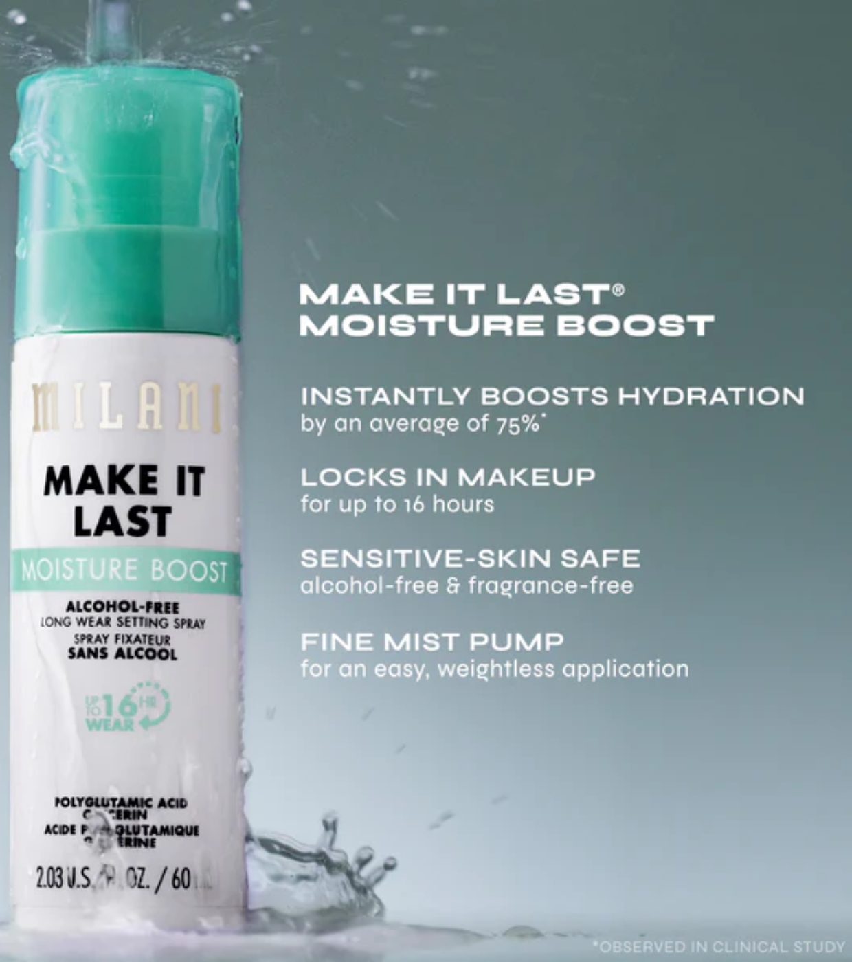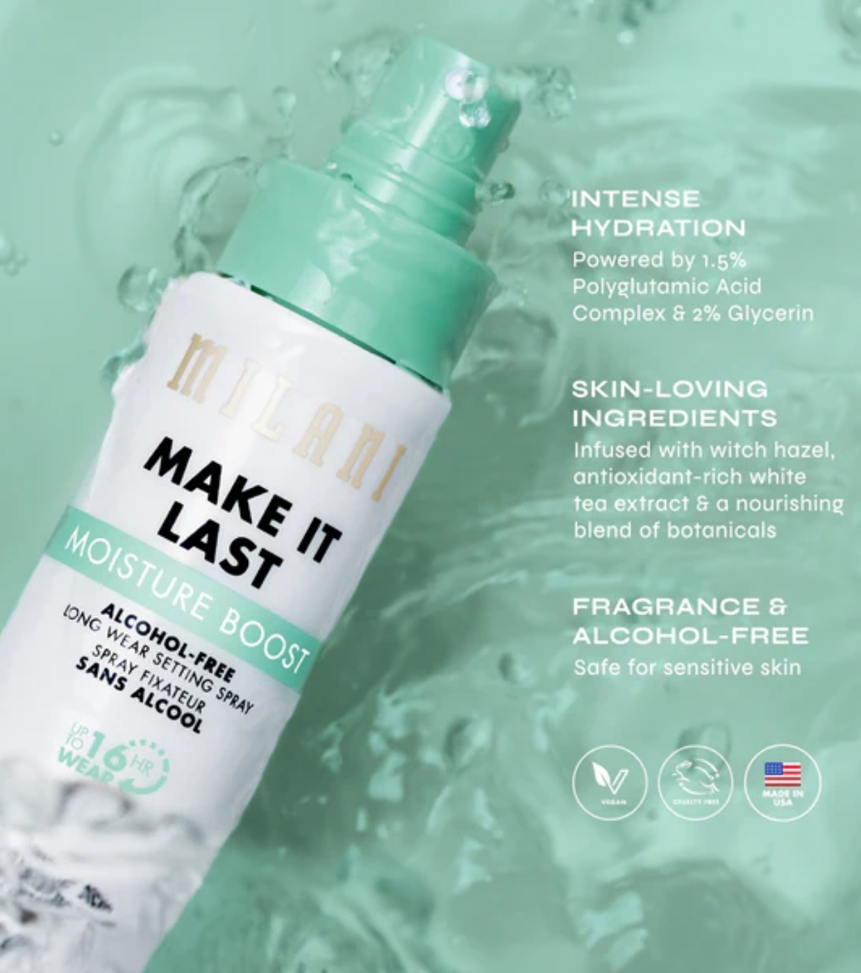 Senza profumo, adatto alle pelli sensibili e resistente all'acqua, fissa il trucco fino a 16 ore con una nebulizzazione ultra fine, leggera e non appiccicosa.