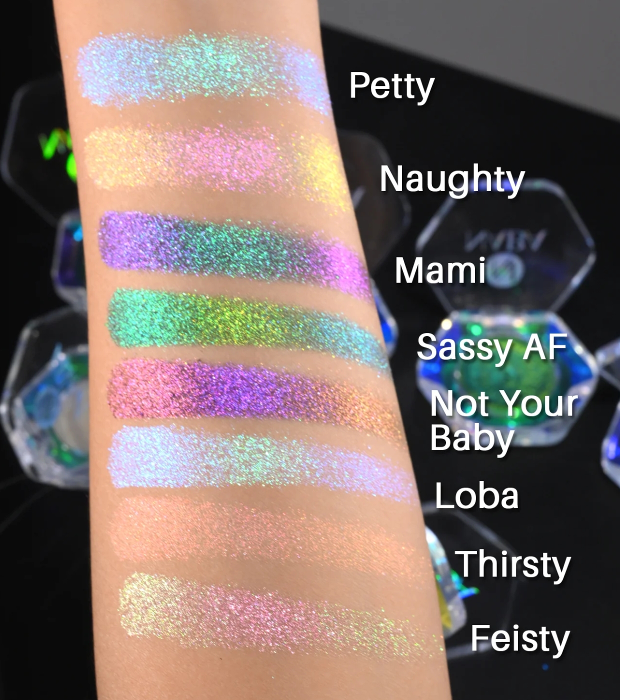 A differenza degli ombretti tradizionali, i pigmenti multicromici Naba Cosmetics sono realizzati con mica sintetica ad alta purezza e tecnologia avanzata di pigmenti multistrato, in grado di riflettere varie tonalità a seconda della luce e dell'angolazione di visione.