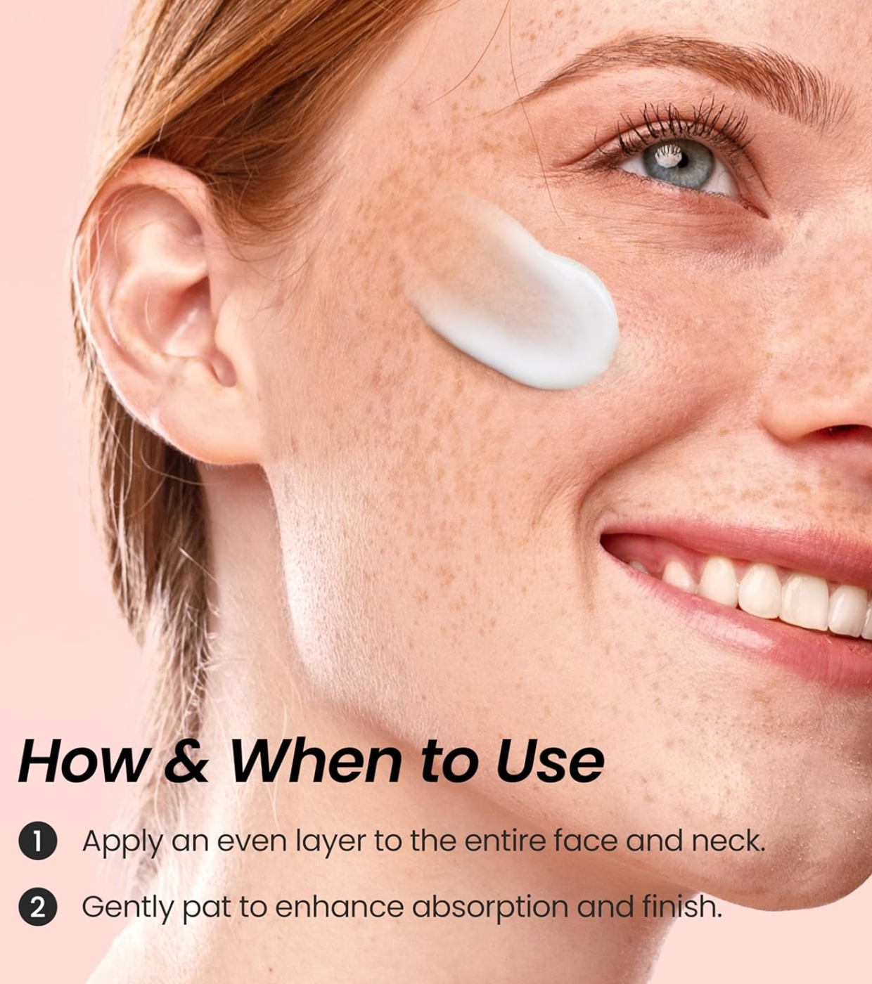 Applicare una quantità moderata su viso e collo. Massaggiare delicatamente fino a completo assorbimento. Può essere utilizzato come parte della routine quotidiana mattina e sera.