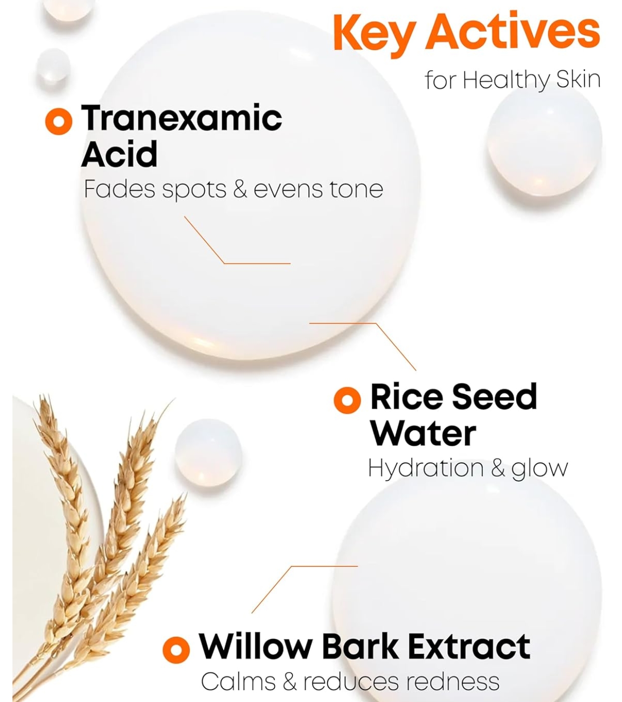 La sua formula combina il 72,4% di acqua di semi di riso (Oryza sativa), ricca di nutrienti, con acido tranexamico, un potente principio attivo che aiuta a schiarire le macchie solari, le cicatrici da acne, il melasma e l'iperpigmentazione post-infiammatoria.